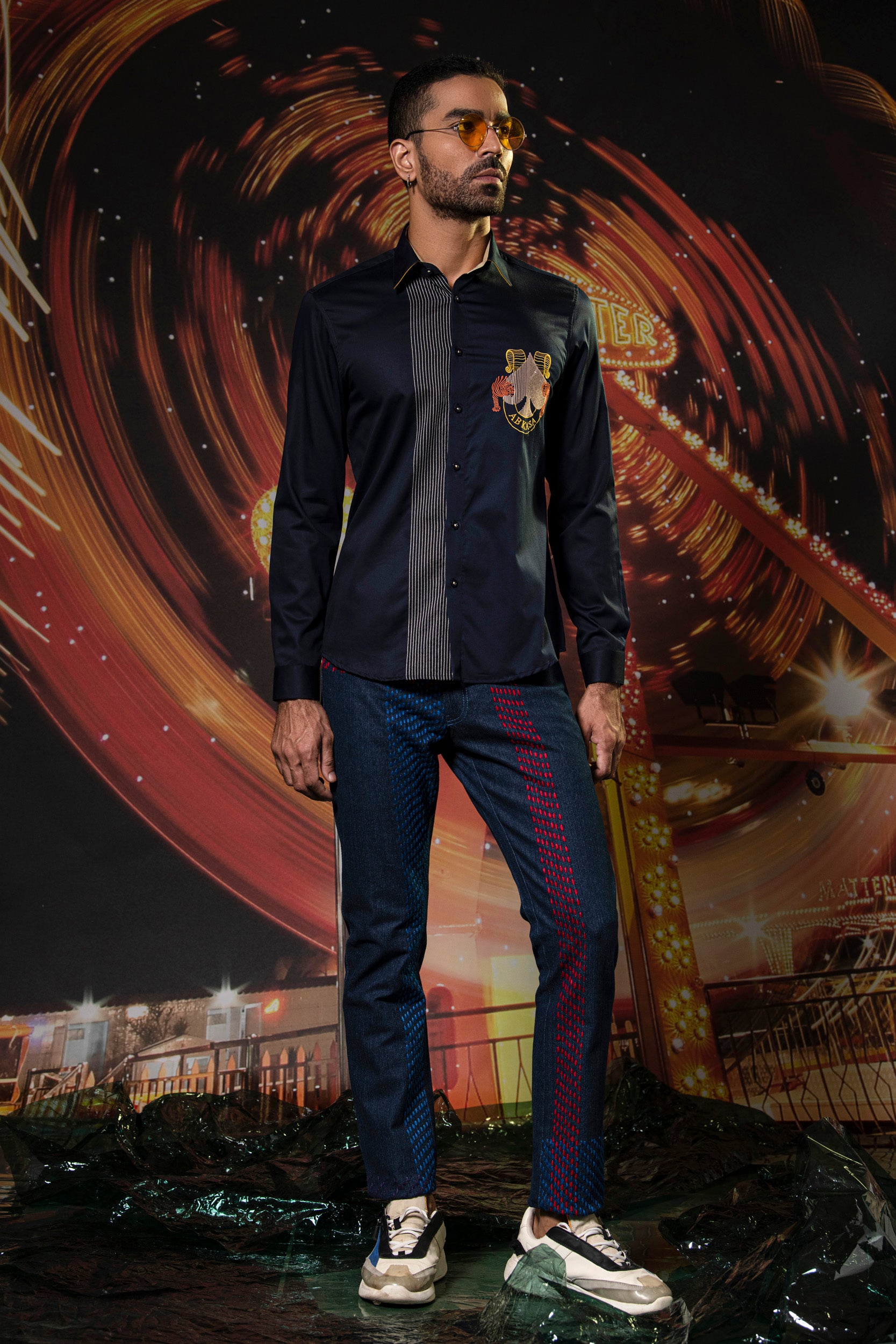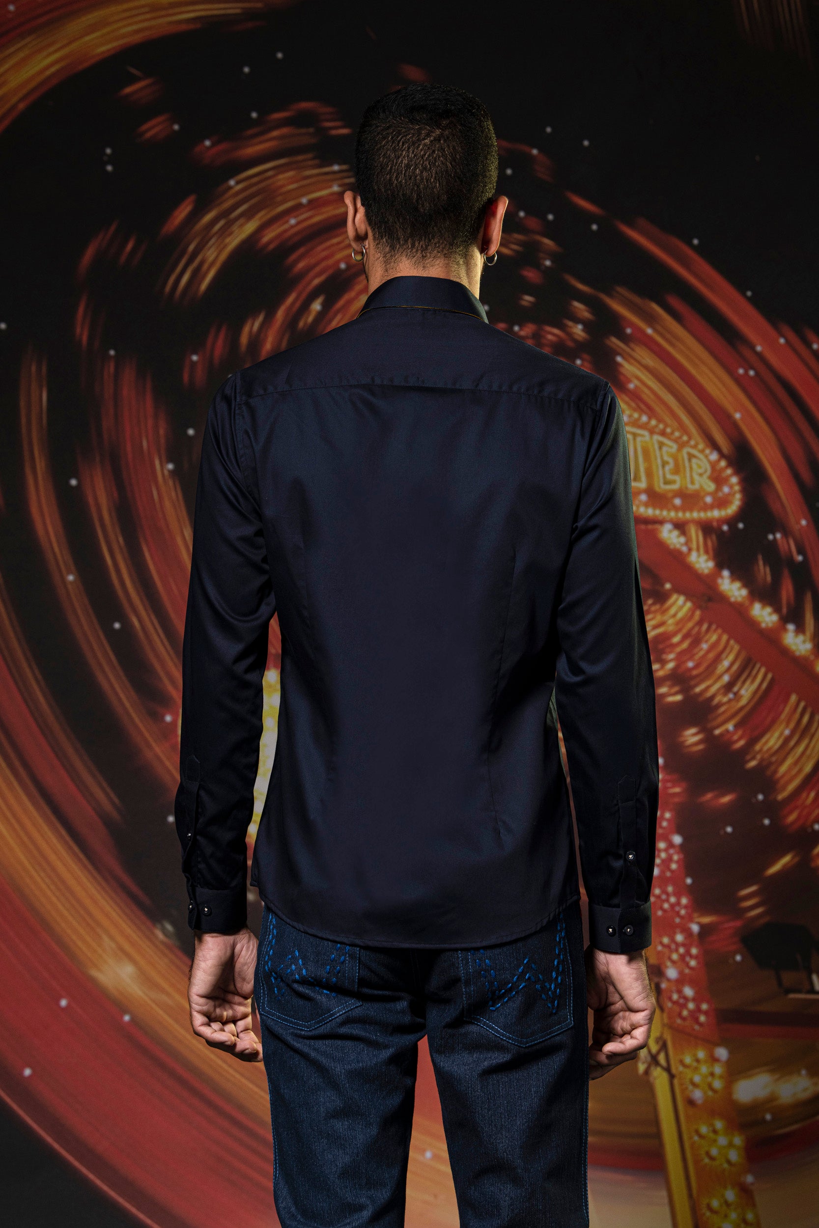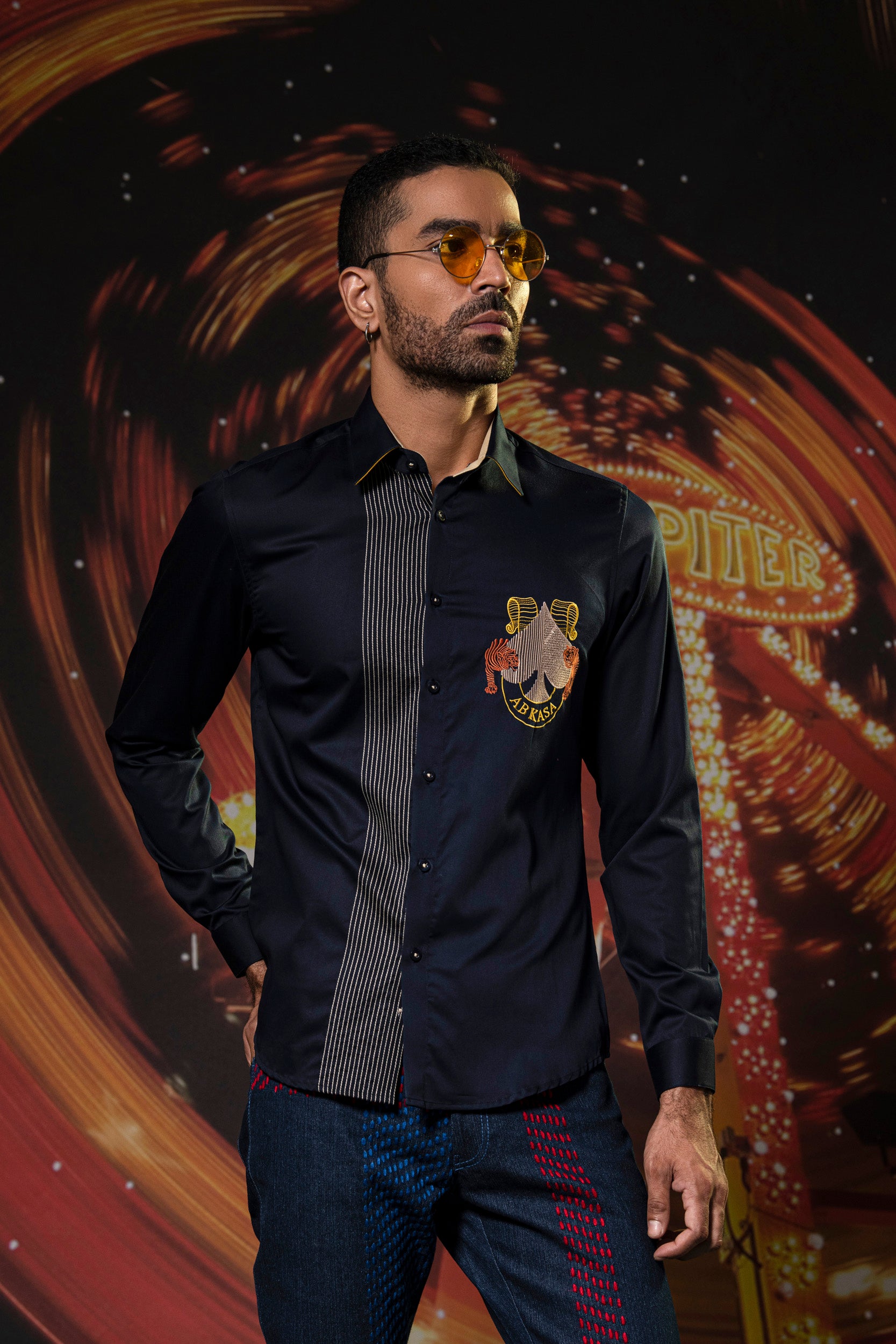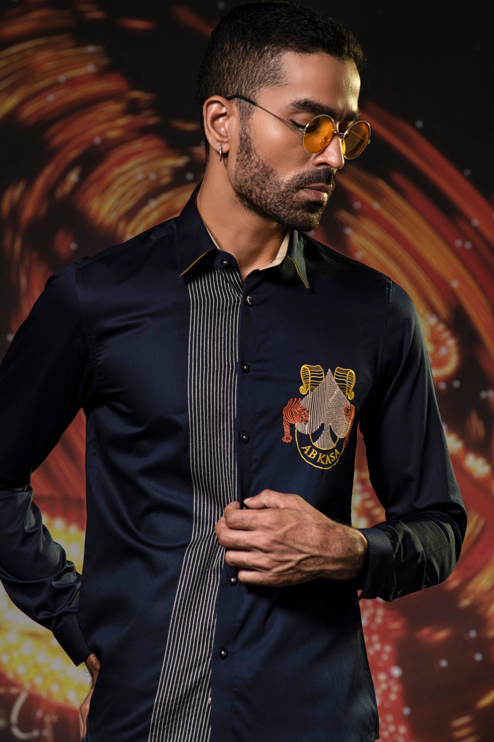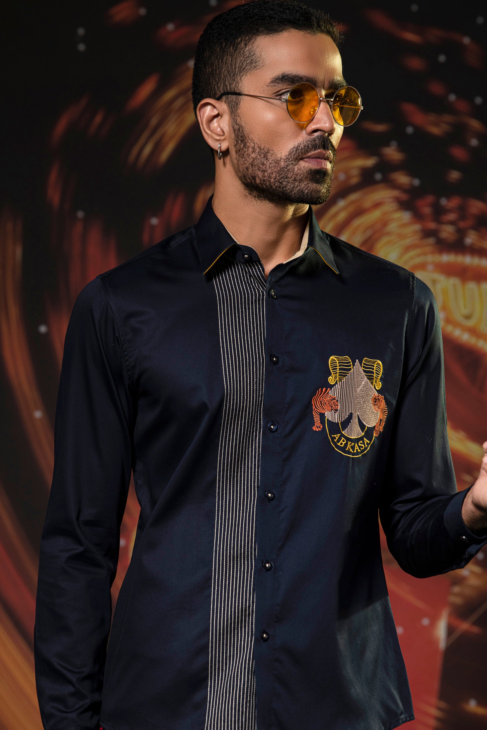Featuring a navy blue shirt in cotton base with beige stitch-line embroidery. Perfect wear for parties and cocktail ceremonies.