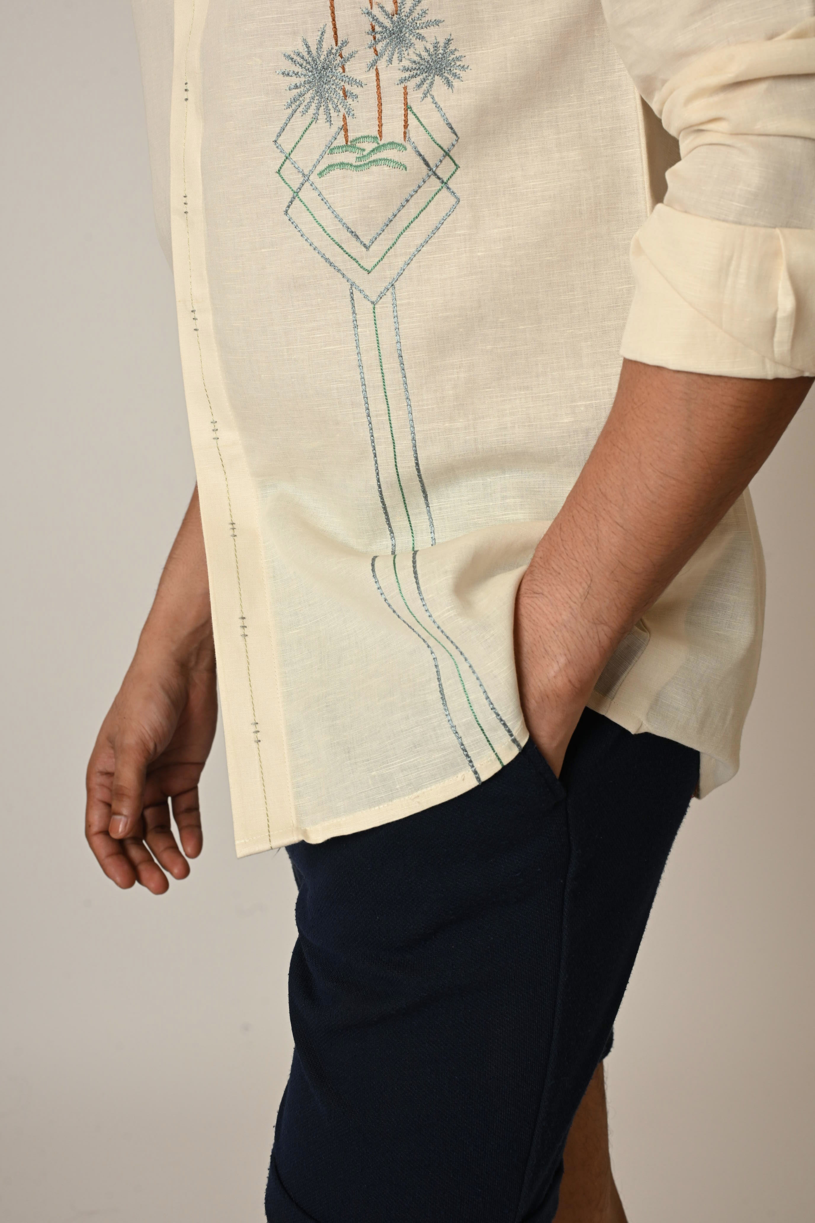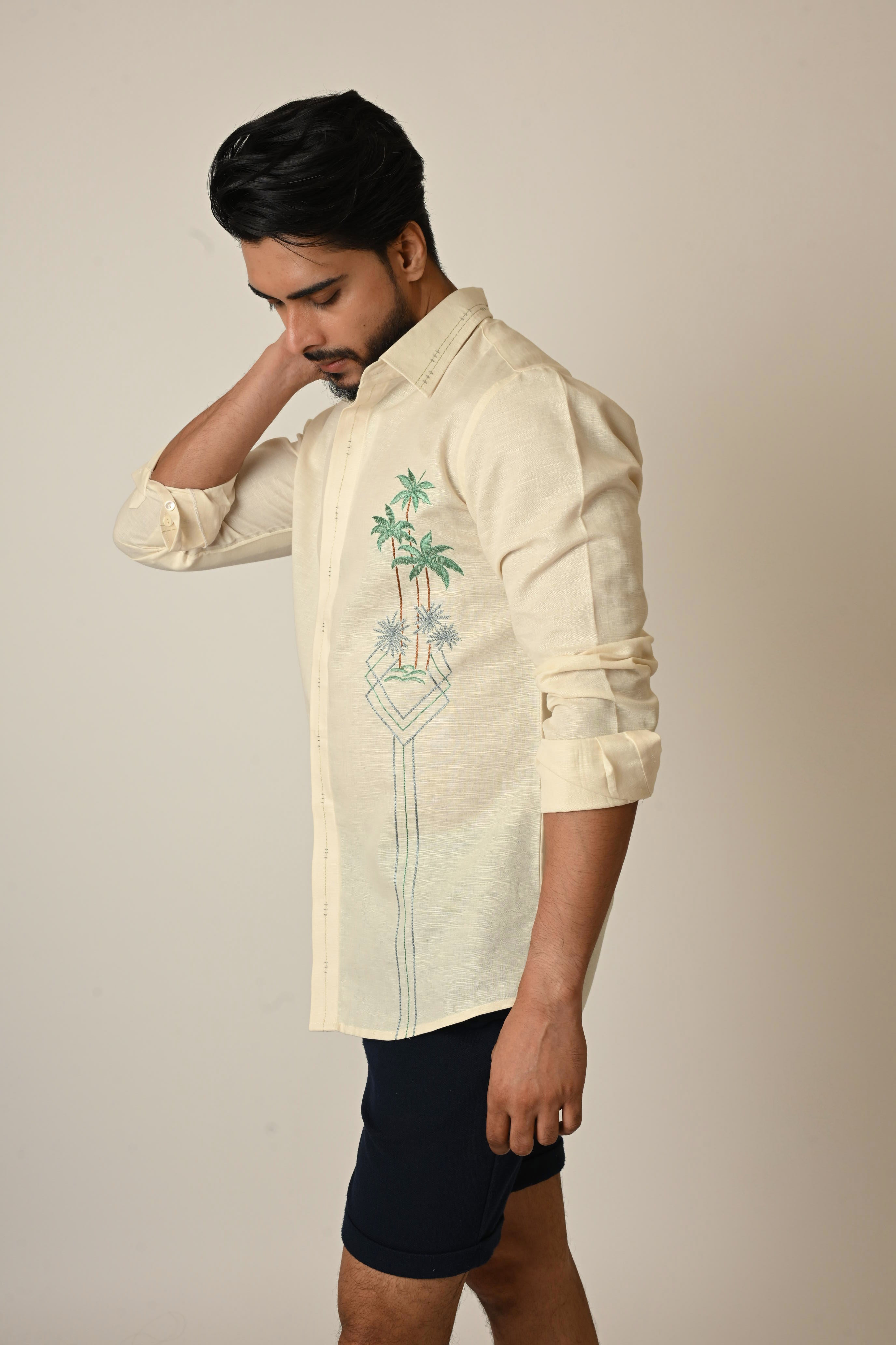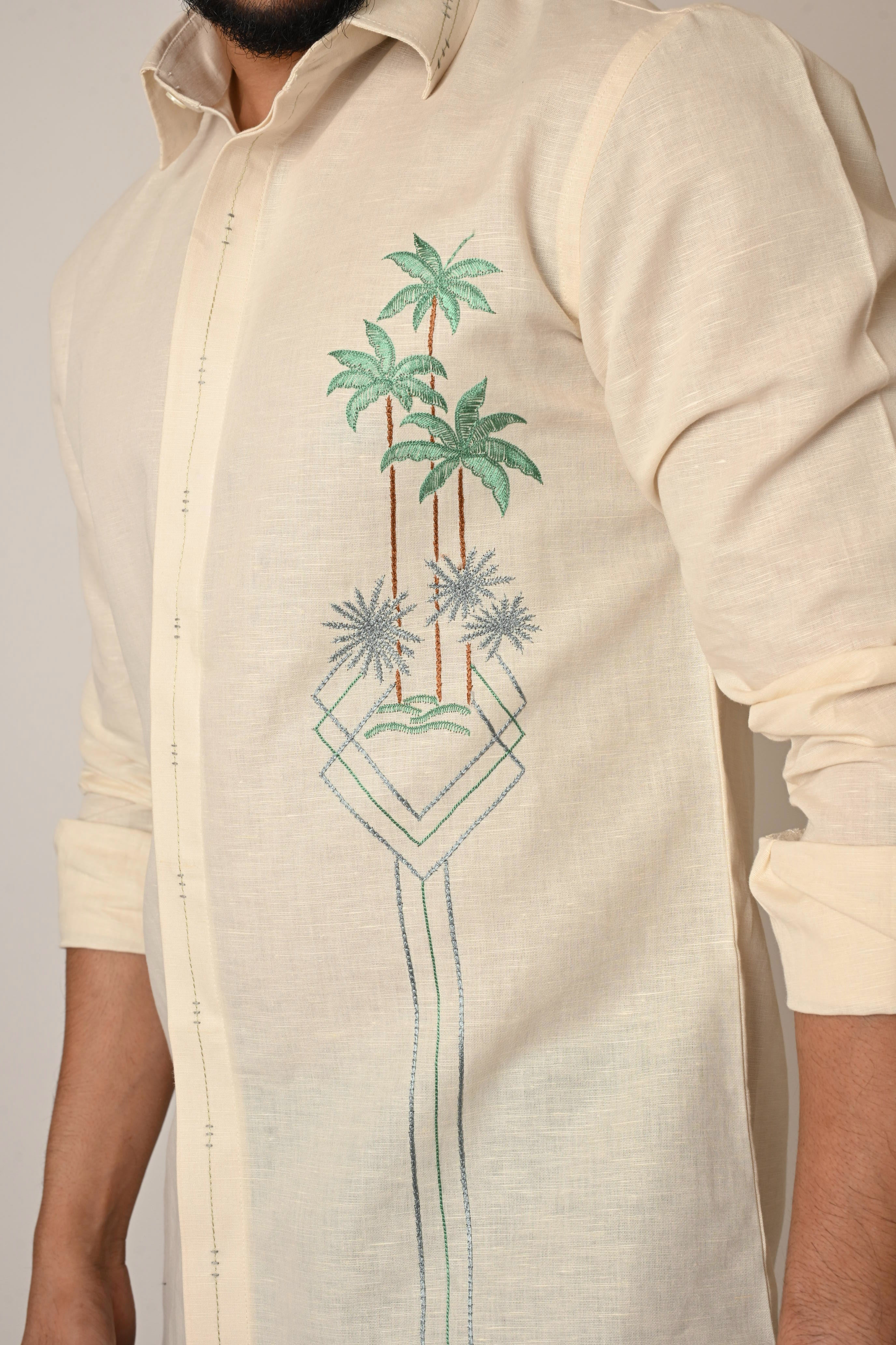 | A cream pure linen shirt with threadwork embroidery depicting a palm tree with detailing on the collar, cuff and the back of the shirt |