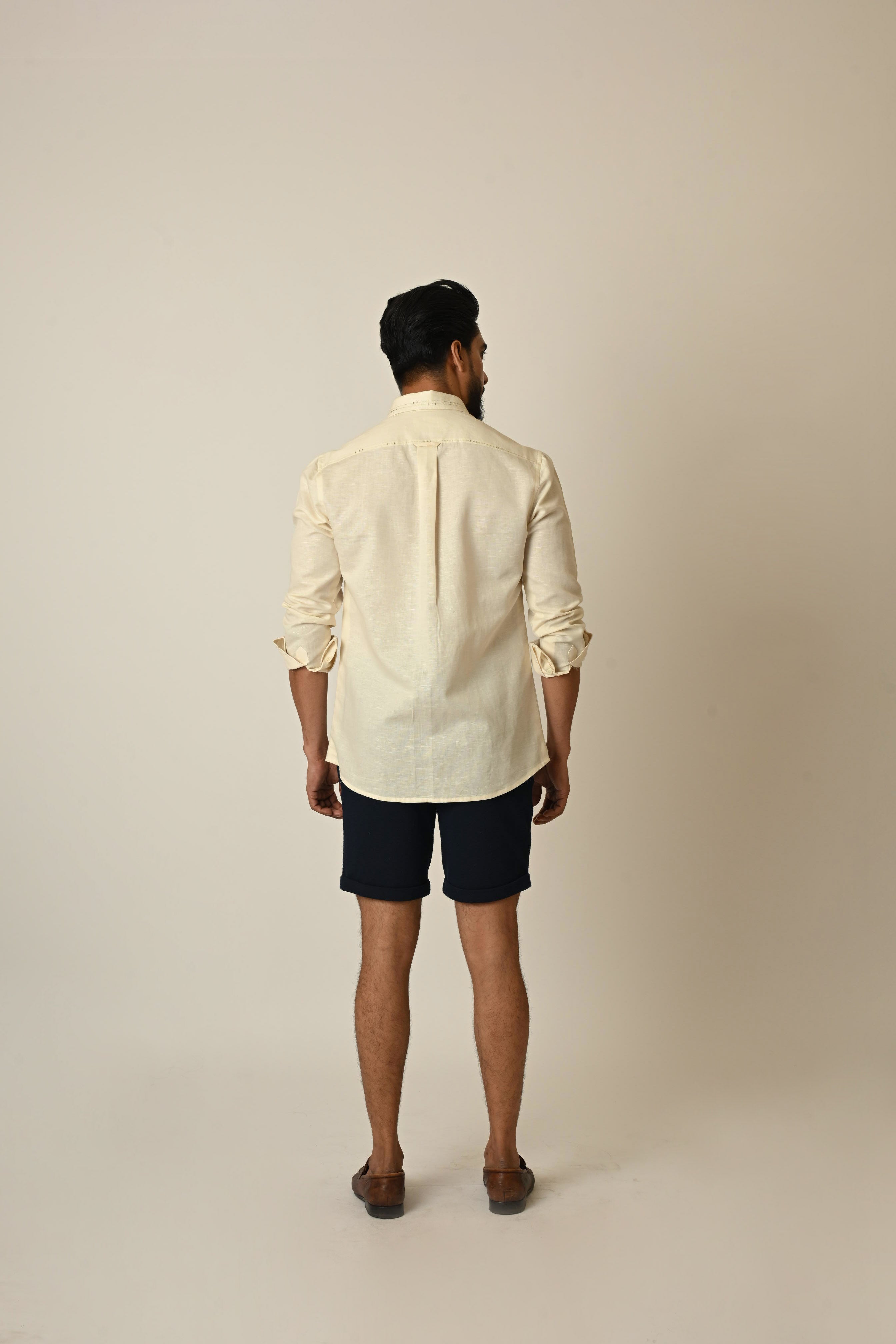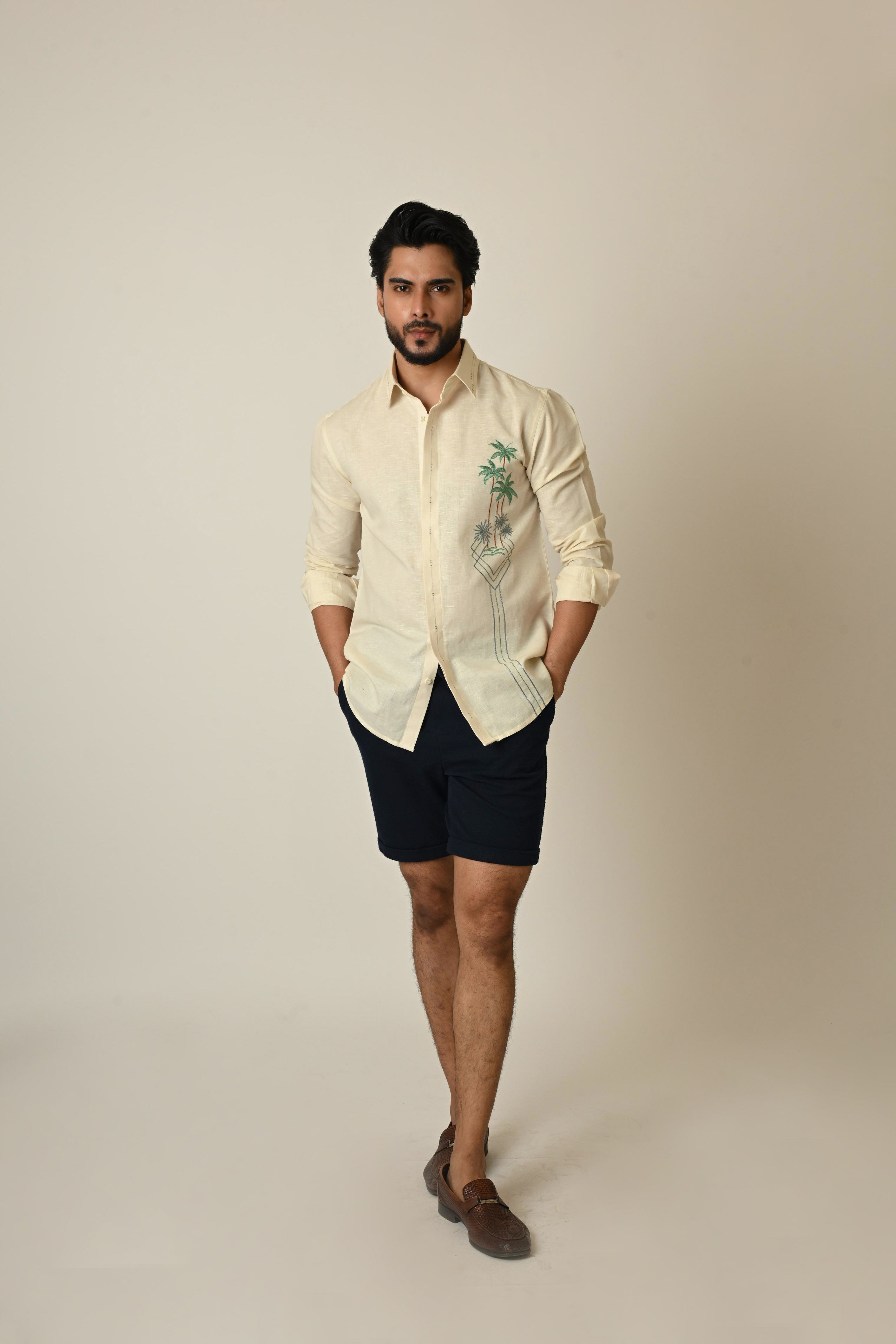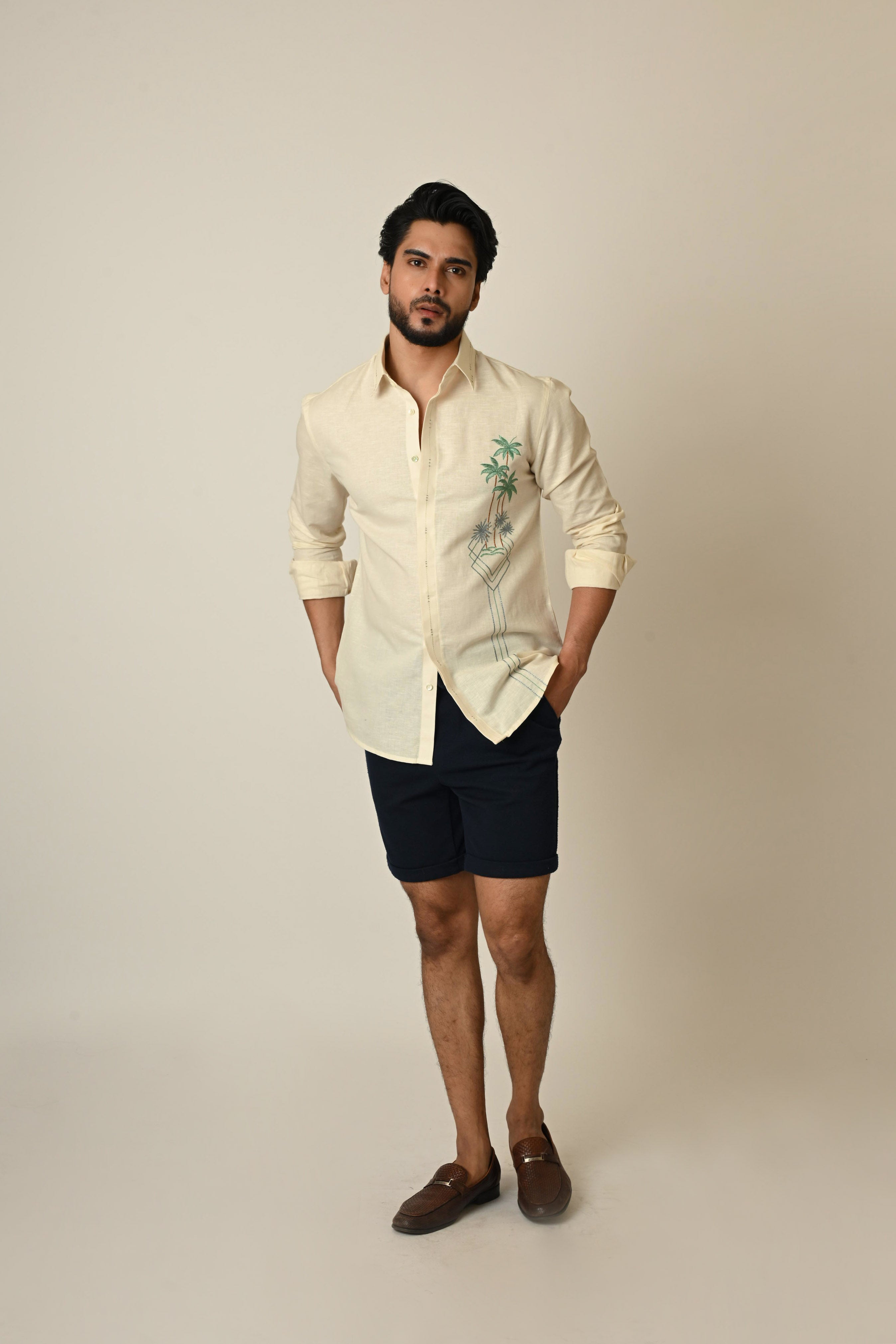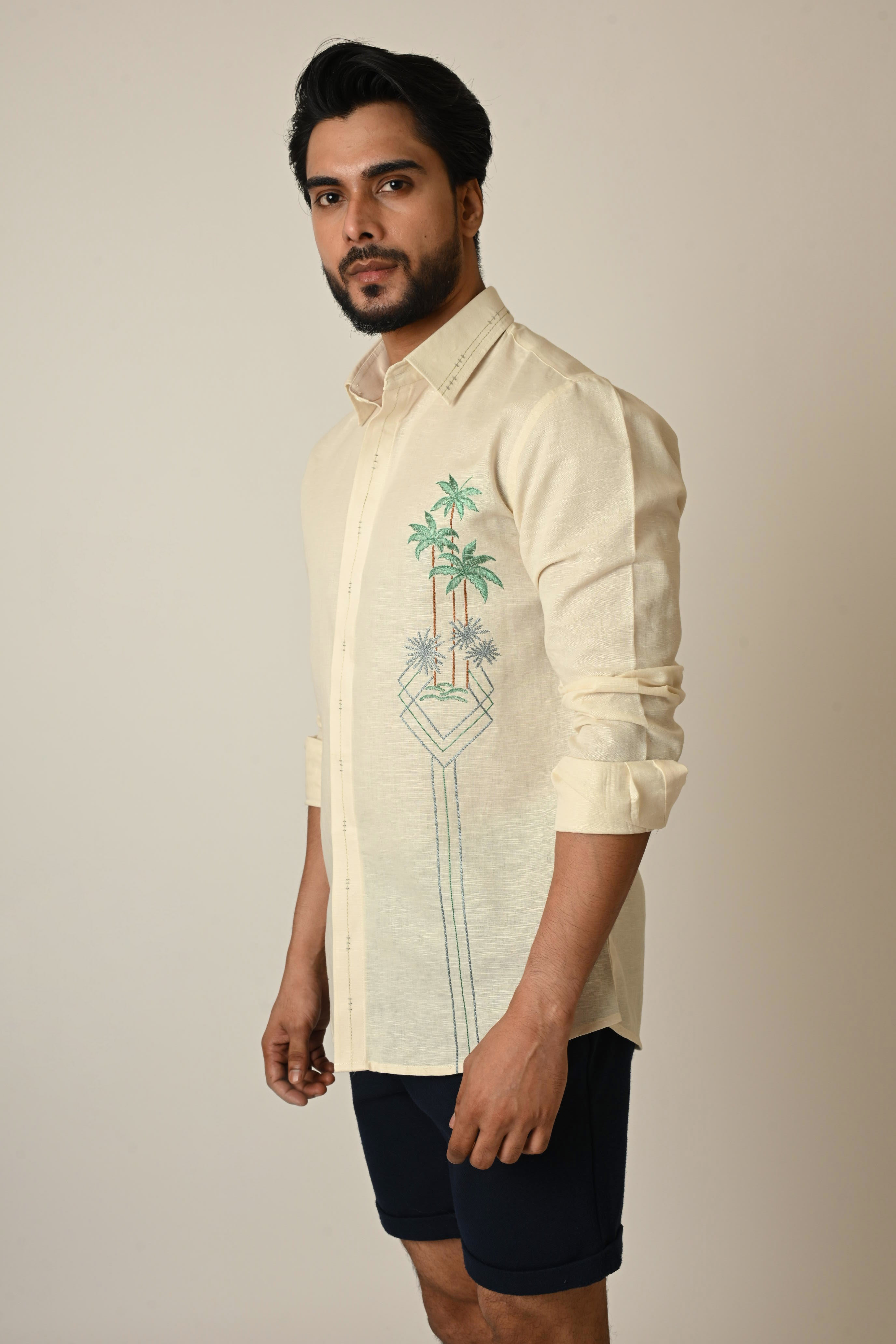 | A cream pure linen shirt with threadwork embroidery depicting a palm tree with detailing on the collar, cuff and the back of the shirt |