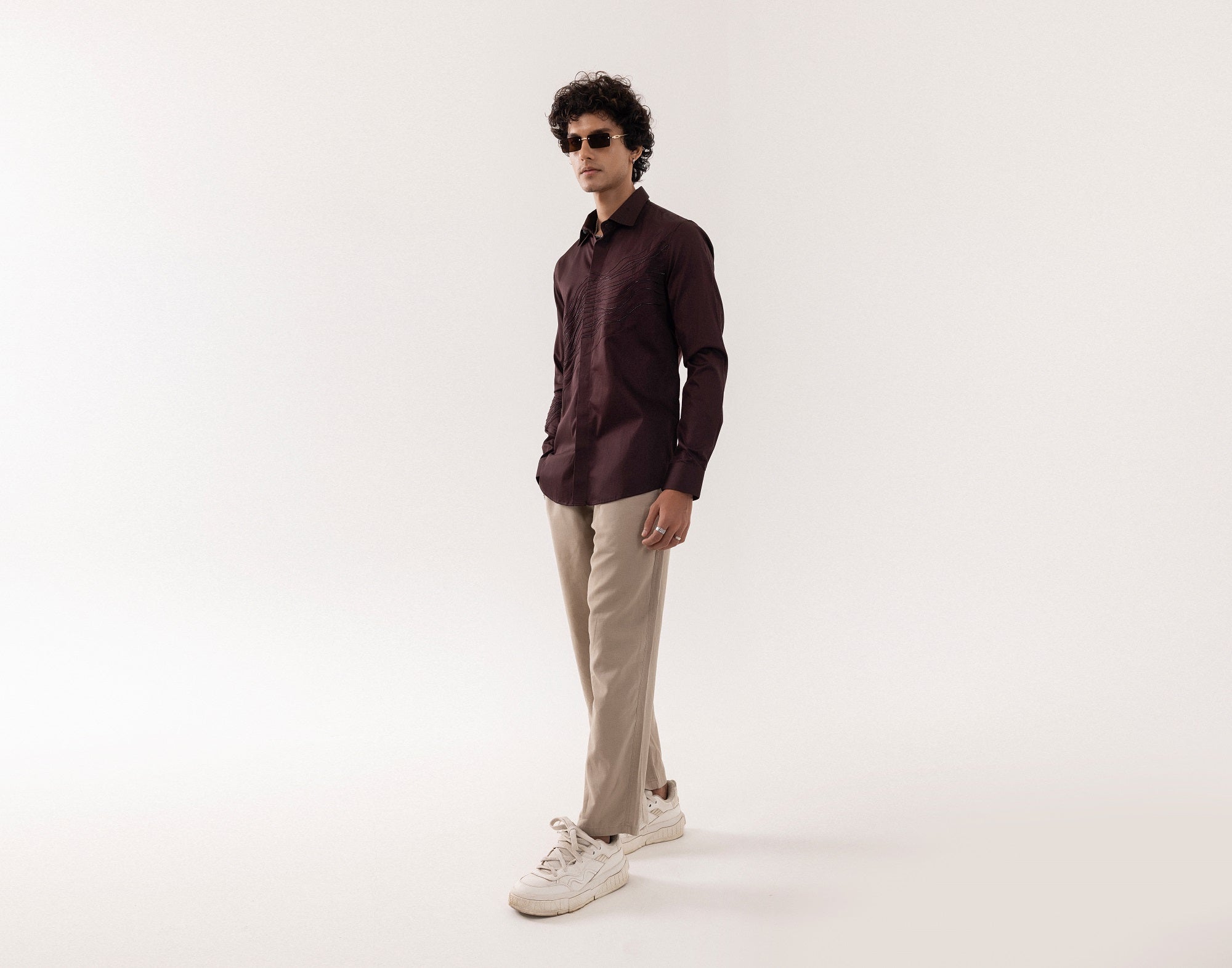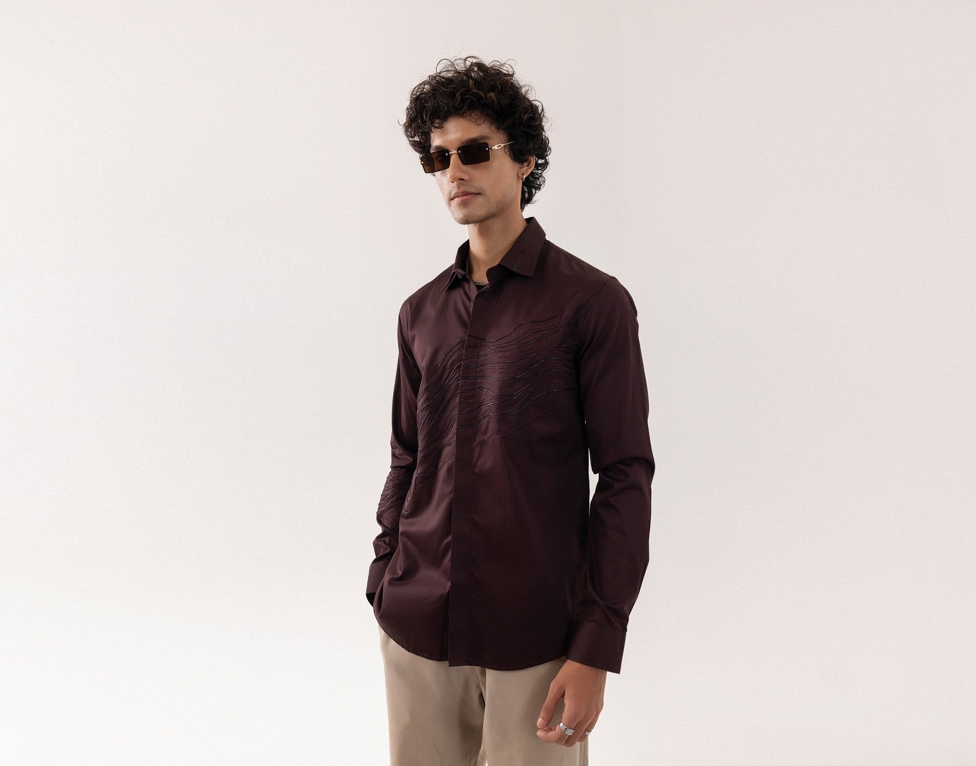 A brown shirt in giza cotton embroidered using  leather cords with tone on tone resham depicting an abstract flow pattern which is continued on the sleeves with details on the cuff and the collar and back as well.