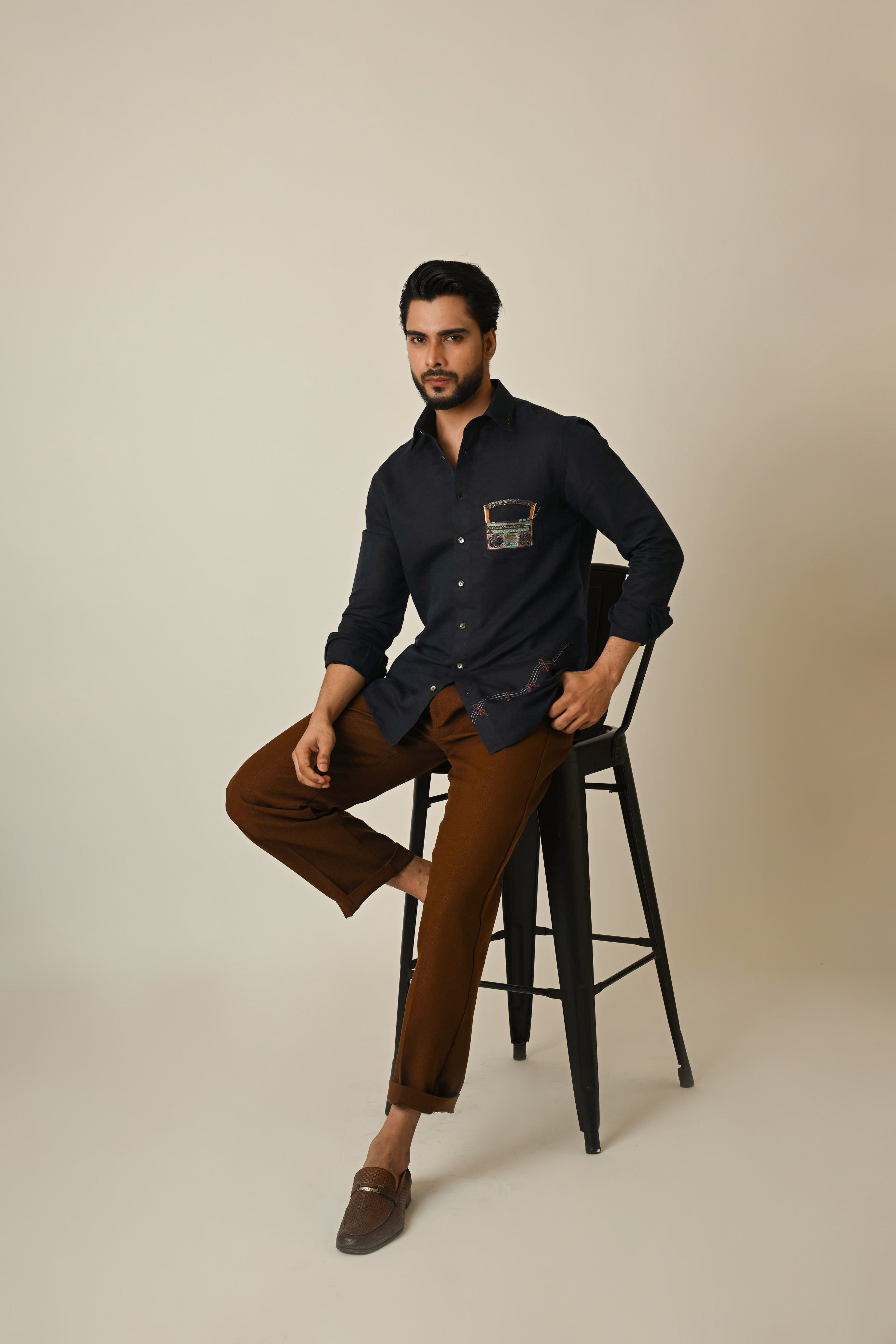 | A midnight blue full sleeved shirt with intricate threadwork depicting a classic radio on the chest pocket and some qwirky motifs on the back with detailings on the collar and cuff |