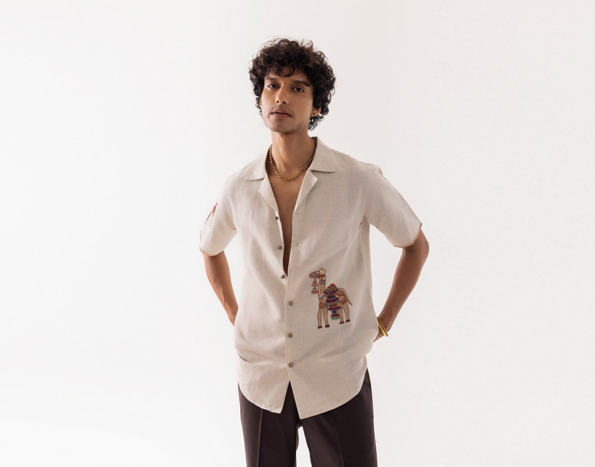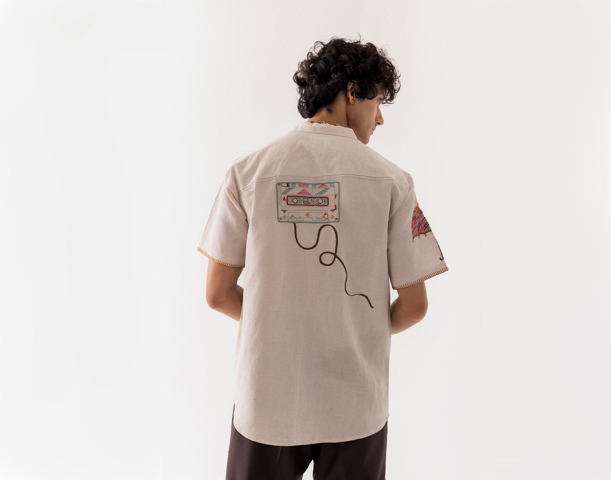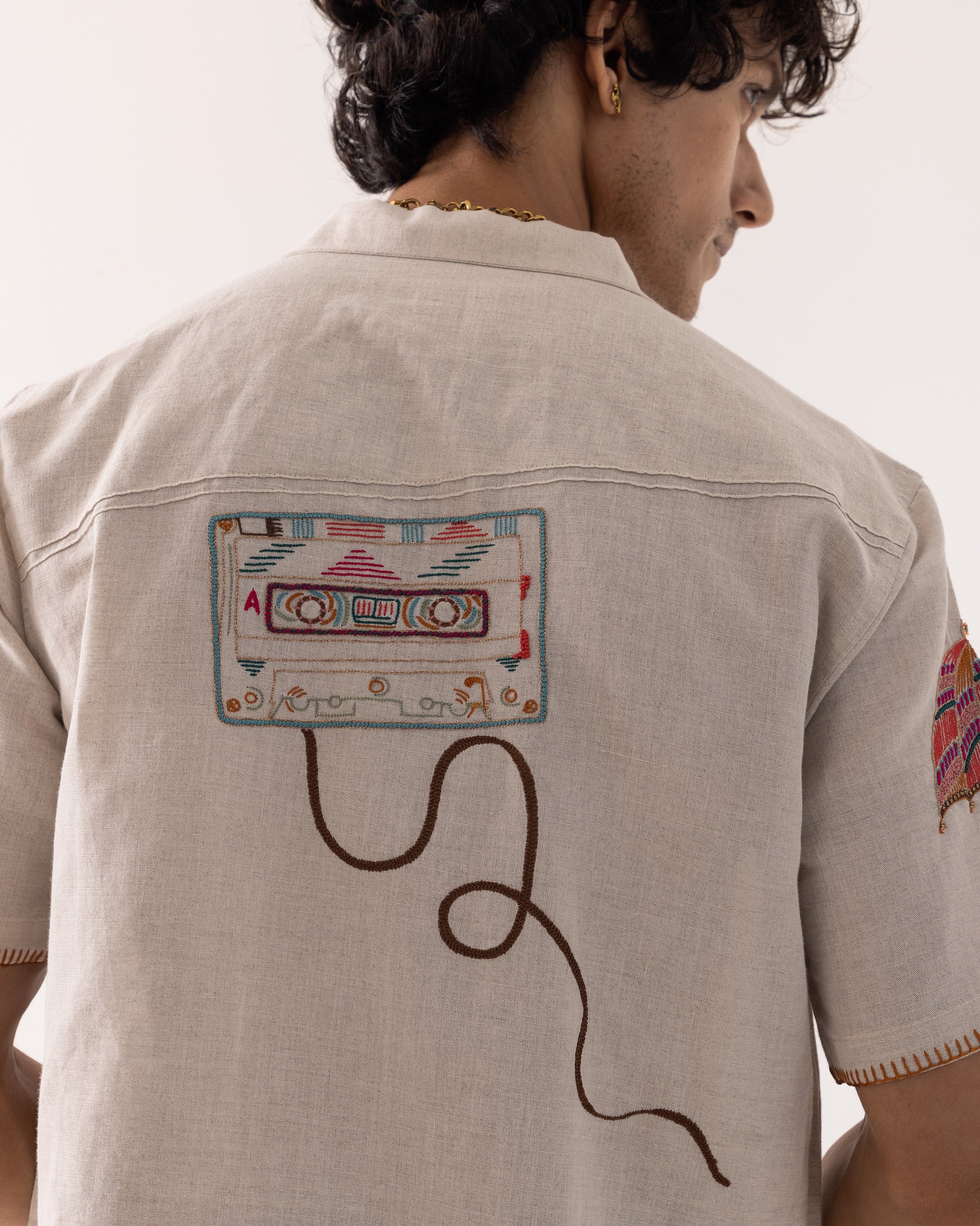 A beige half sleeved shirt with cuban collar in pure linen combines vibrant Rajasthani artistry with modern motifs. The features a detailed camel design , embroidered using traditional satin , kantha stitches for texture. The sleeve is adorned with an umbrella in bold contrasting colours, and on the back is a cassette incorporating the use of beads for an eye-catching effect.