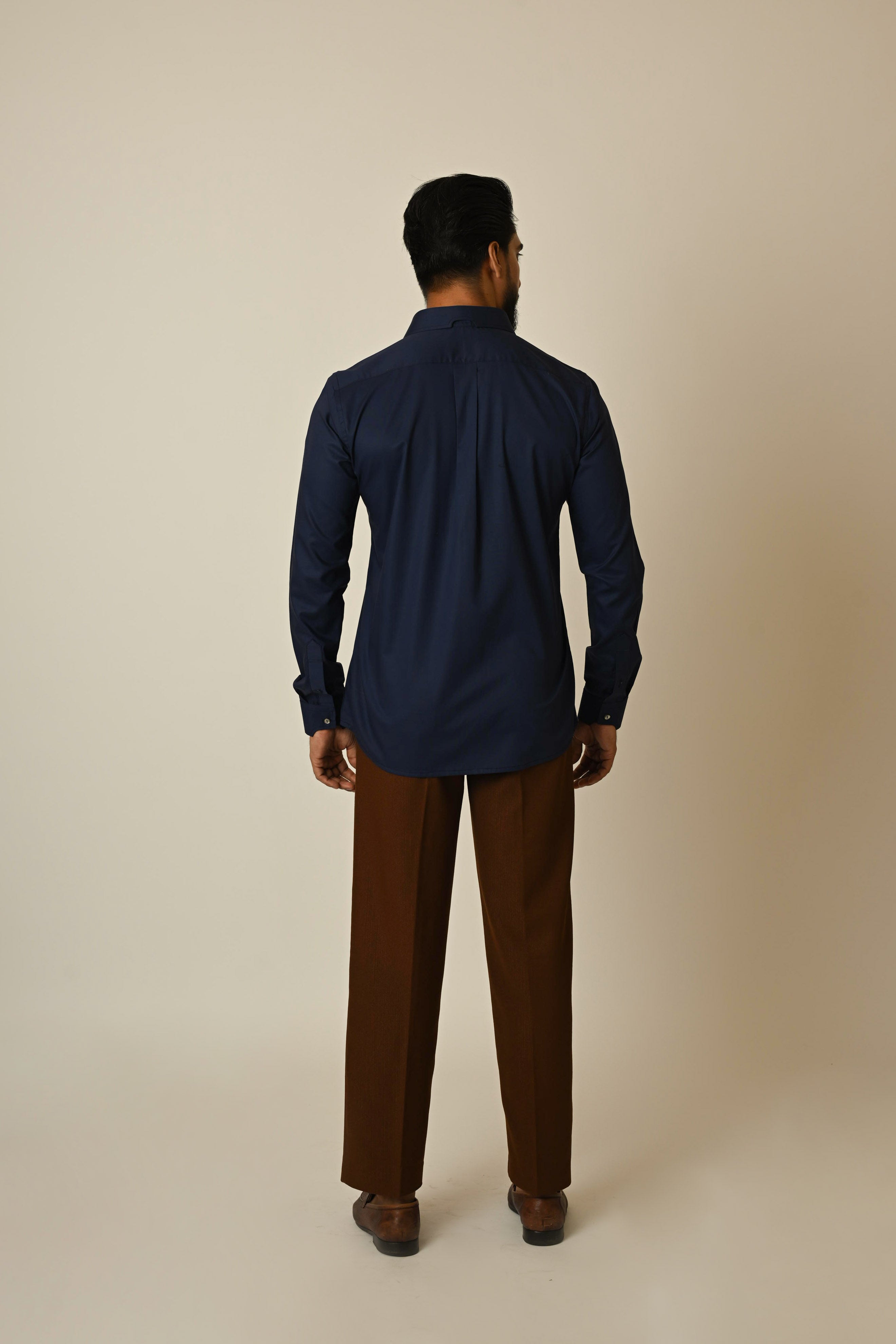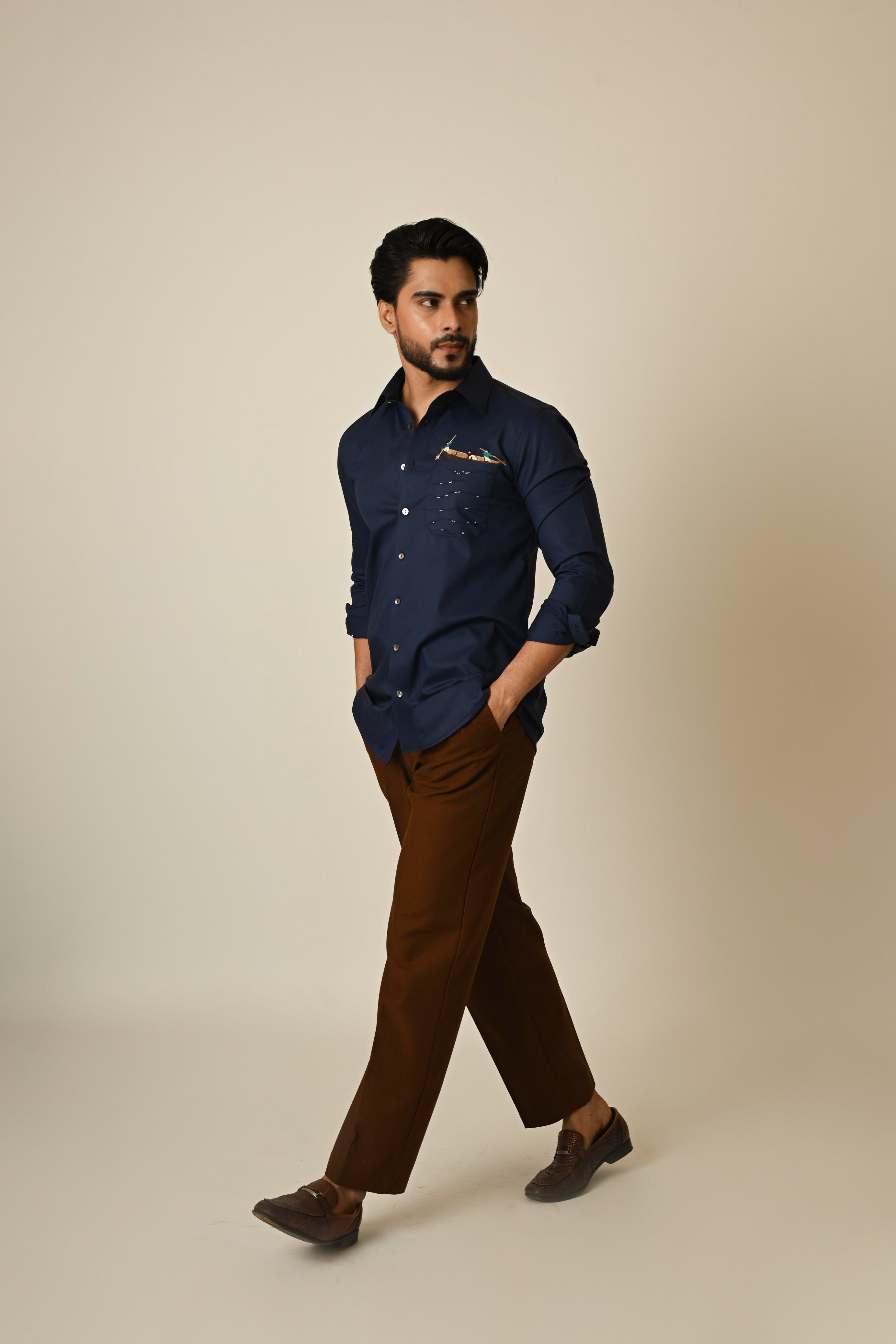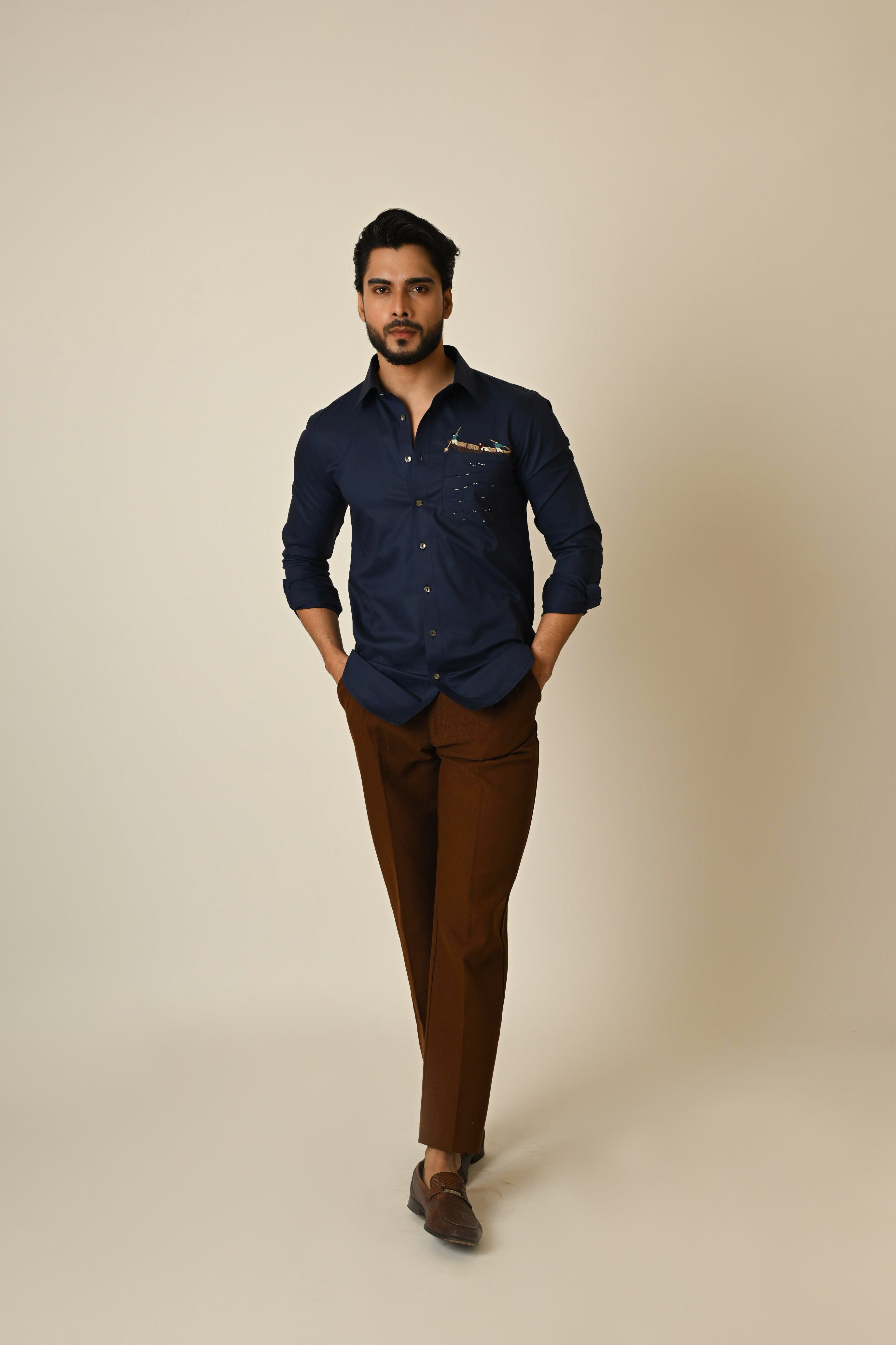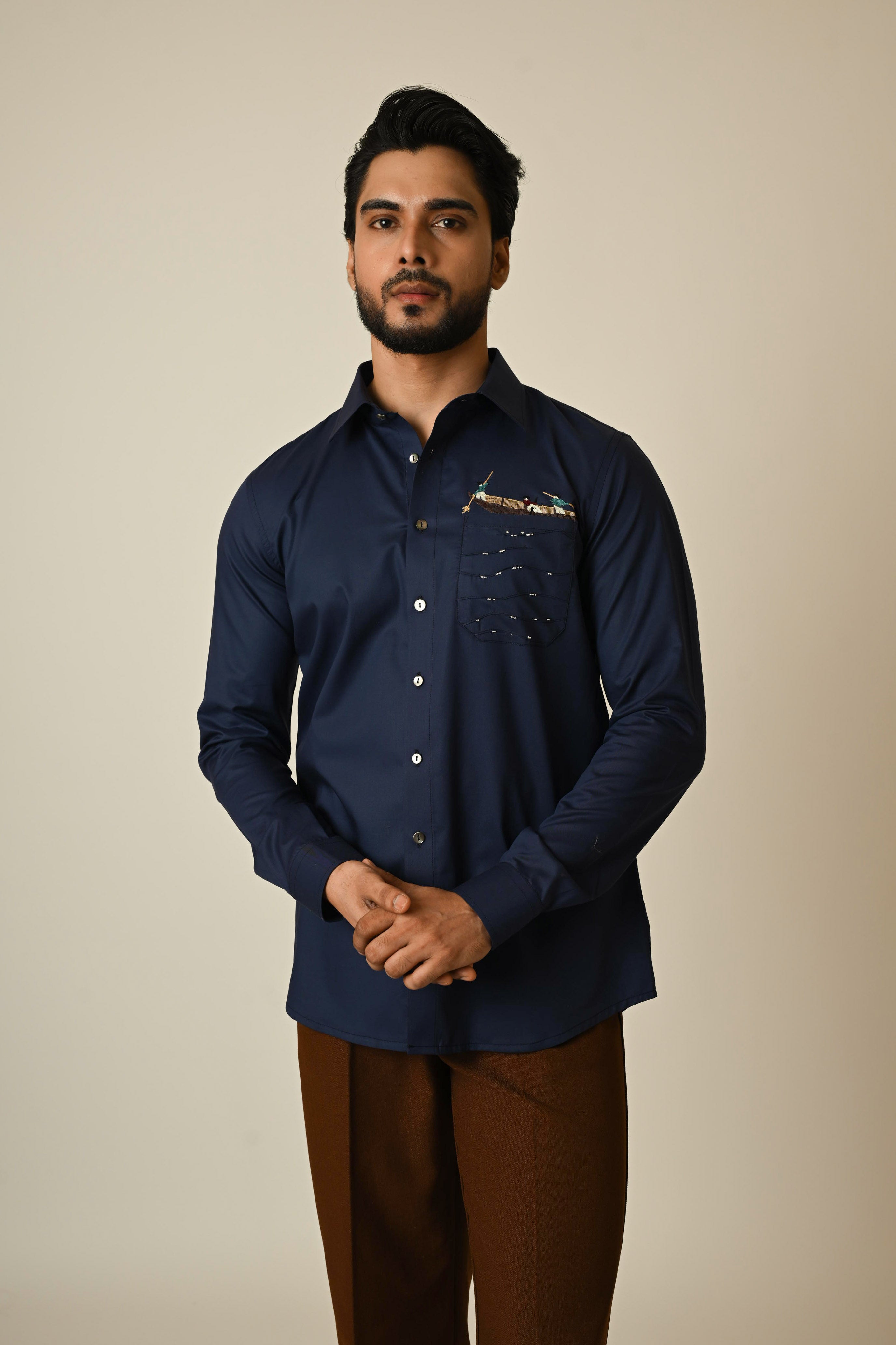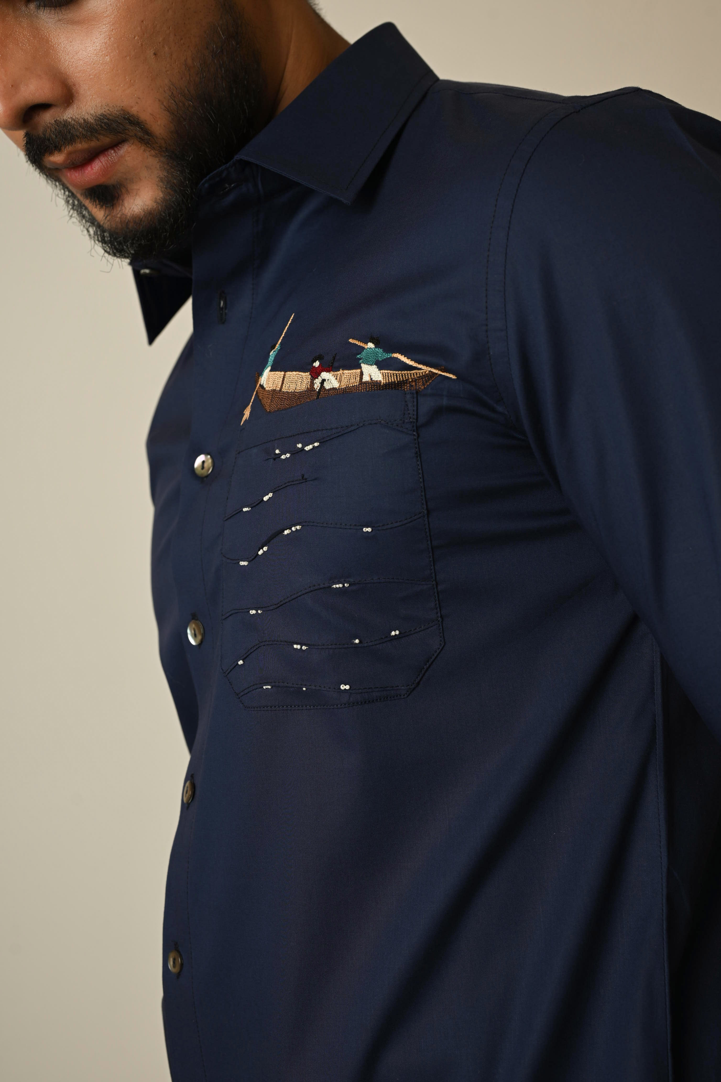 A navy shirt with chest motif depicting poeple rowing on a boat with pintuck detailed pocket