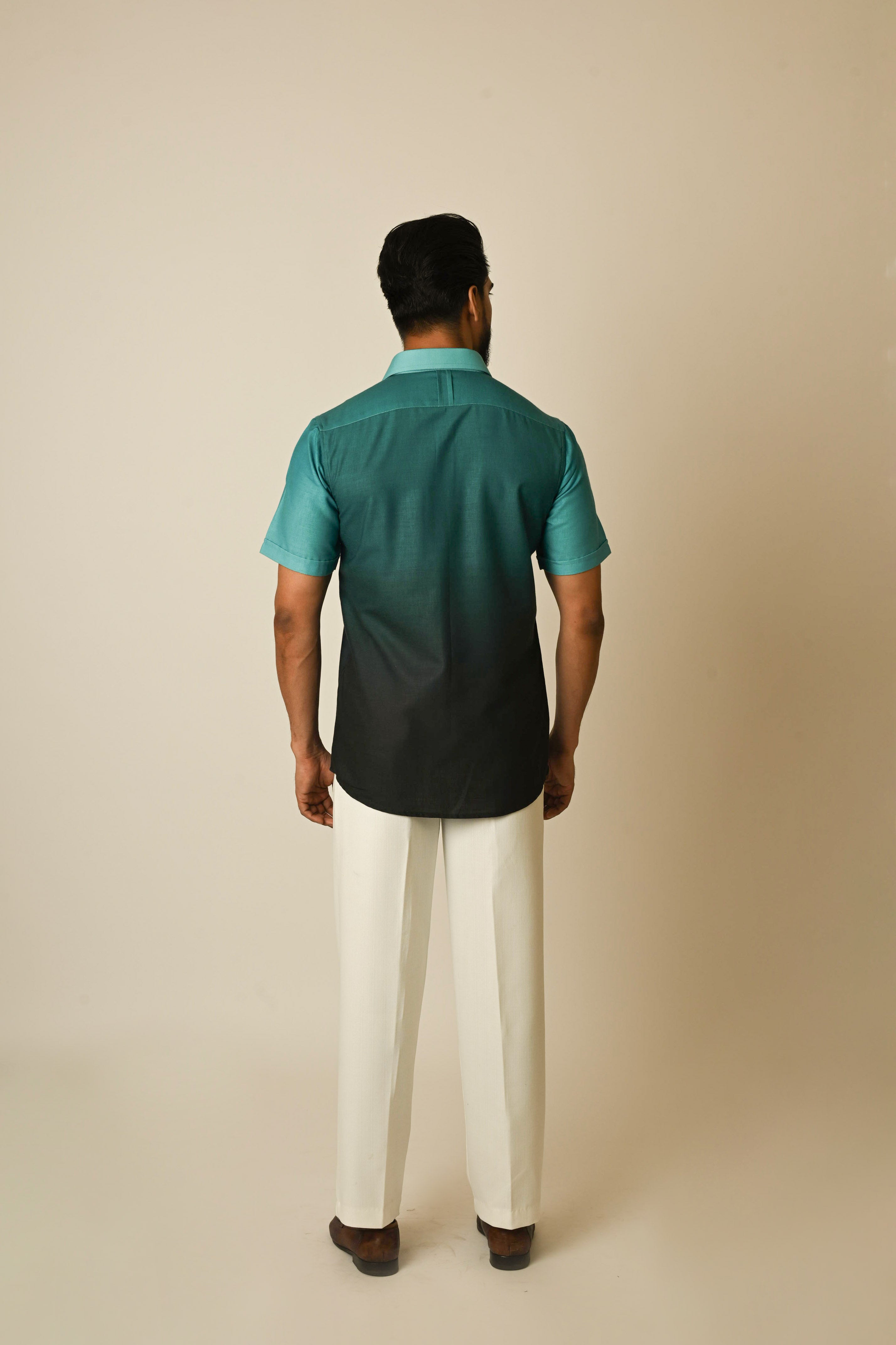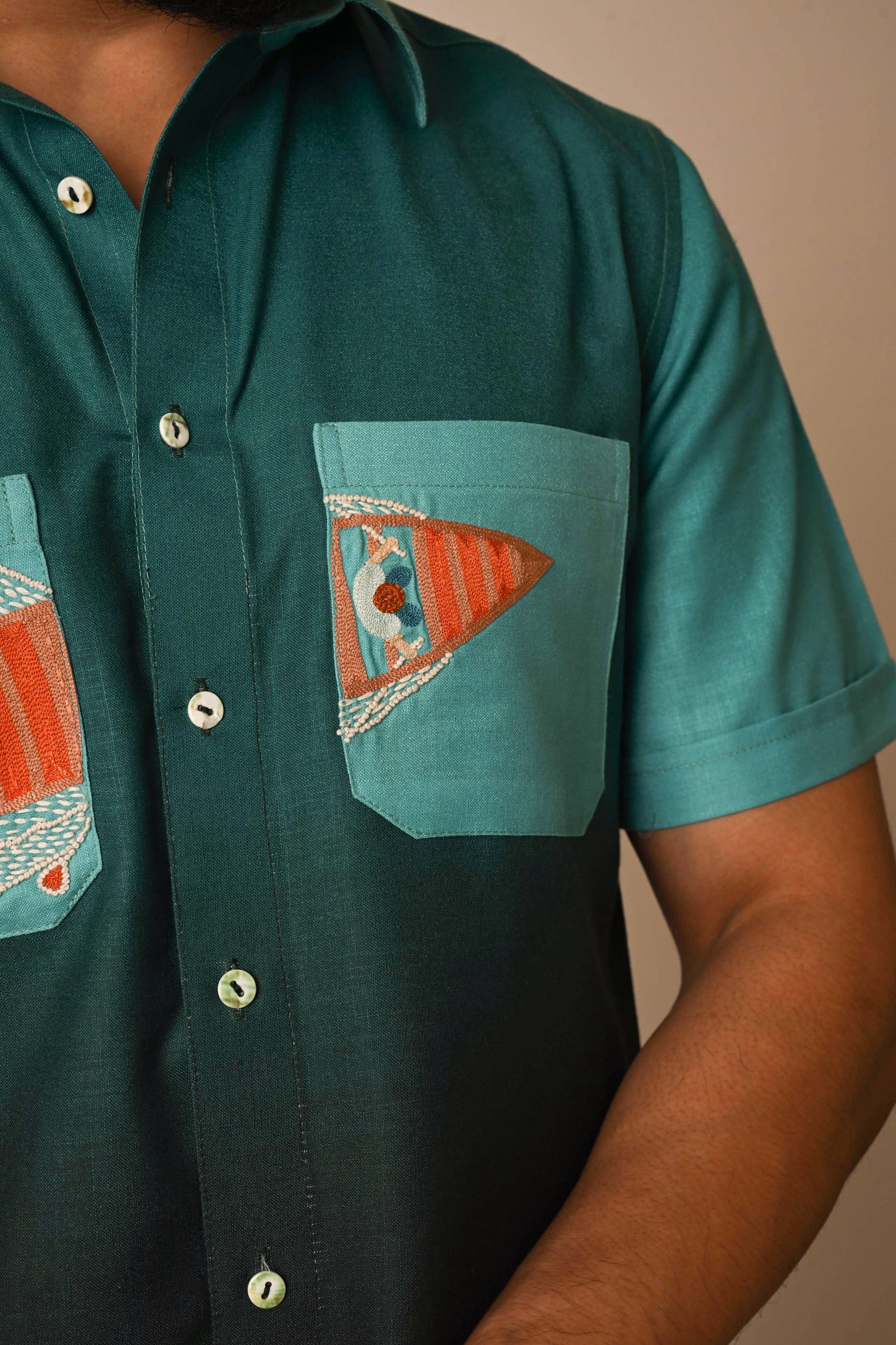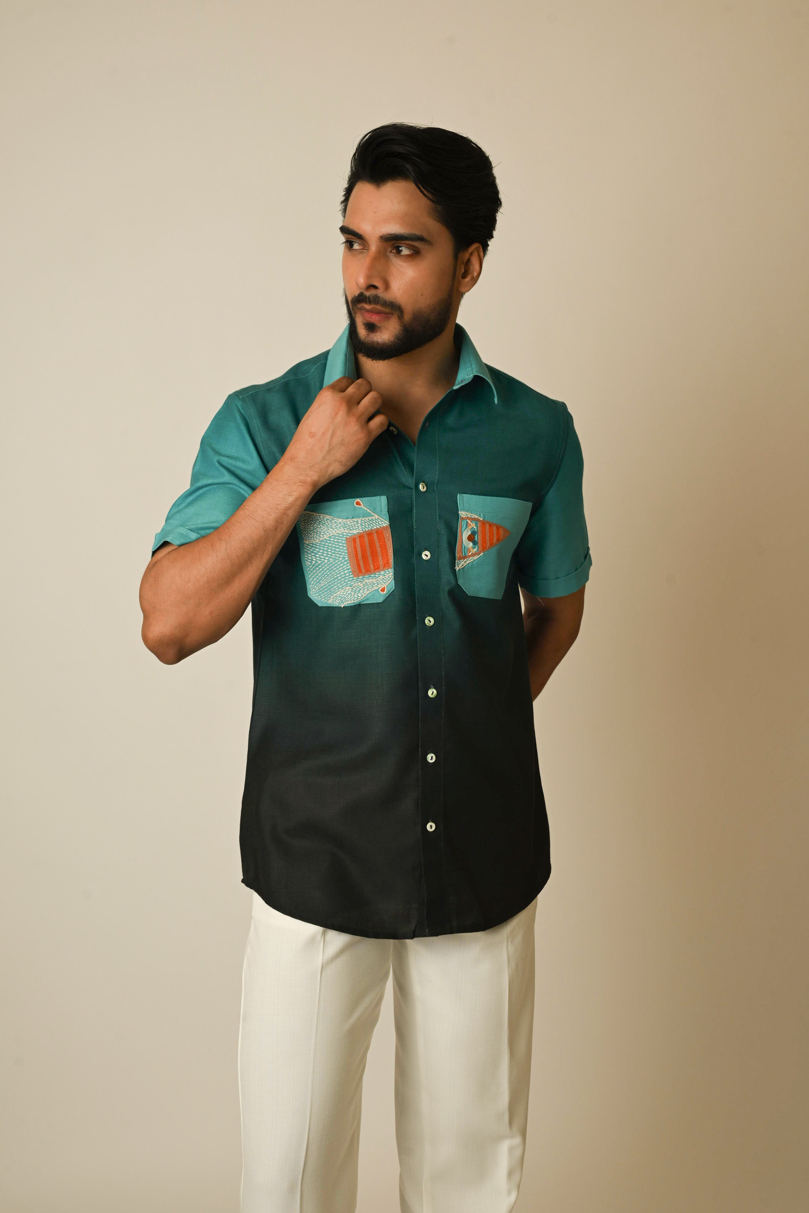 a shaded teal to dark teal textured linen shirt with pocket detail depicting a scenery in a two frame design