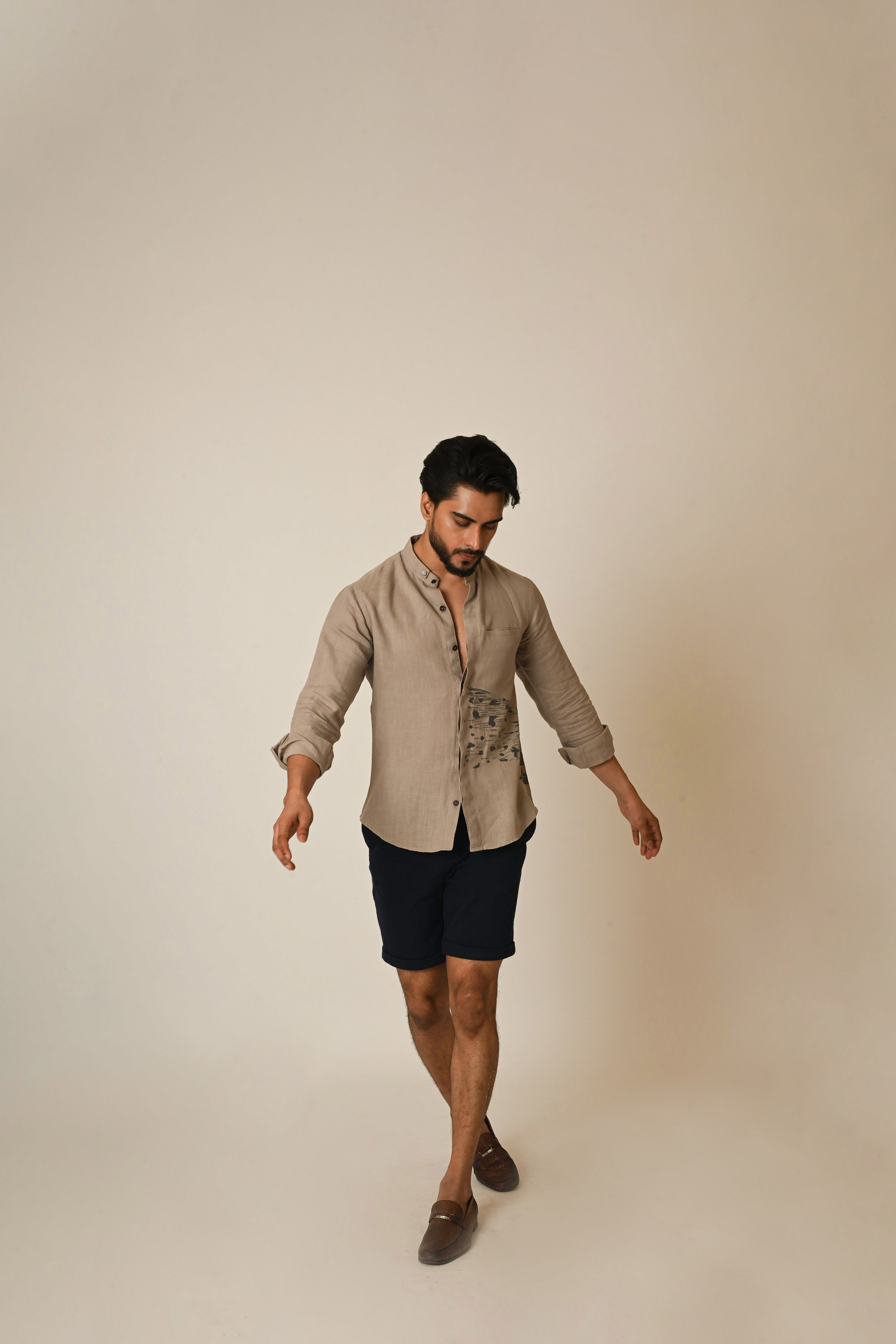 A sand linen shirt with threadwork embroidery in a splash pattern