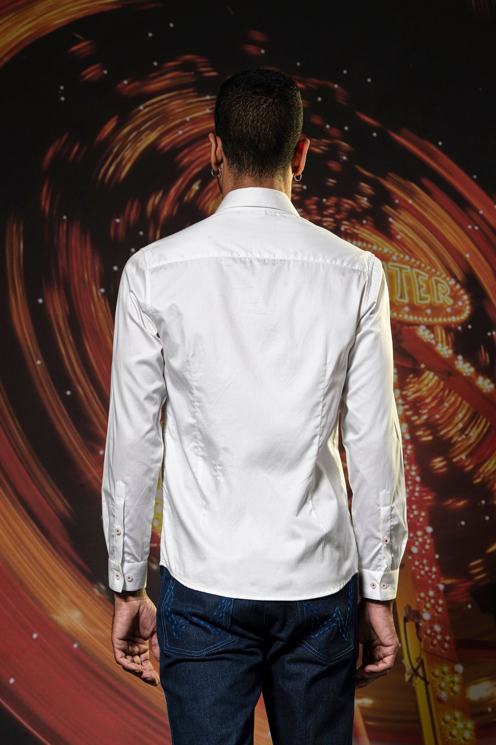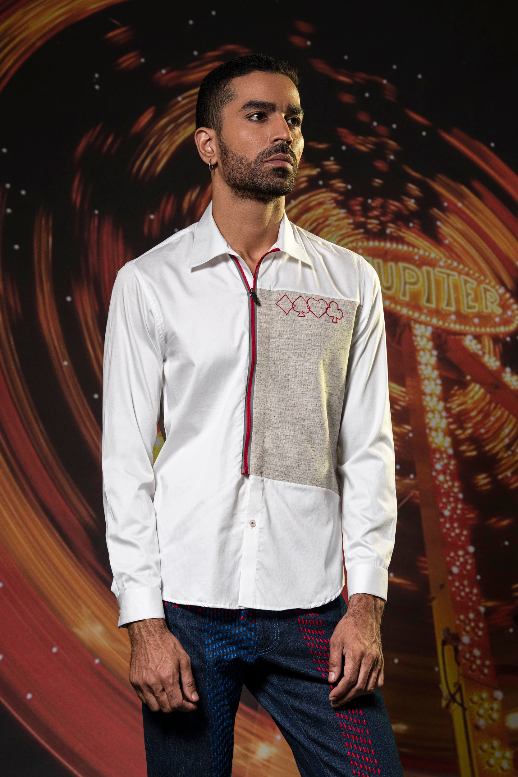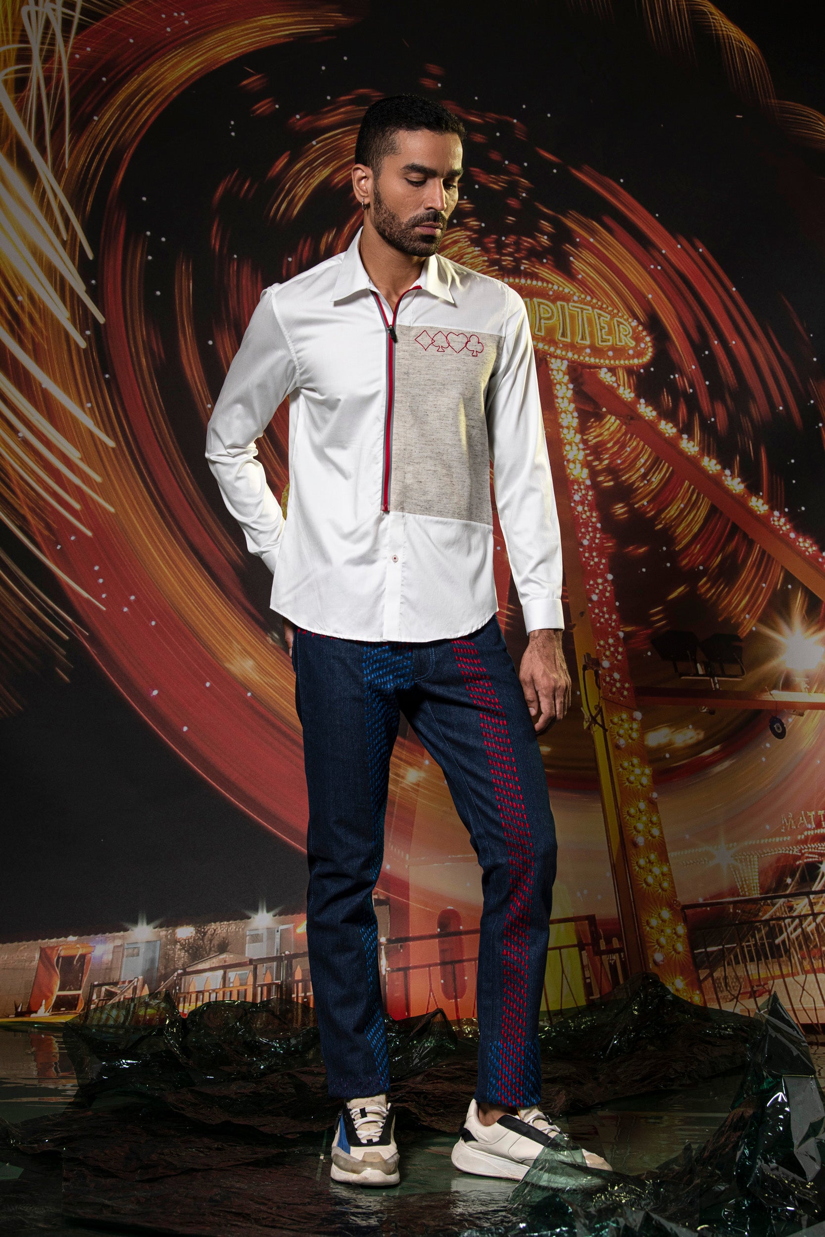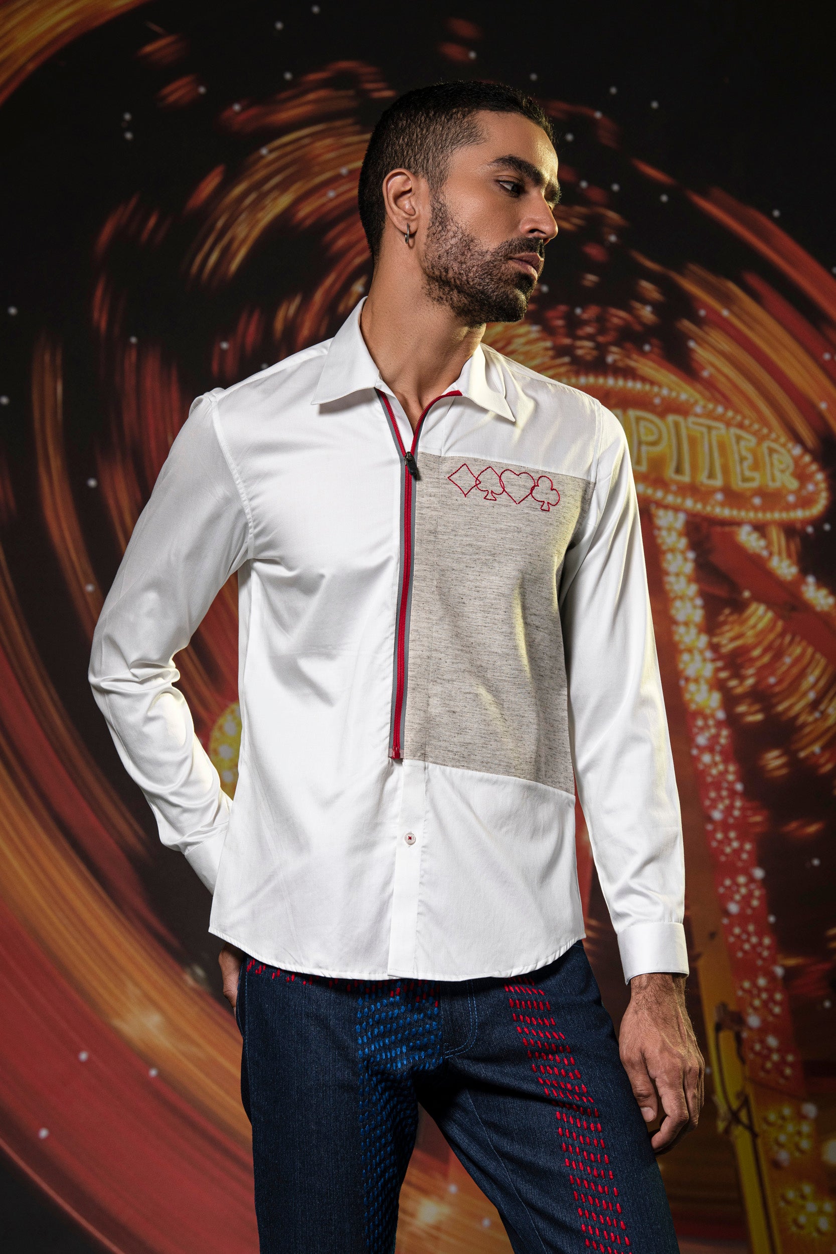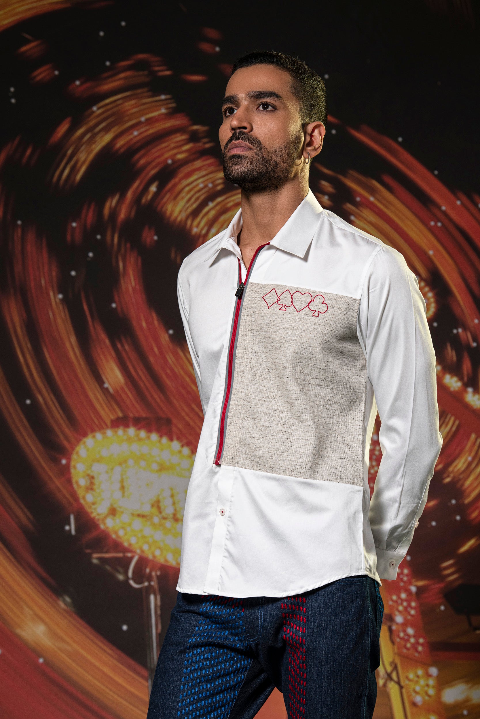 Featuring a white shirt in cotton base with patchwork. Perfect wear for parties and cocktail ceremonies.