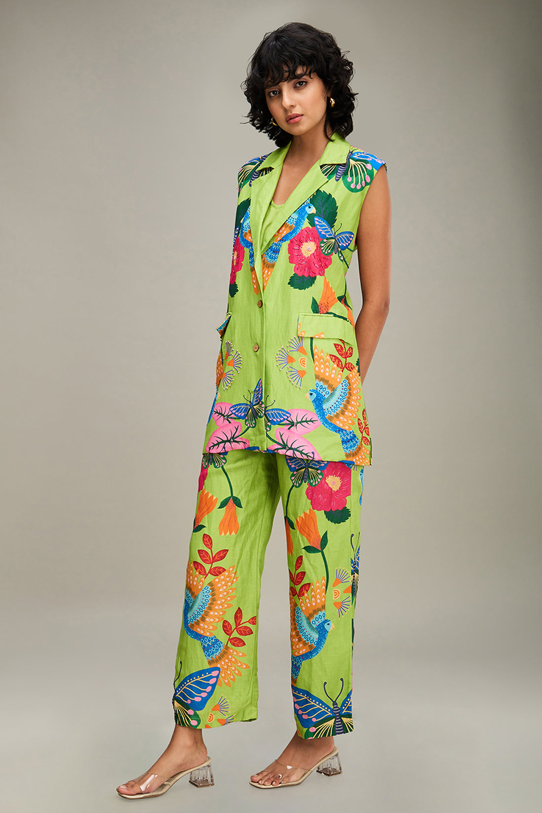 | Green Avain Canopy Embellished Blazer Top with Straight Pants in Linen. Fit: Relaxed Wash Care: Dry Clean Only |