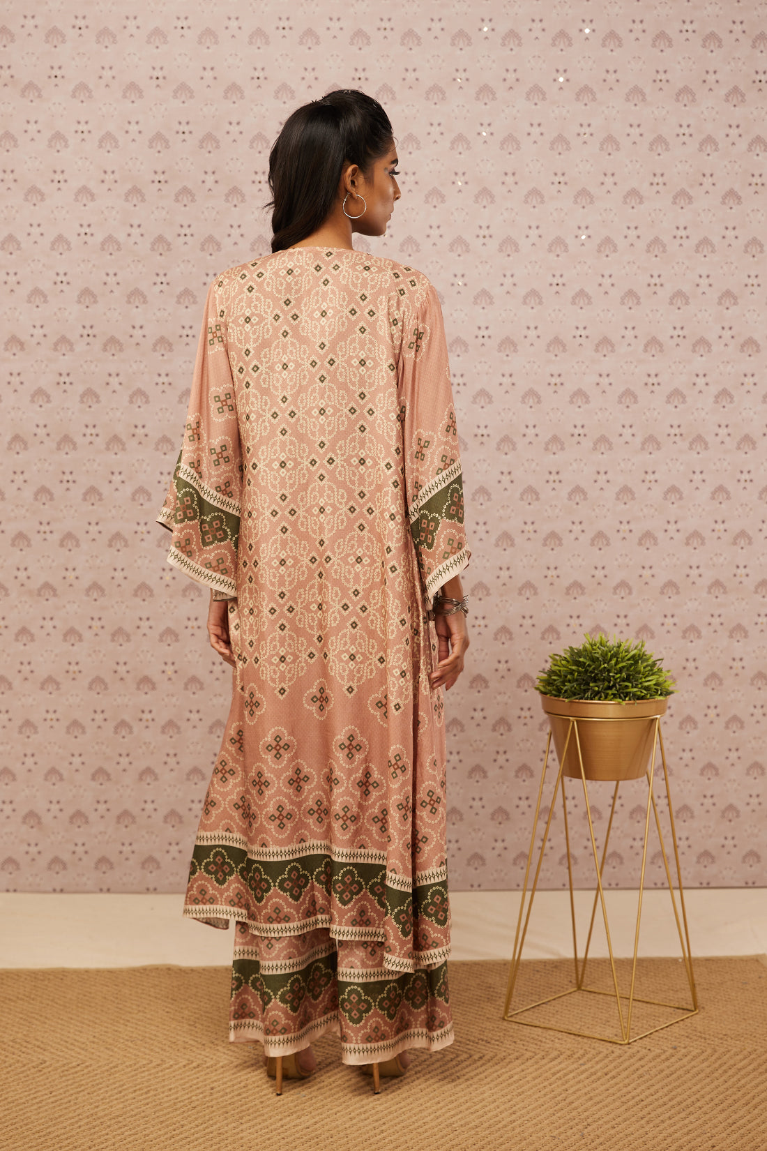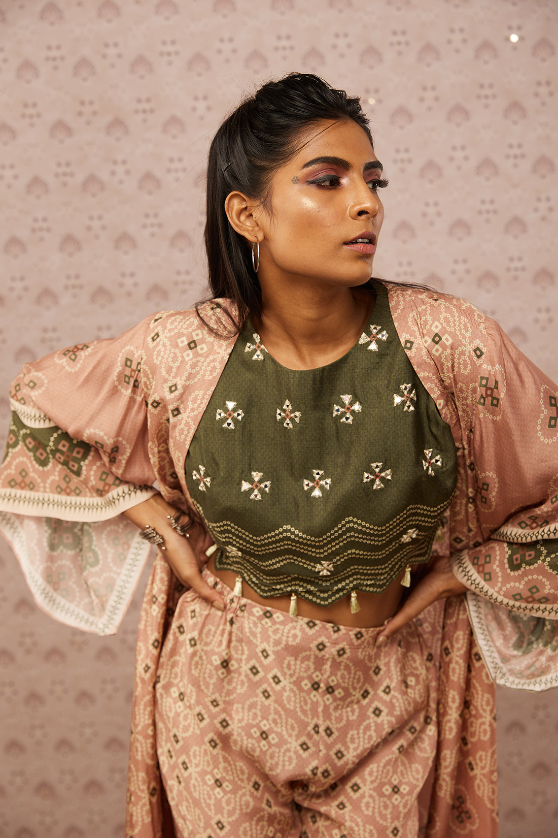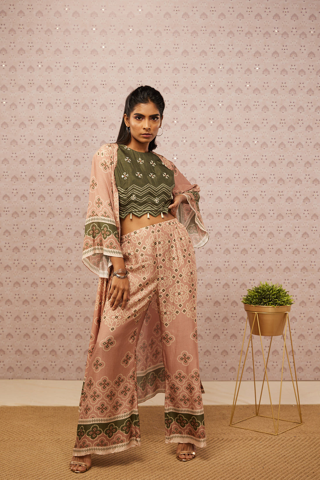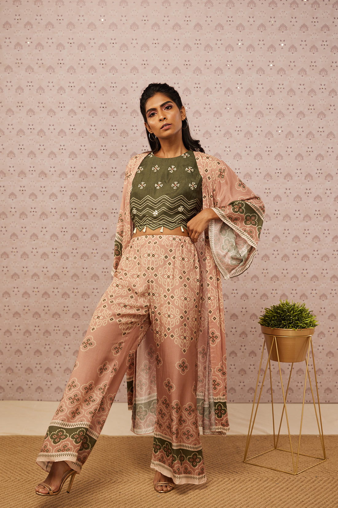 Featuring a peach and green Co-Ord Set. It is paired with a cotton silk Jacket.
