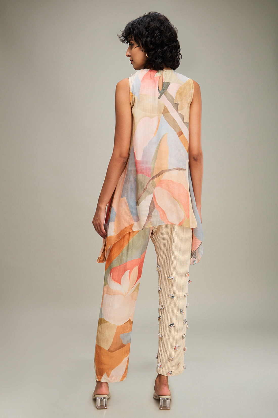 | Multicolor Conversational Embellished Top Paired with Pants in Handloom Net and Linen Slub Fit: Relaxed Wash Care: Dry Clean Only |