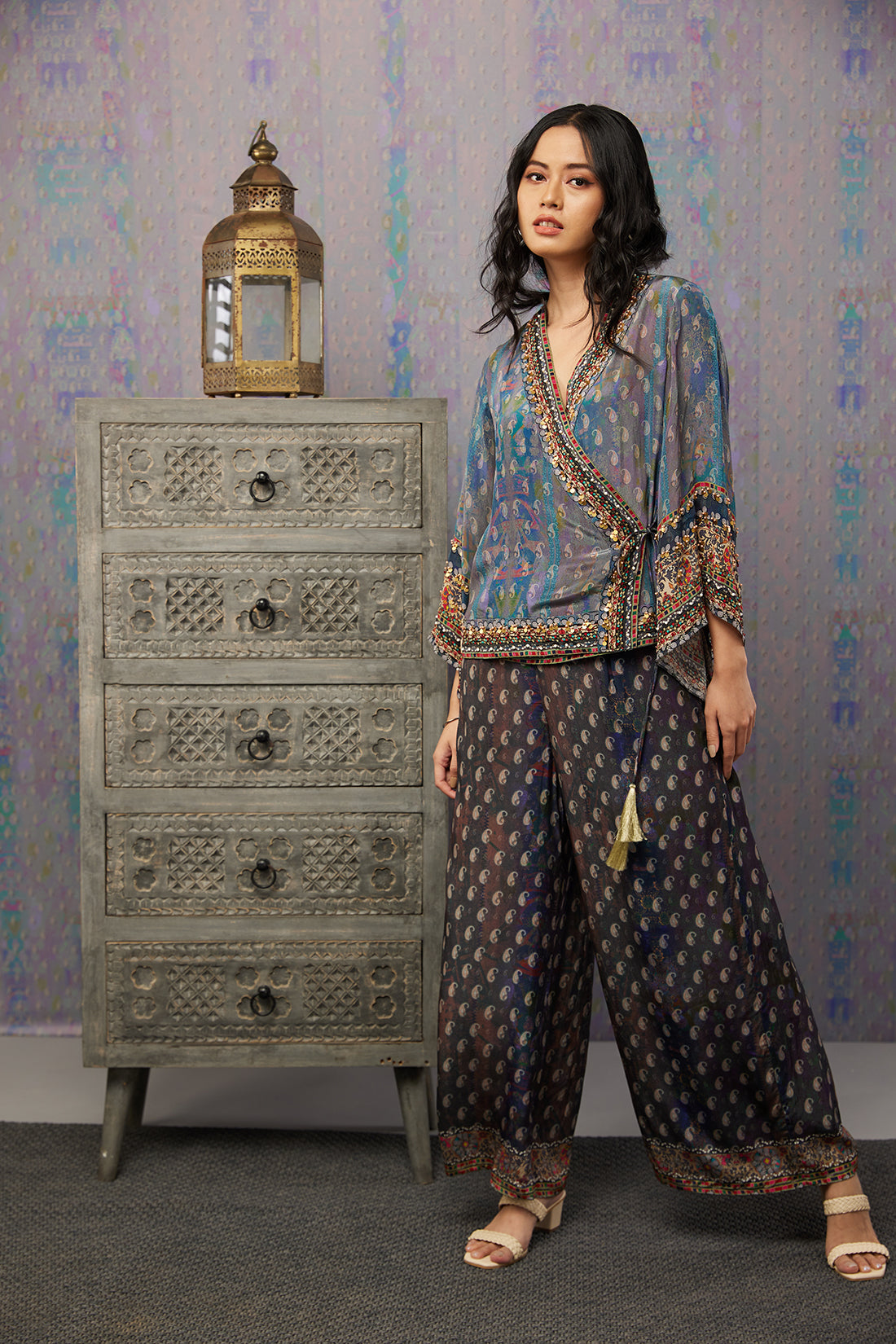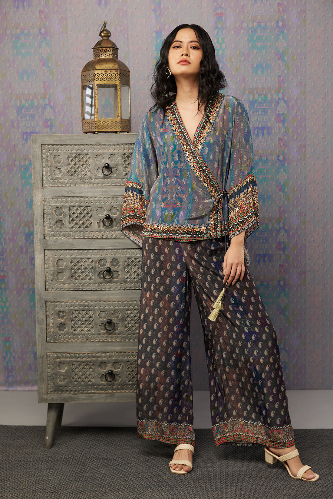 Featuring a mutli-color angarkha set. It consists of embroidered kurta & flared pants.