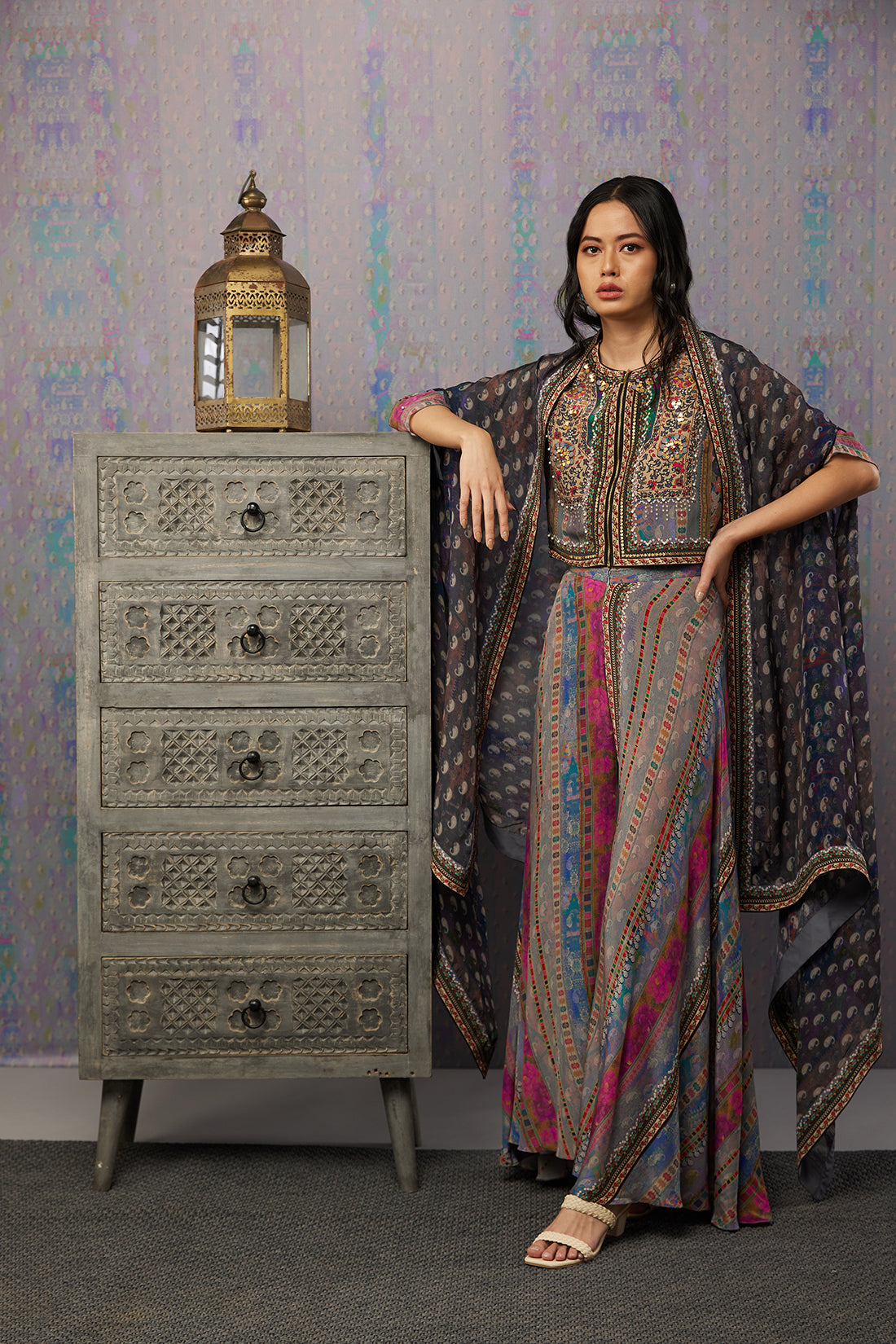Featuring a multi-color Co-ord set in crepe fabric. It is paired with a chiffon Cape jacket.