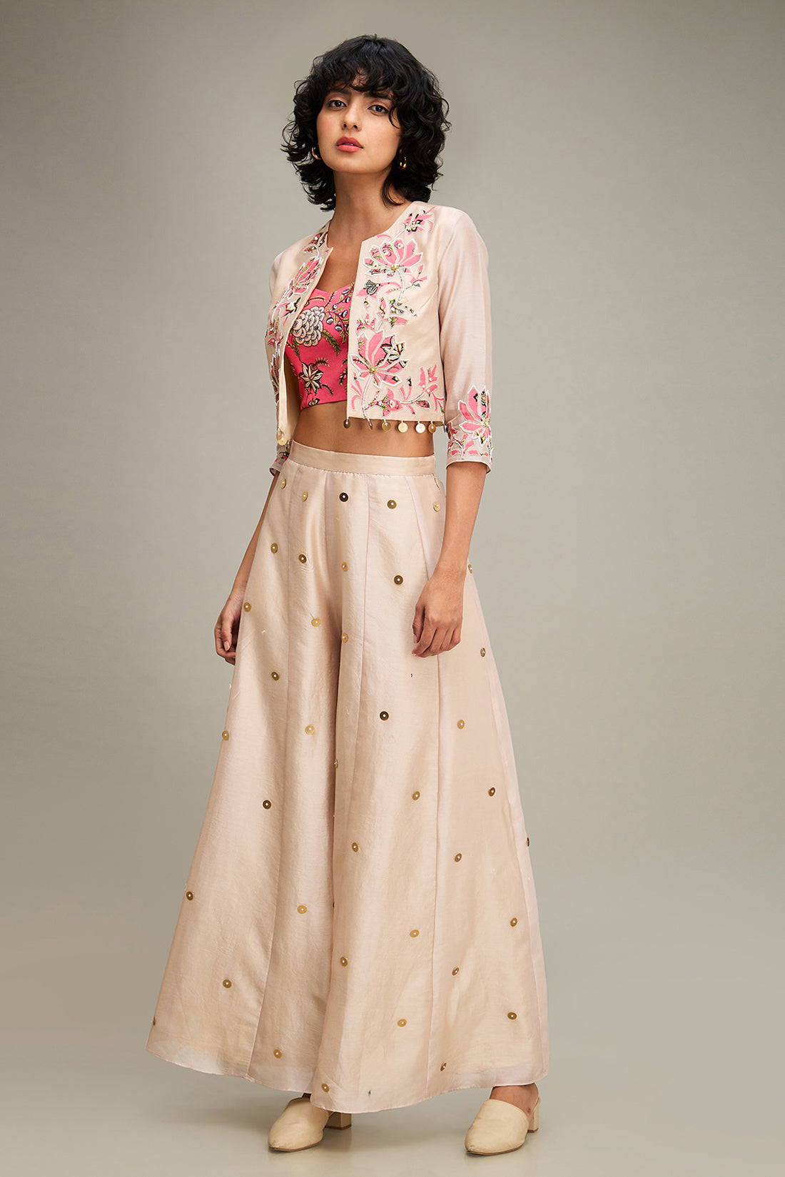 | Beige Mehr Printed Bustier And Pants Paired With Applique Jacket In Chanderi. Fit: Relaxed Wash Care: Dry Clean Only |
