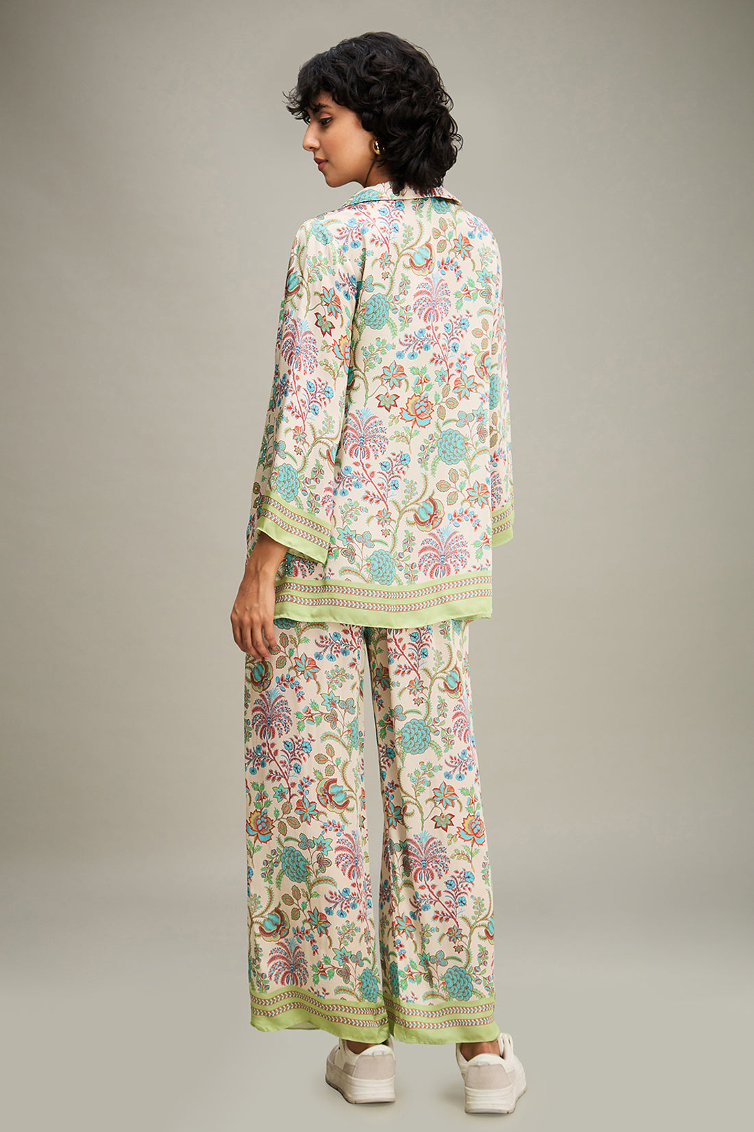 | Multicolor Mehr Printed Top and Pants Paired with a Shirt in Satin. Fit: Relaxed Wash Care: Dry Clean Only |