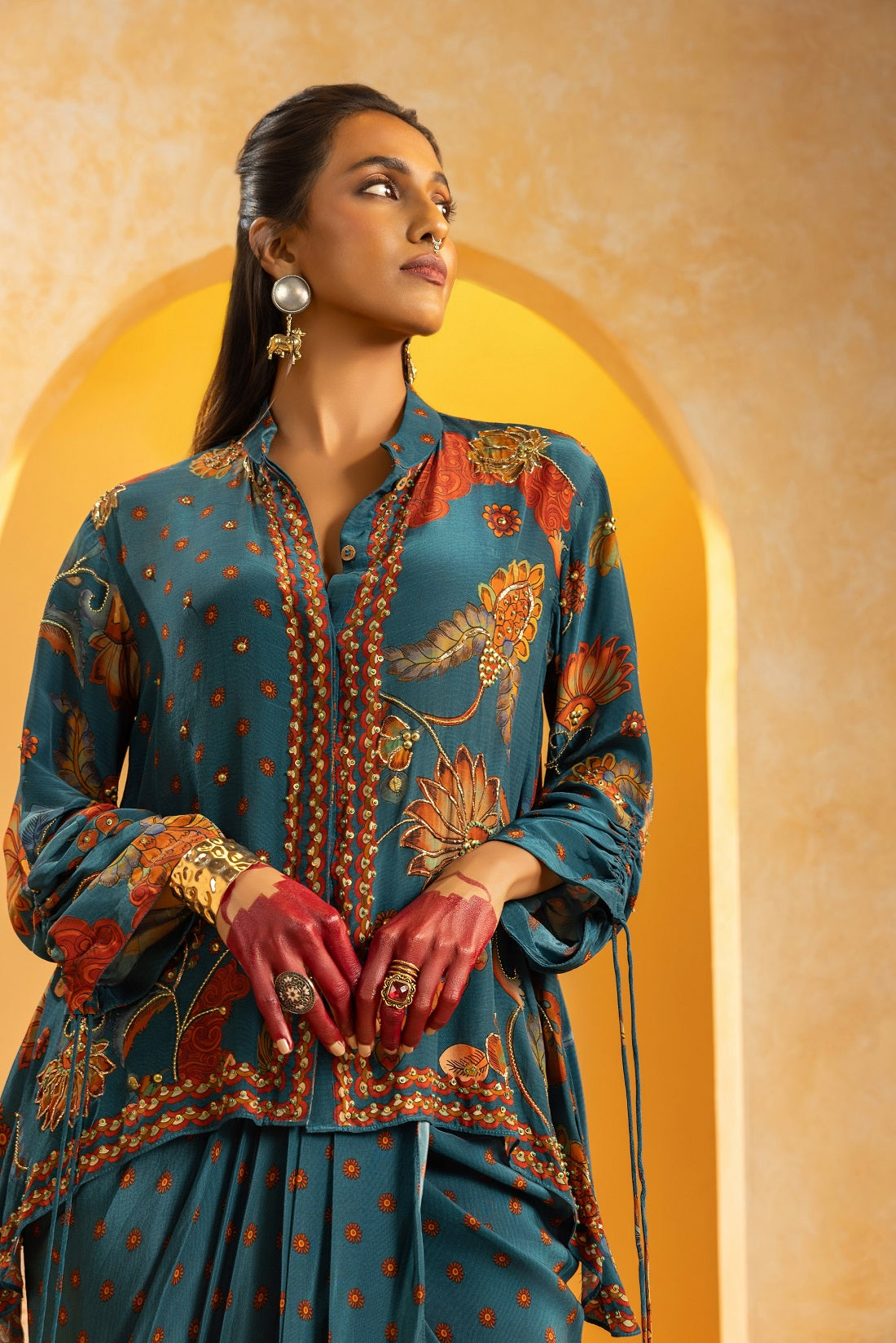 Blue Rangtara Embellished Shirt With Gathered Sleeves, Paired With A Printed Crepe Skirt.