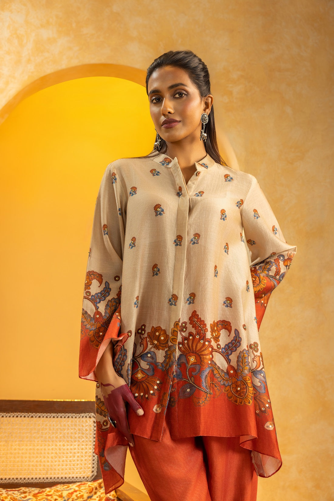 Beige Rangtara Embroidered Kurta With Flaired Sleeve, Paired With Pants In Chanderi.