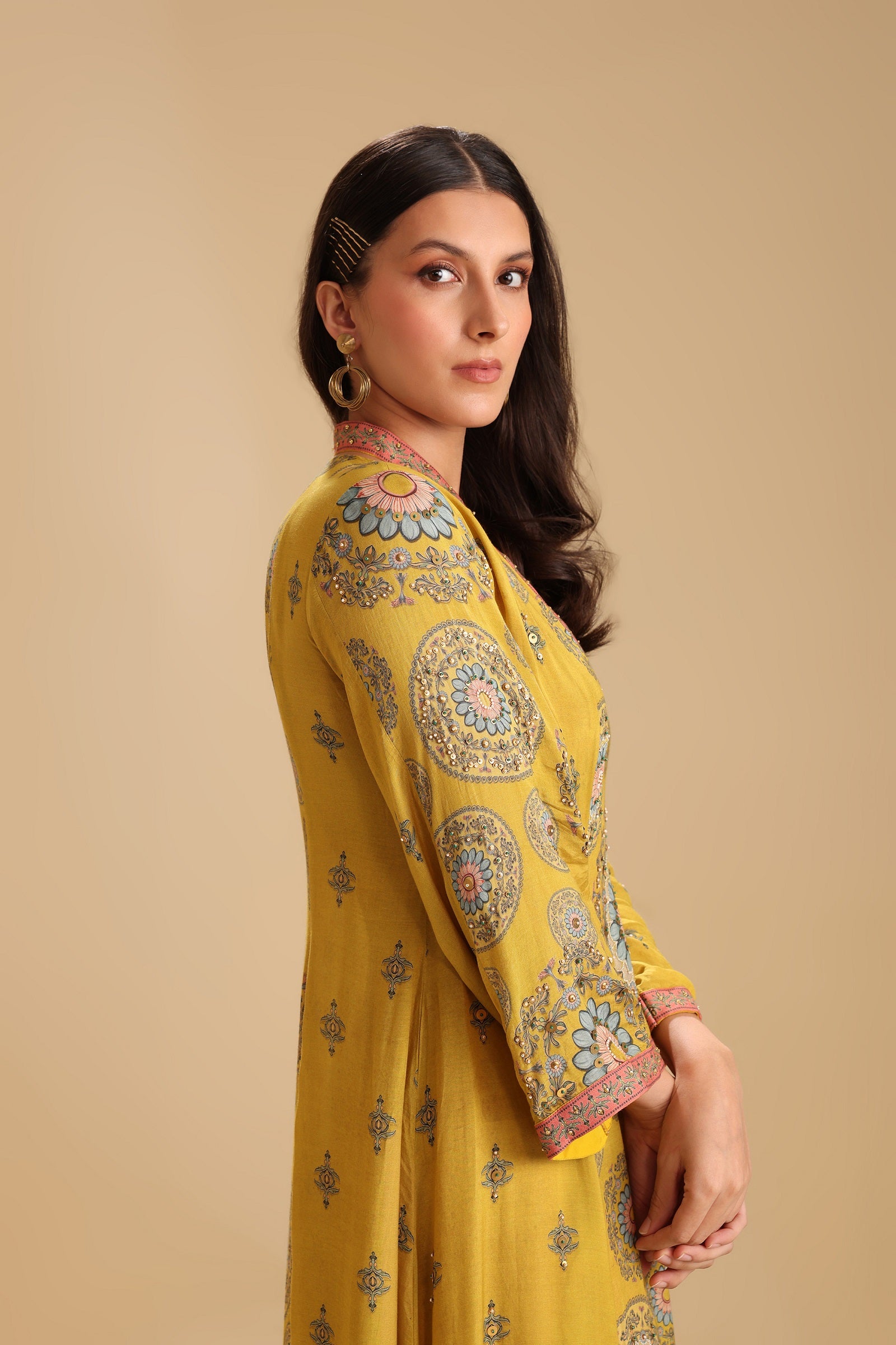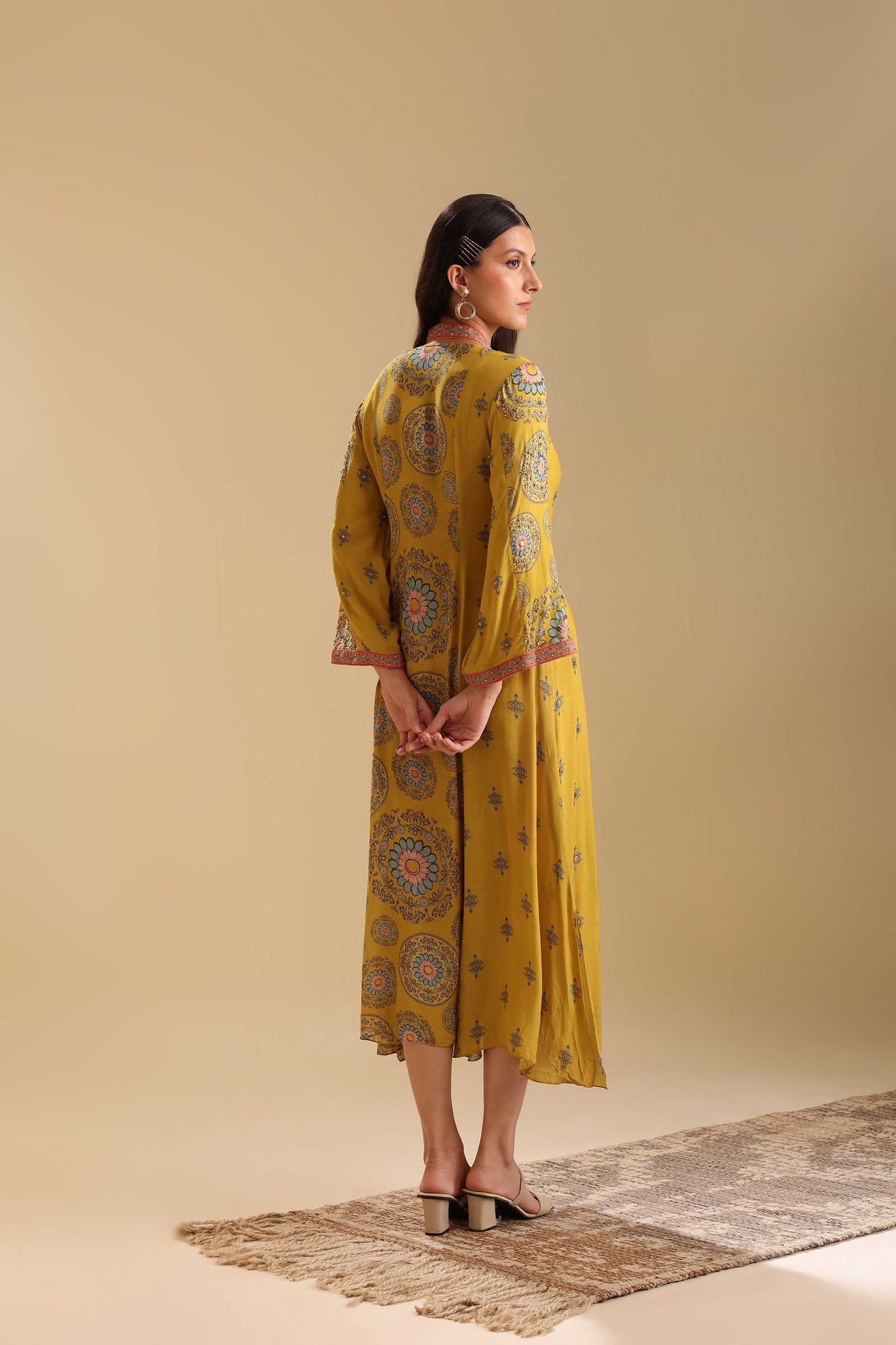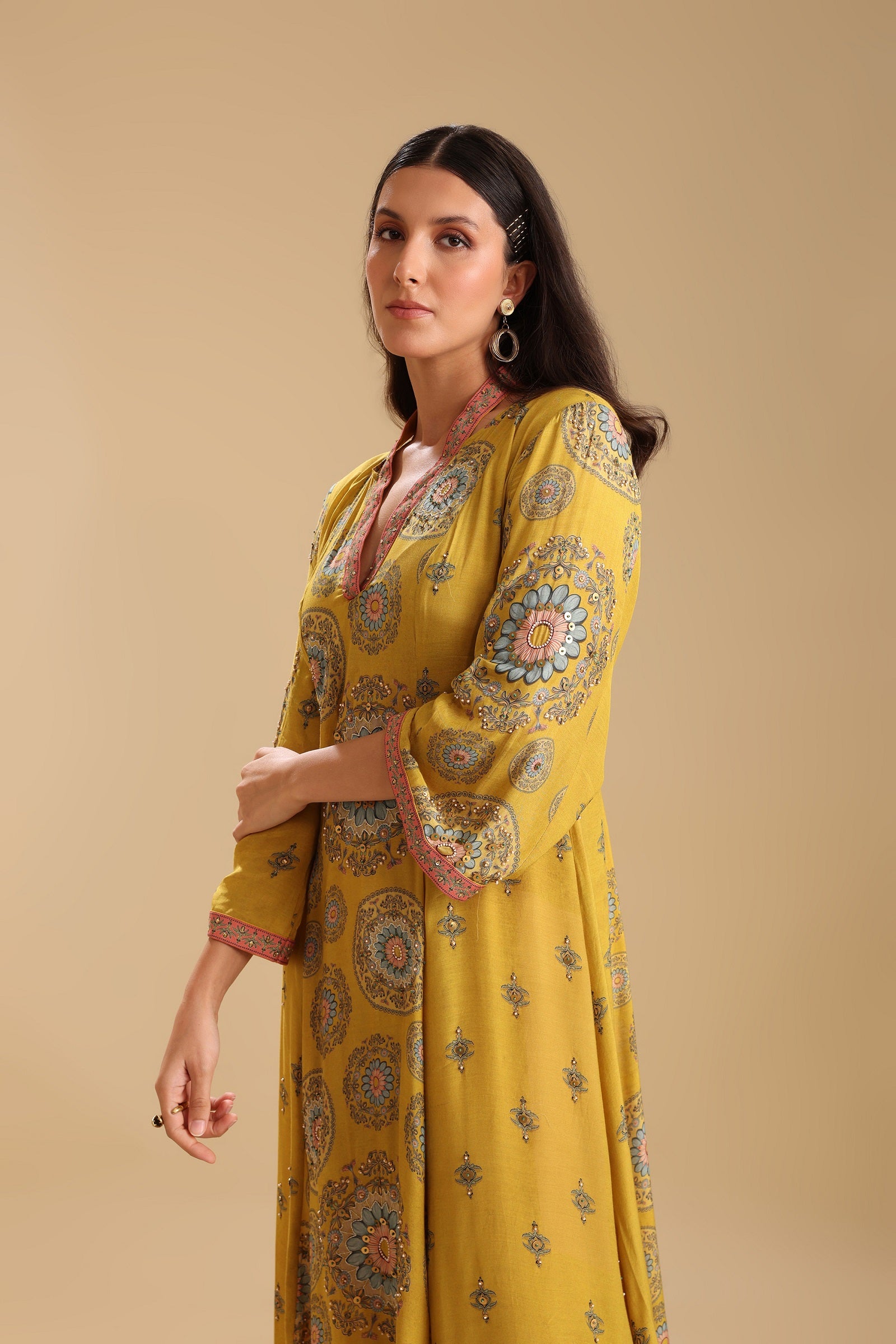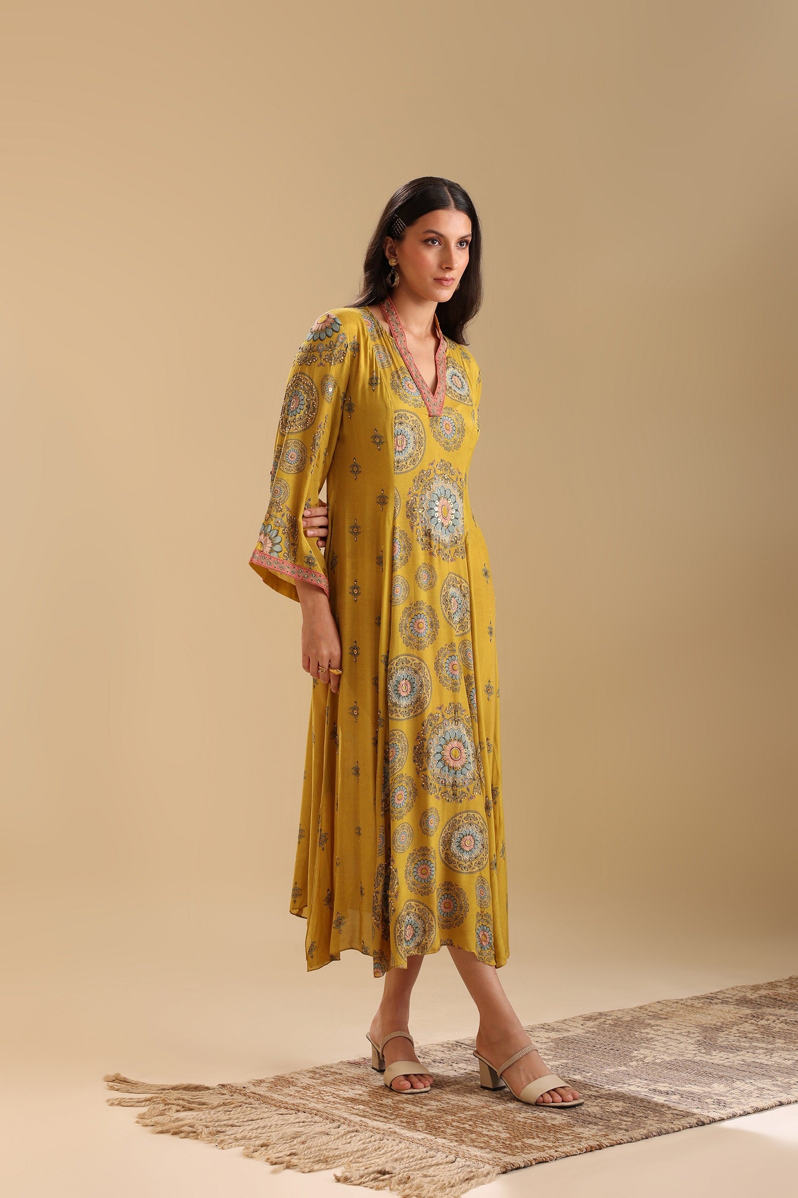 | Yellow Eraya Embellished V-Neck Long Dress with Flared Sleeves in Chanderi. Fit: Relaxed Wash Care: Dry Clean Only |