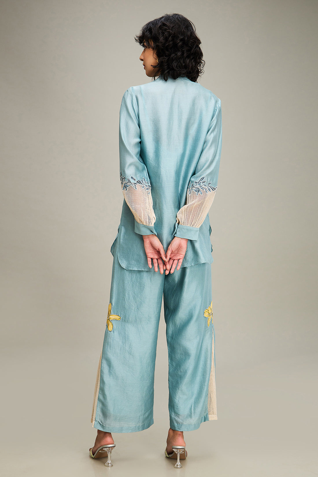| Blue Zinnia Applique Shirt with Front Tie-ups in handloom net, paired with Pants in Chanderi Fit: Relaxed Wash Care: Dry Clean Only |
