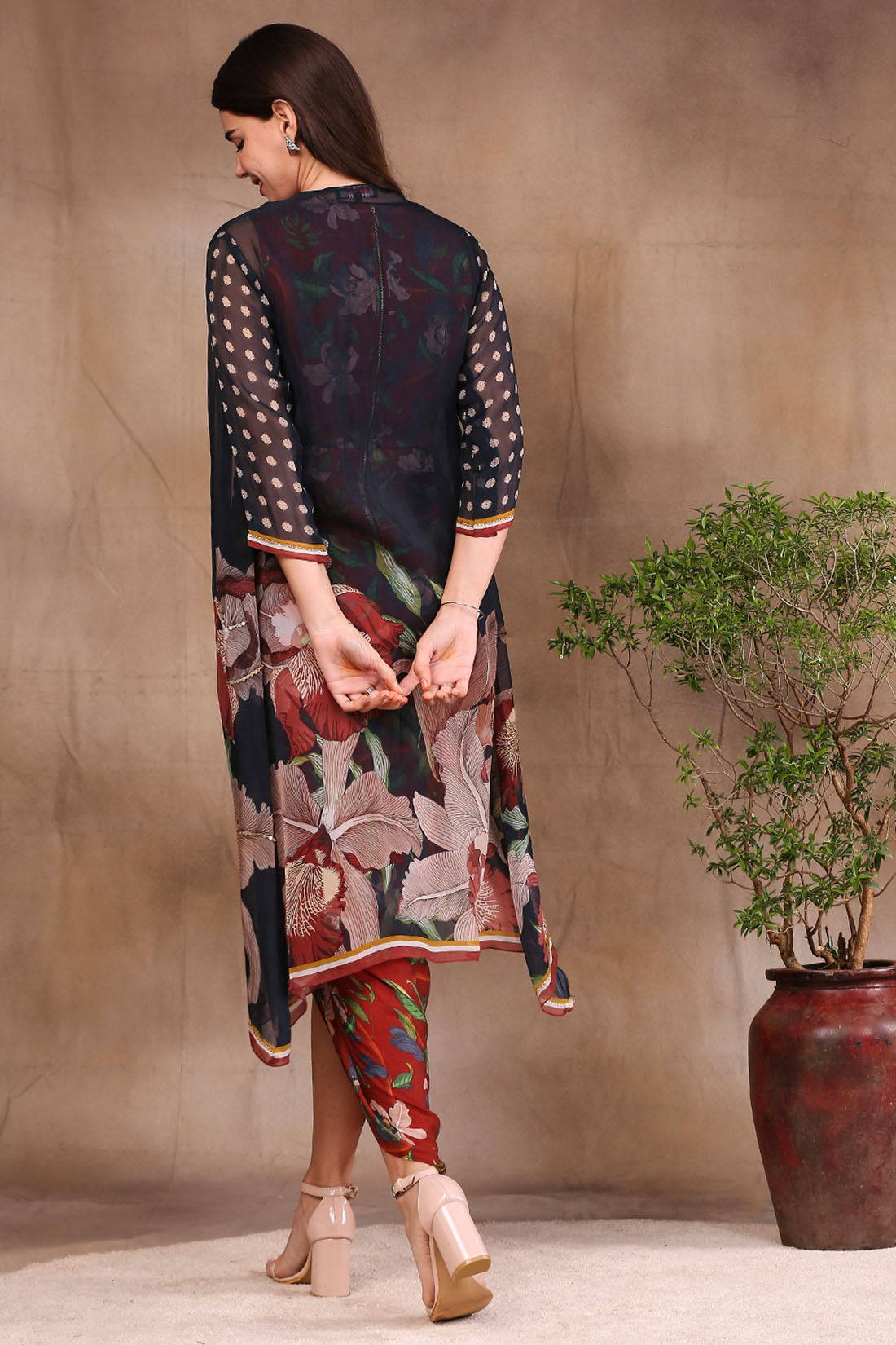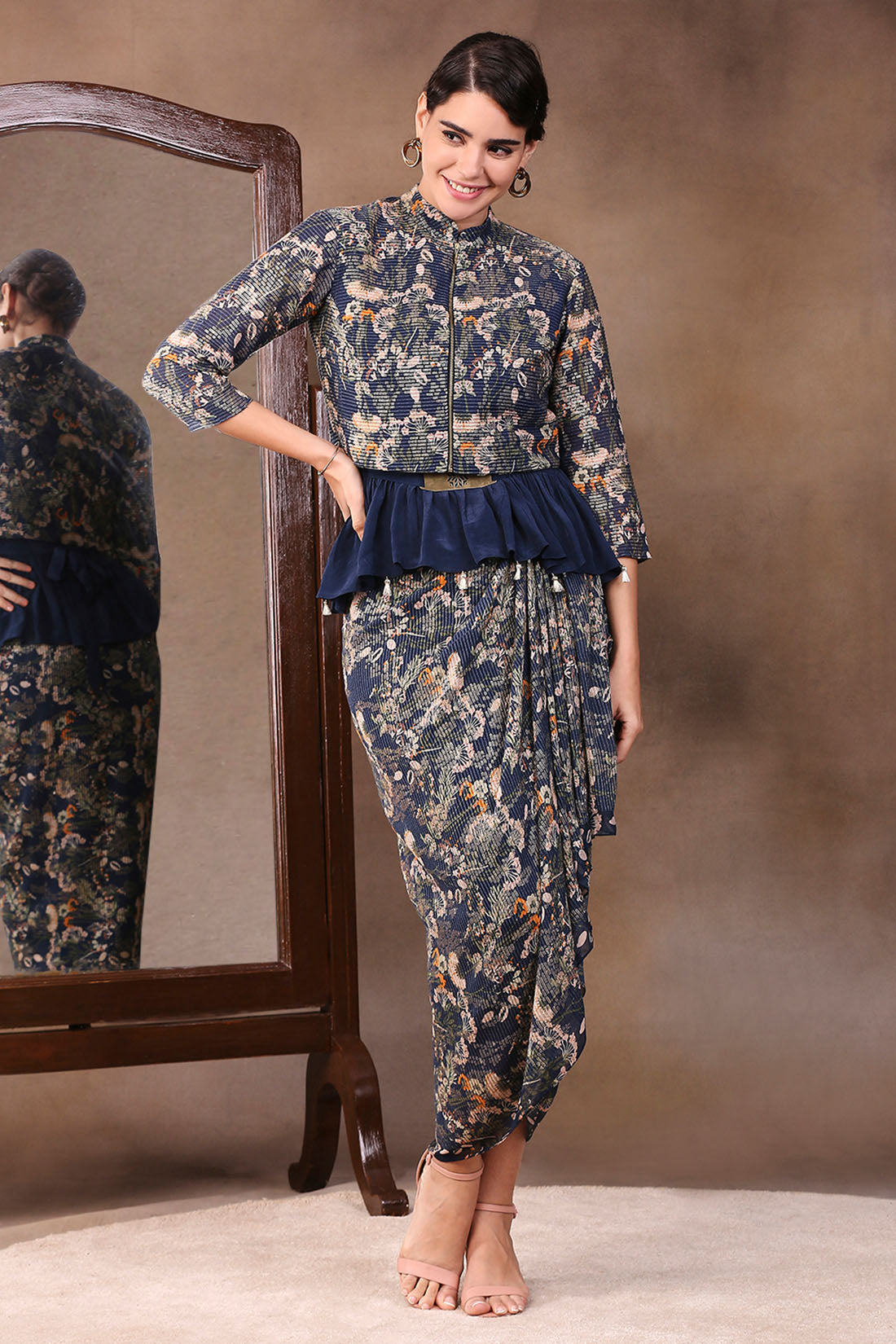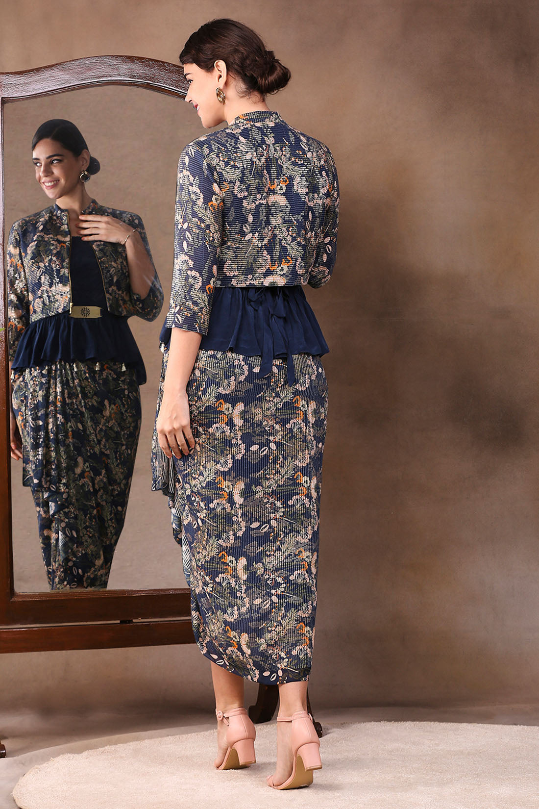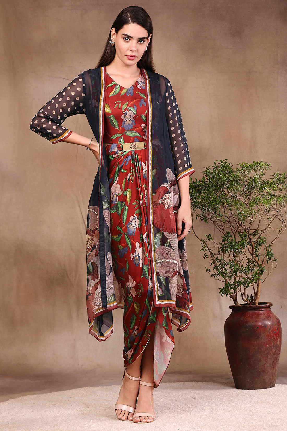Maroon & blue orchid bloom printed drape dress with straight jacket