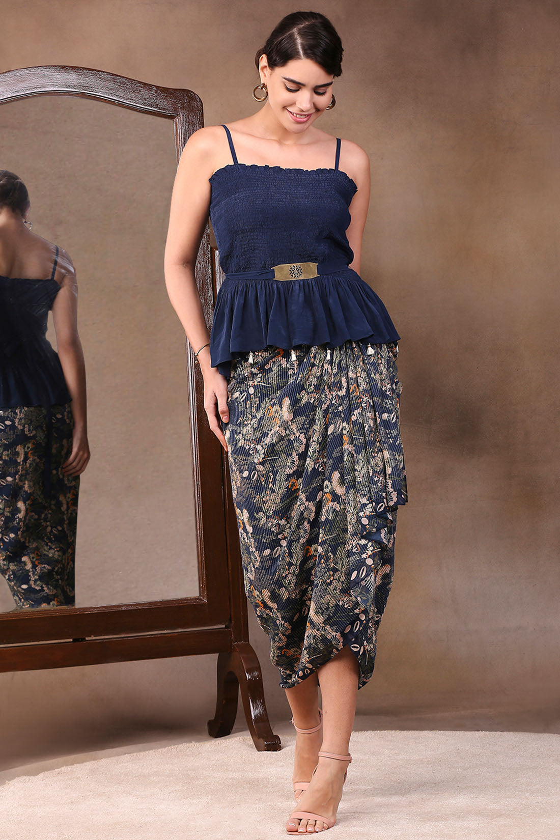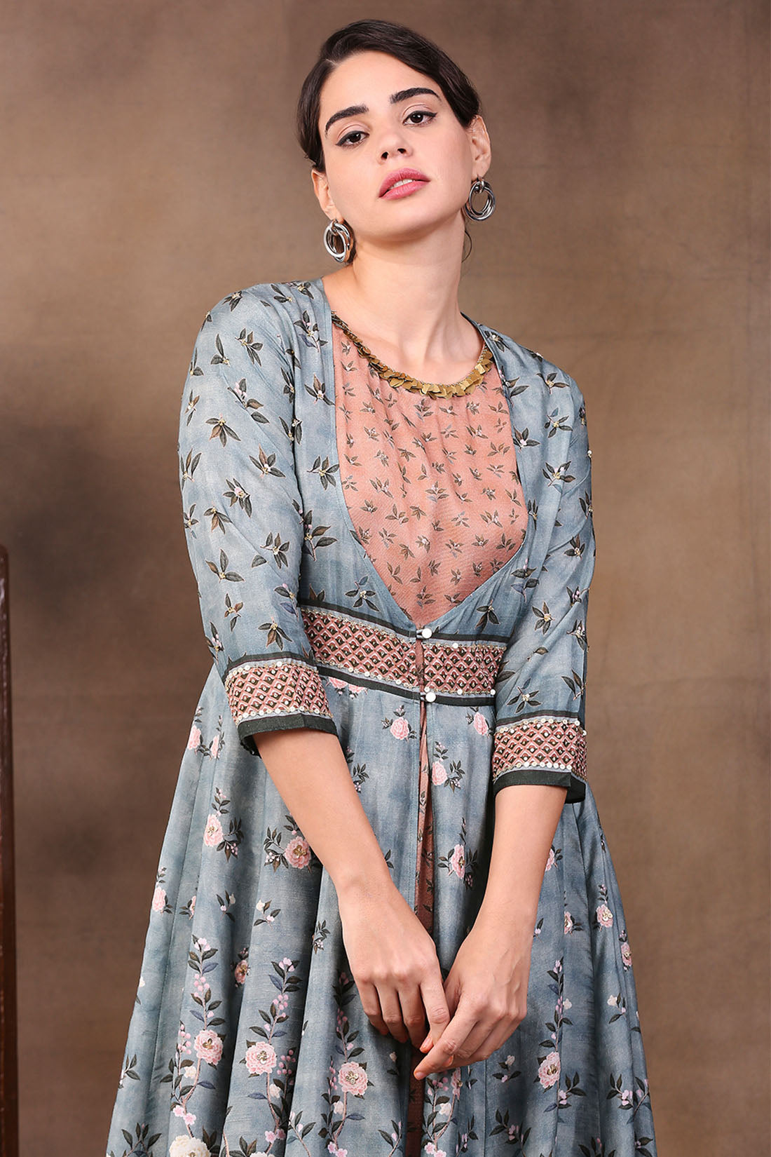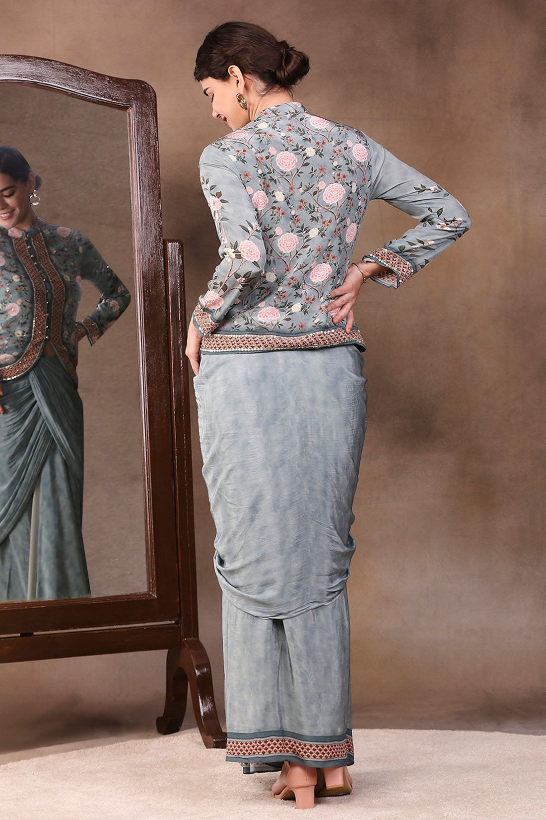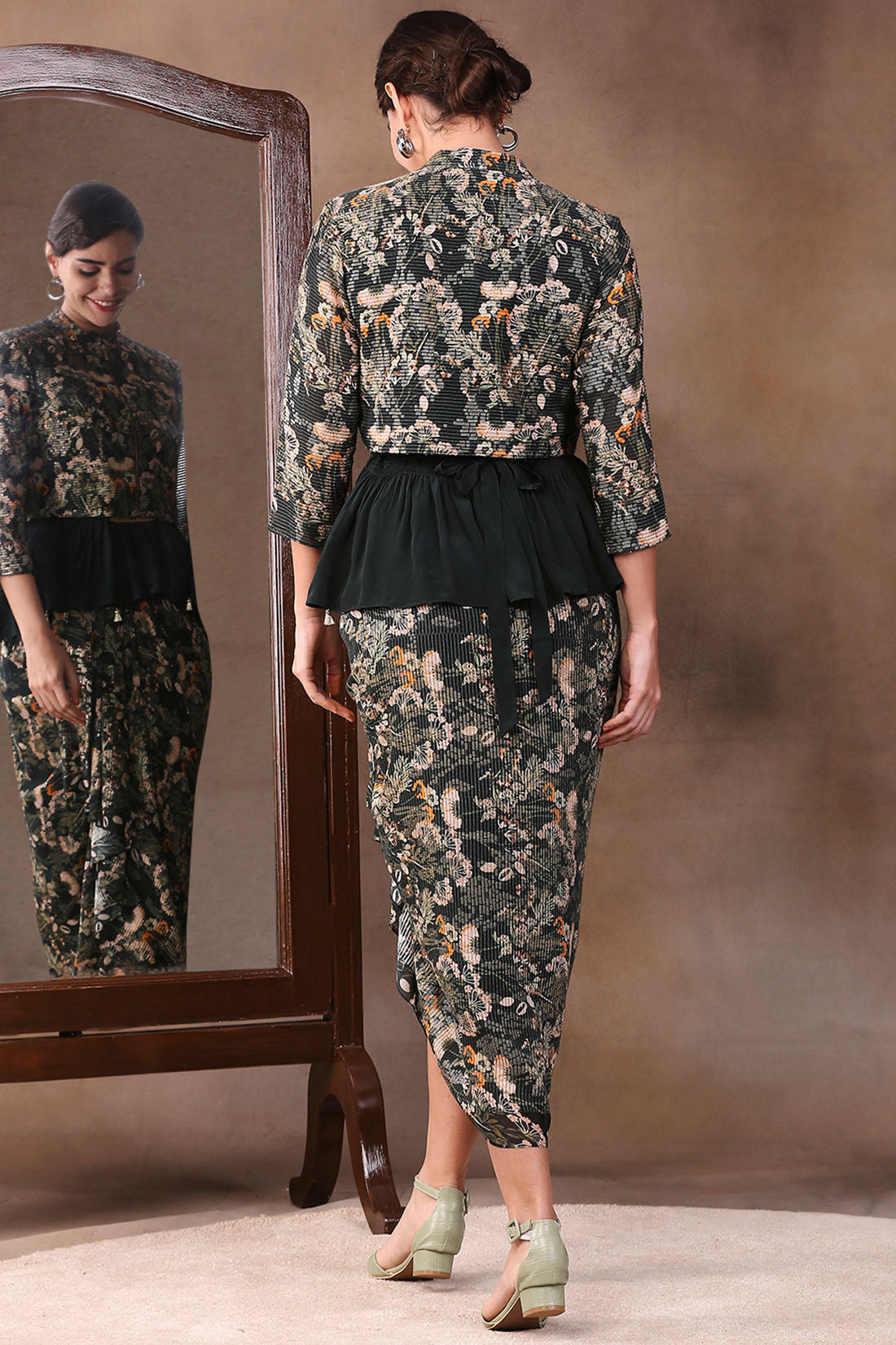 Maroon & blue orchid bloom printed drape dress with straight jacket