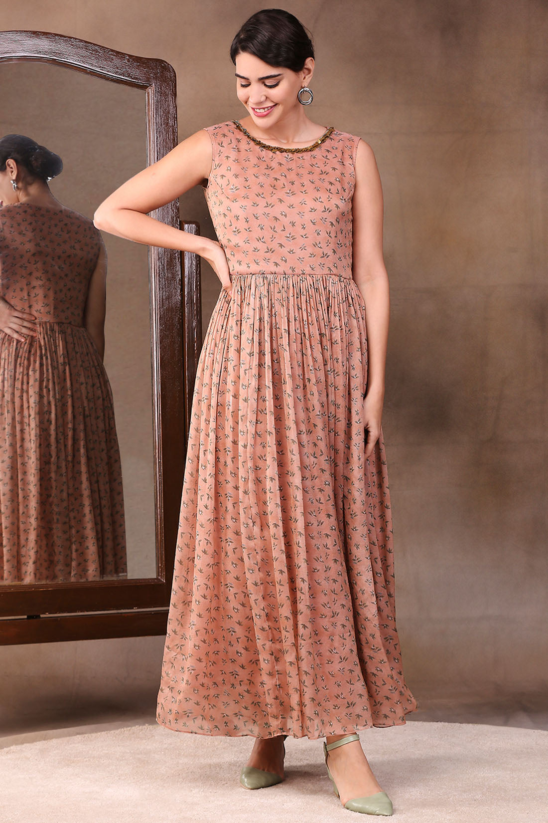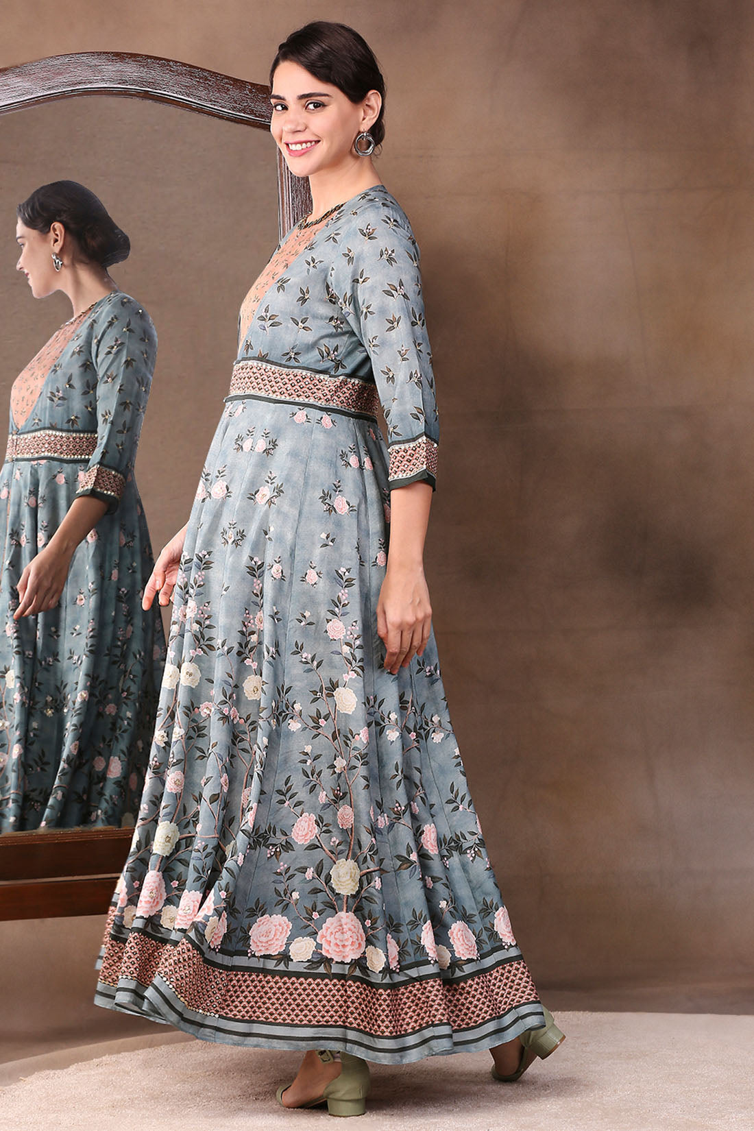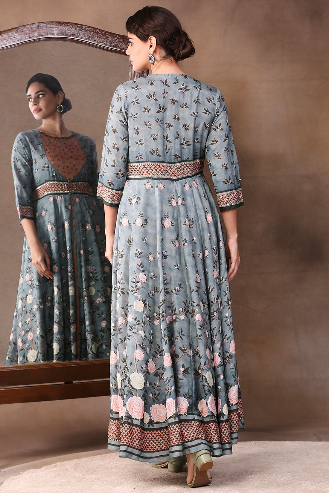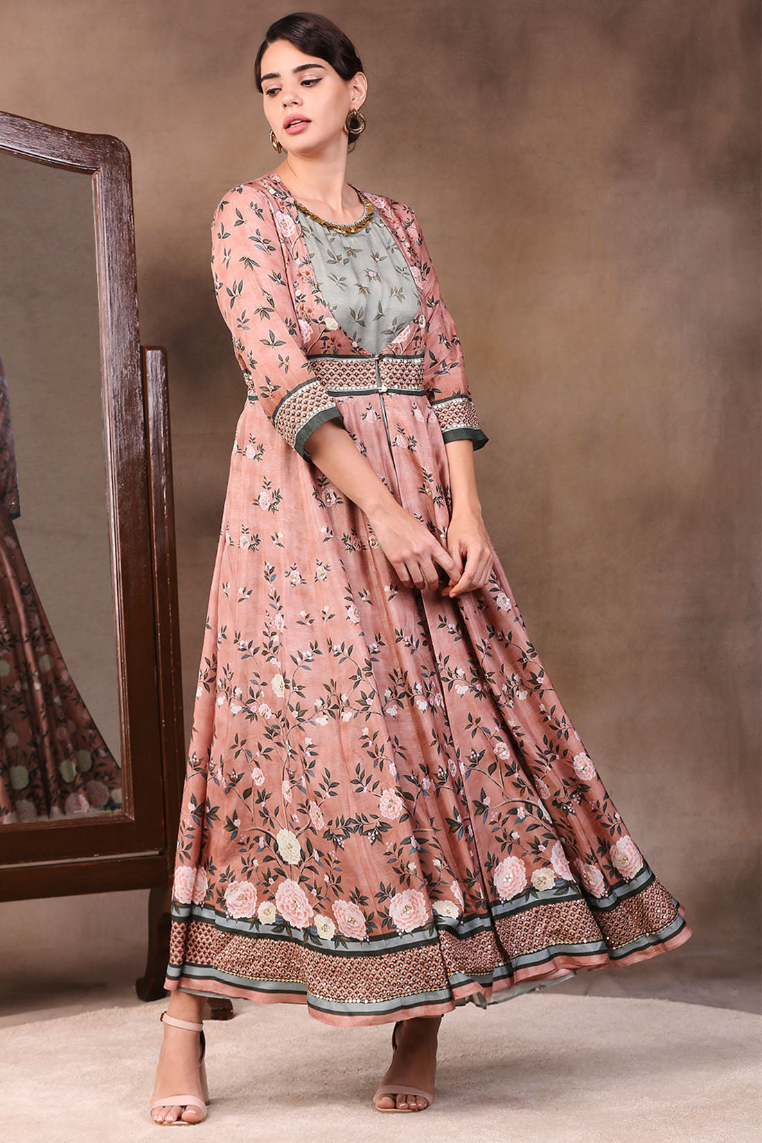 Maroon & blue orchid bloom printed drape dress with straight jacket