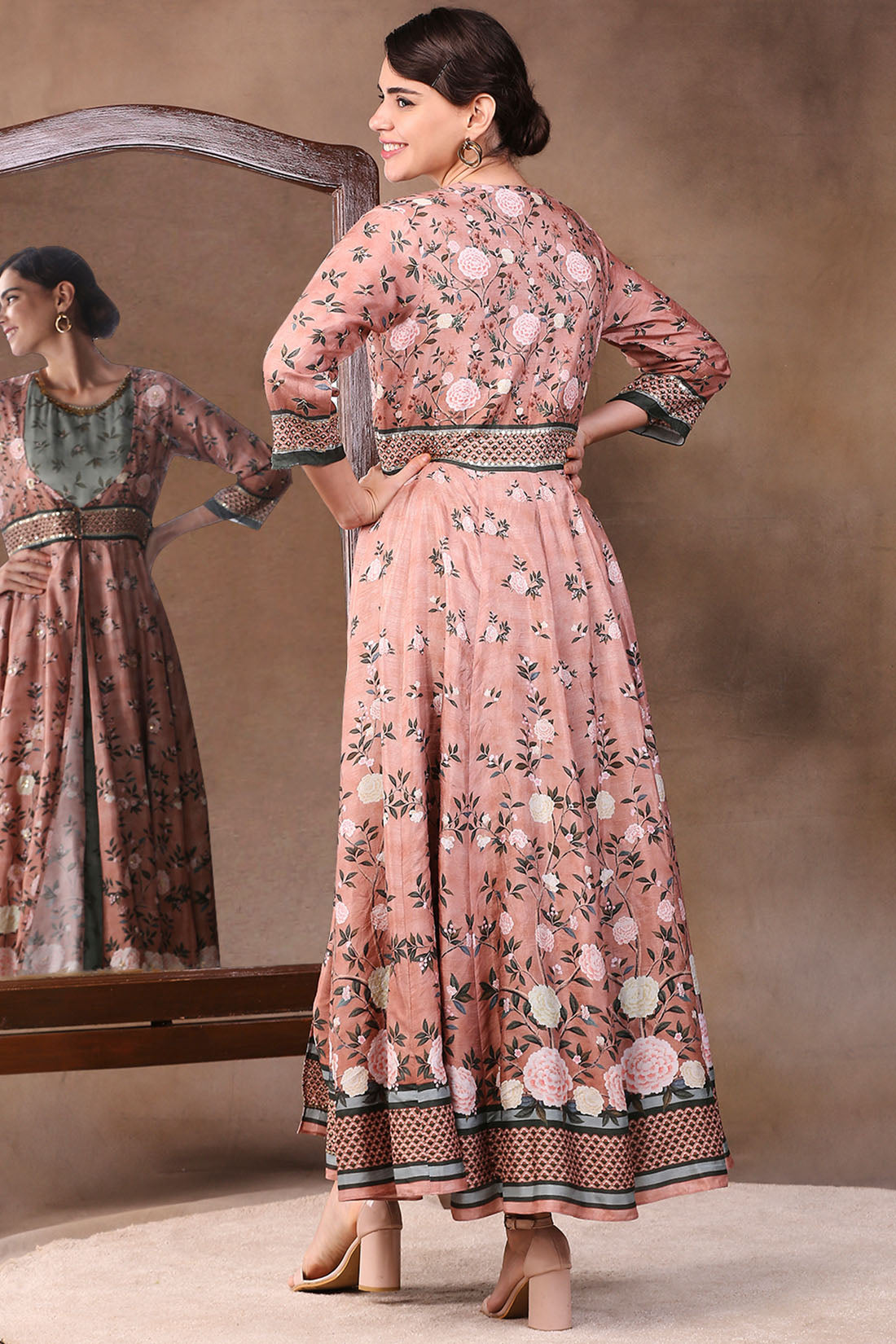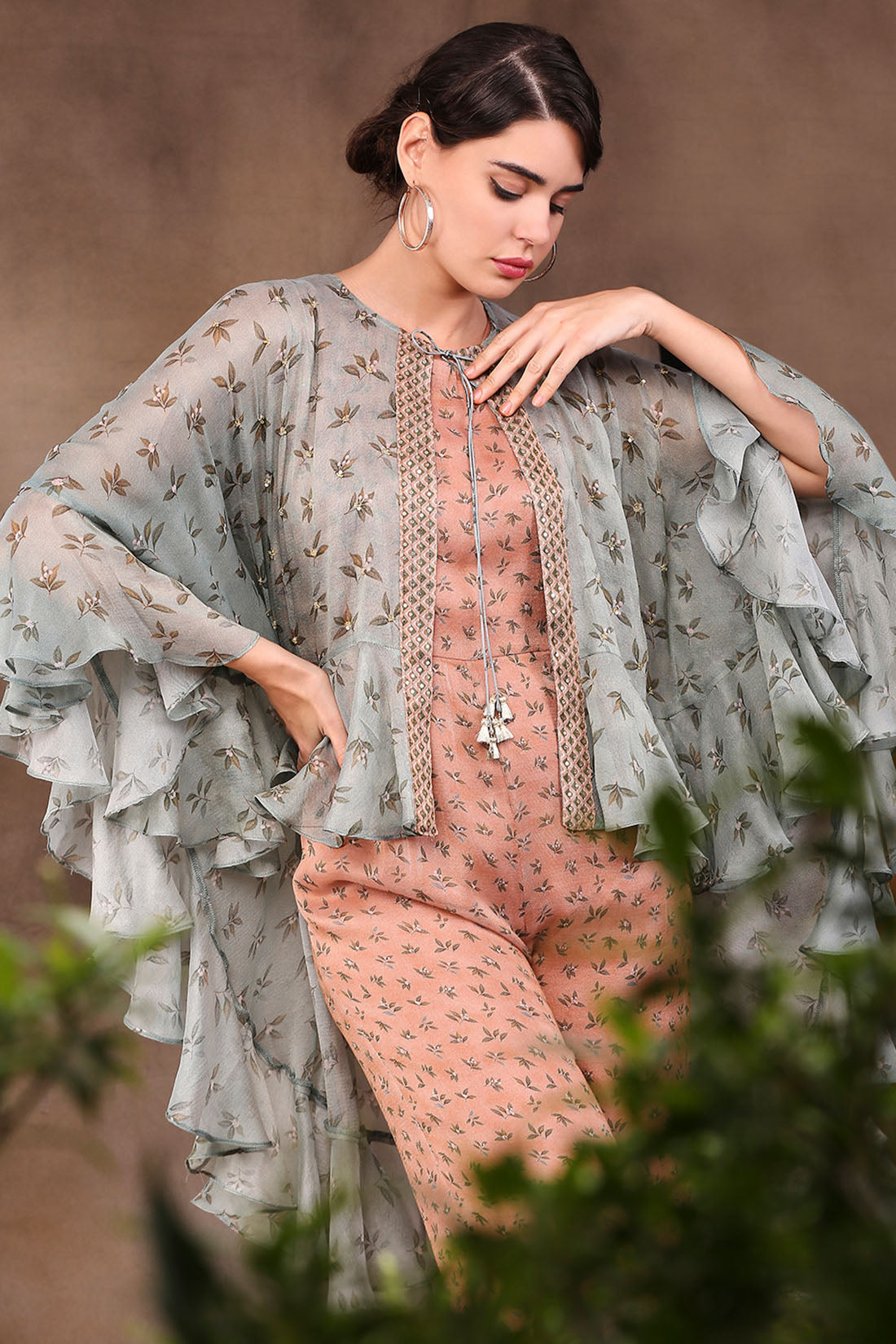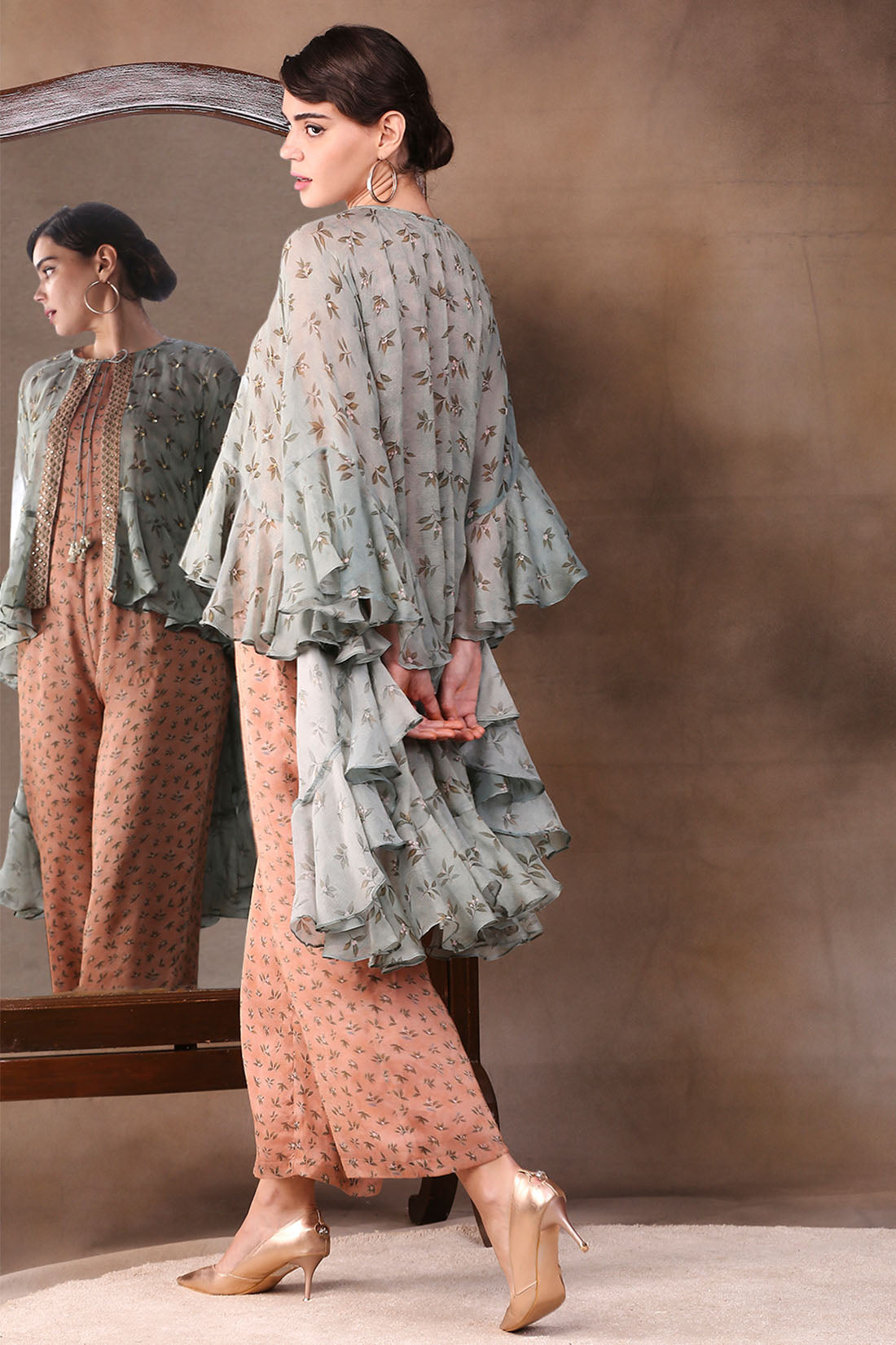 Green & peach vintage trails printed jumpsuit with high-low cape
