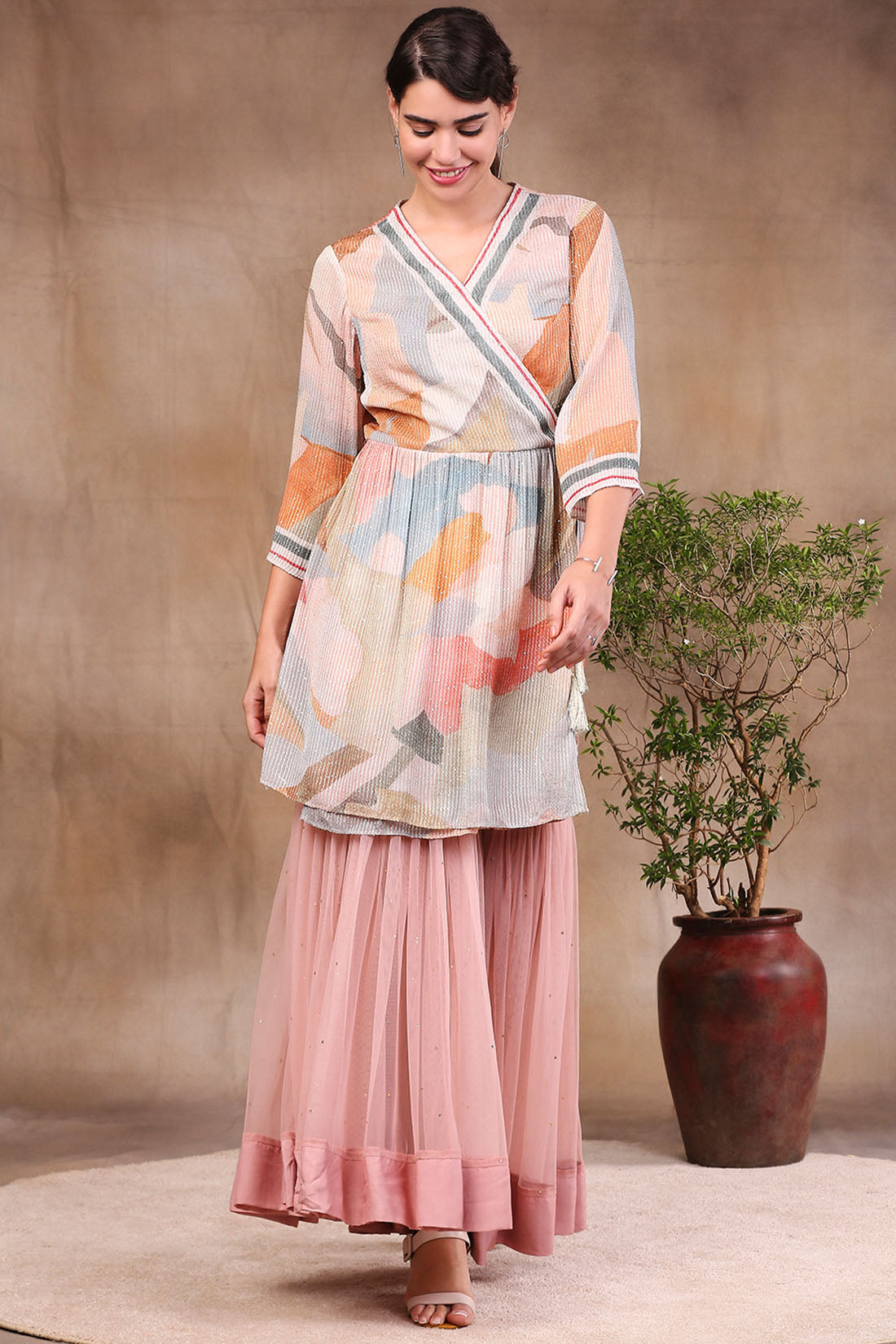 Green & peach vintage trails printed one shoulder embroidered top with pant