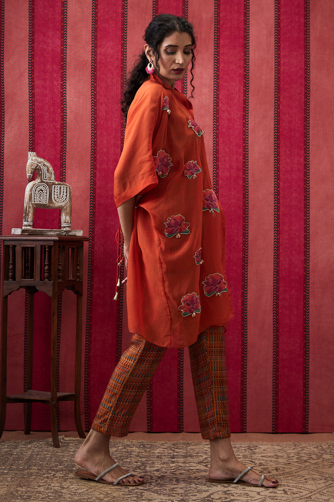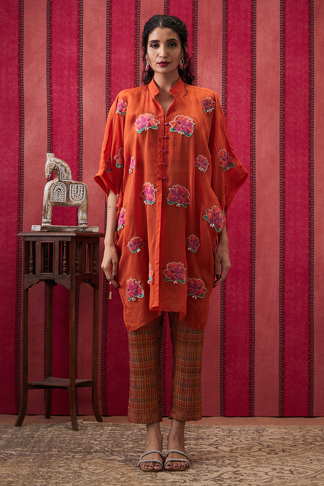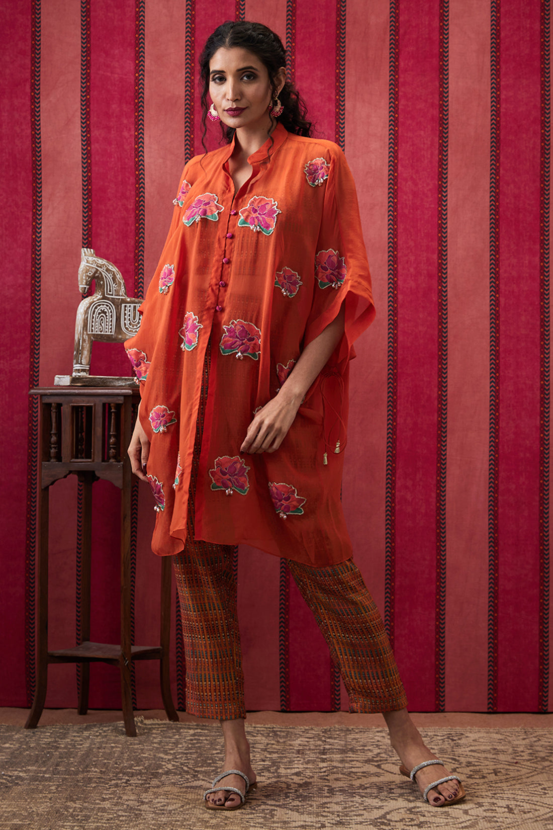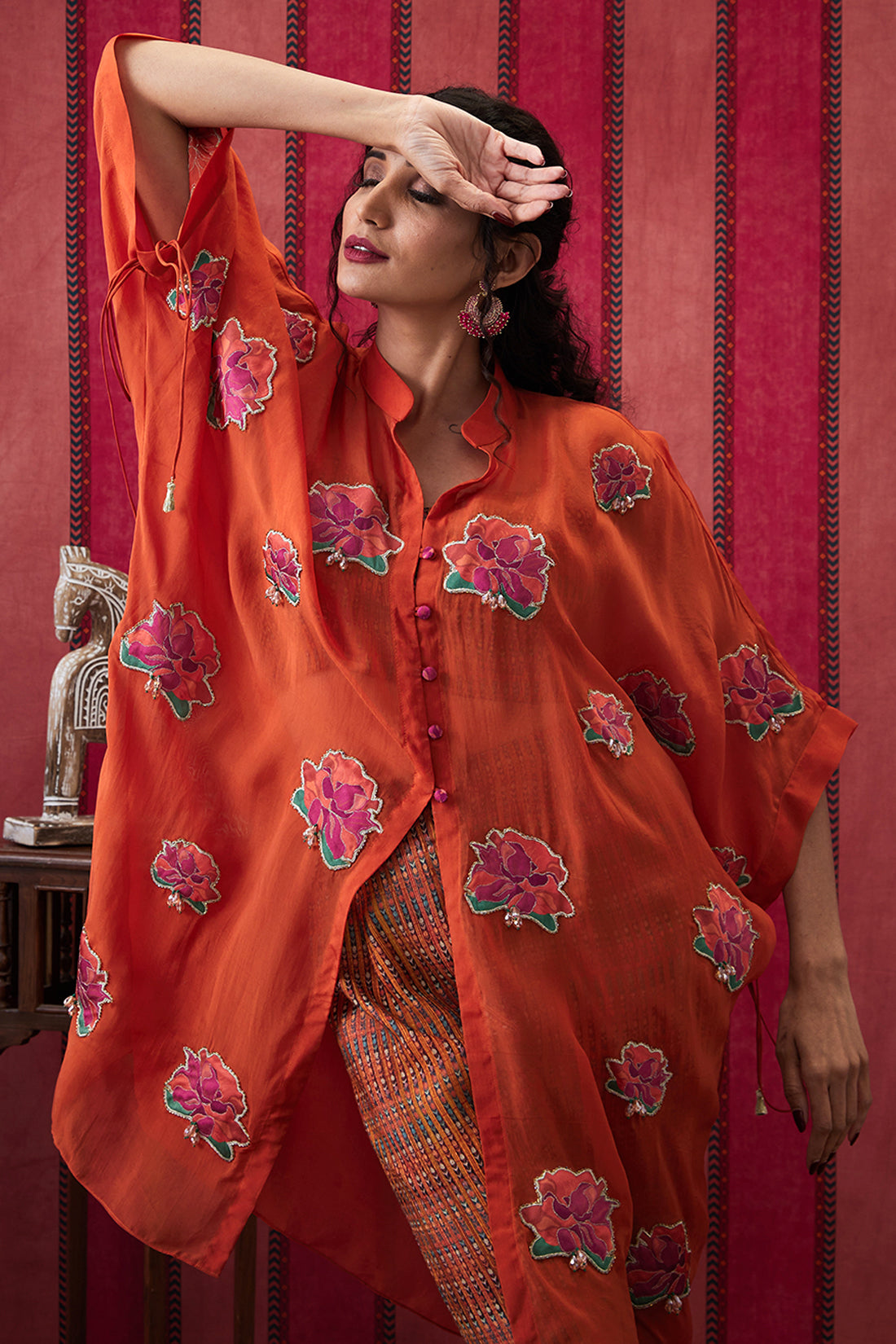 Featuring a rust embellished co-ord set in Malaysian silk fabric. It is paired with an organza kimono cape skirt.