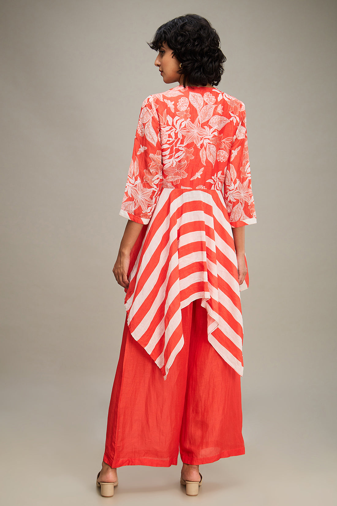 | Red Ahyana Printed Handkerchief Hem Top with Flared Pants in Linen Slub. Fit: Relaxed Wash Care: Dry Clean Only |