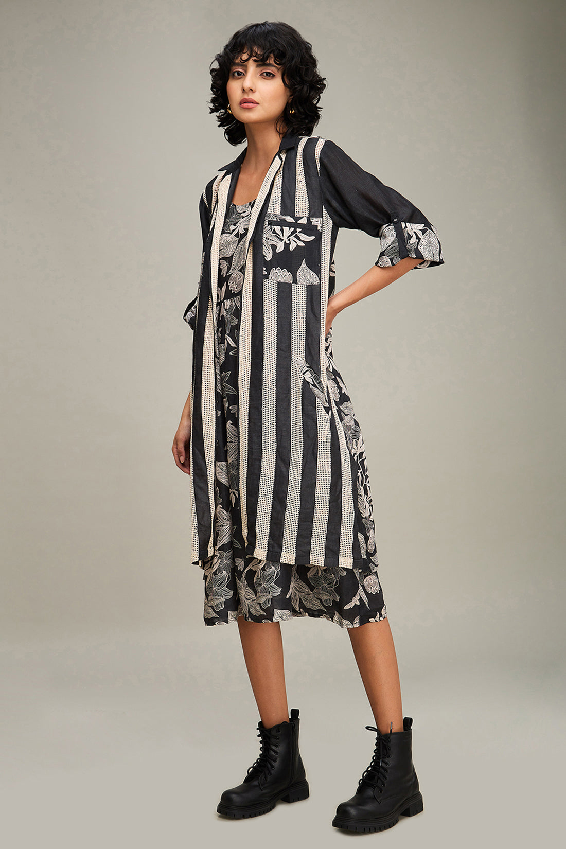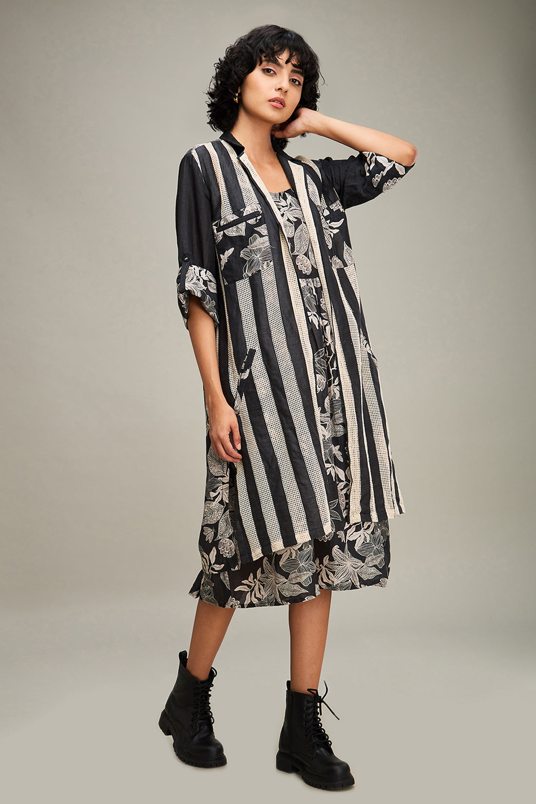 | Black Ahyana Printed Dress with waist gathers in linen slub, paired with a patchwork jacket featuring front pockets in handloom net. Fit: Relaxed Wash Care: Dry Clean Only |