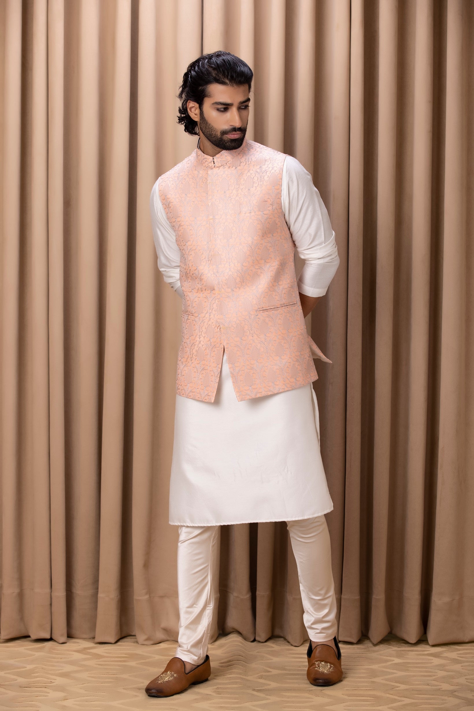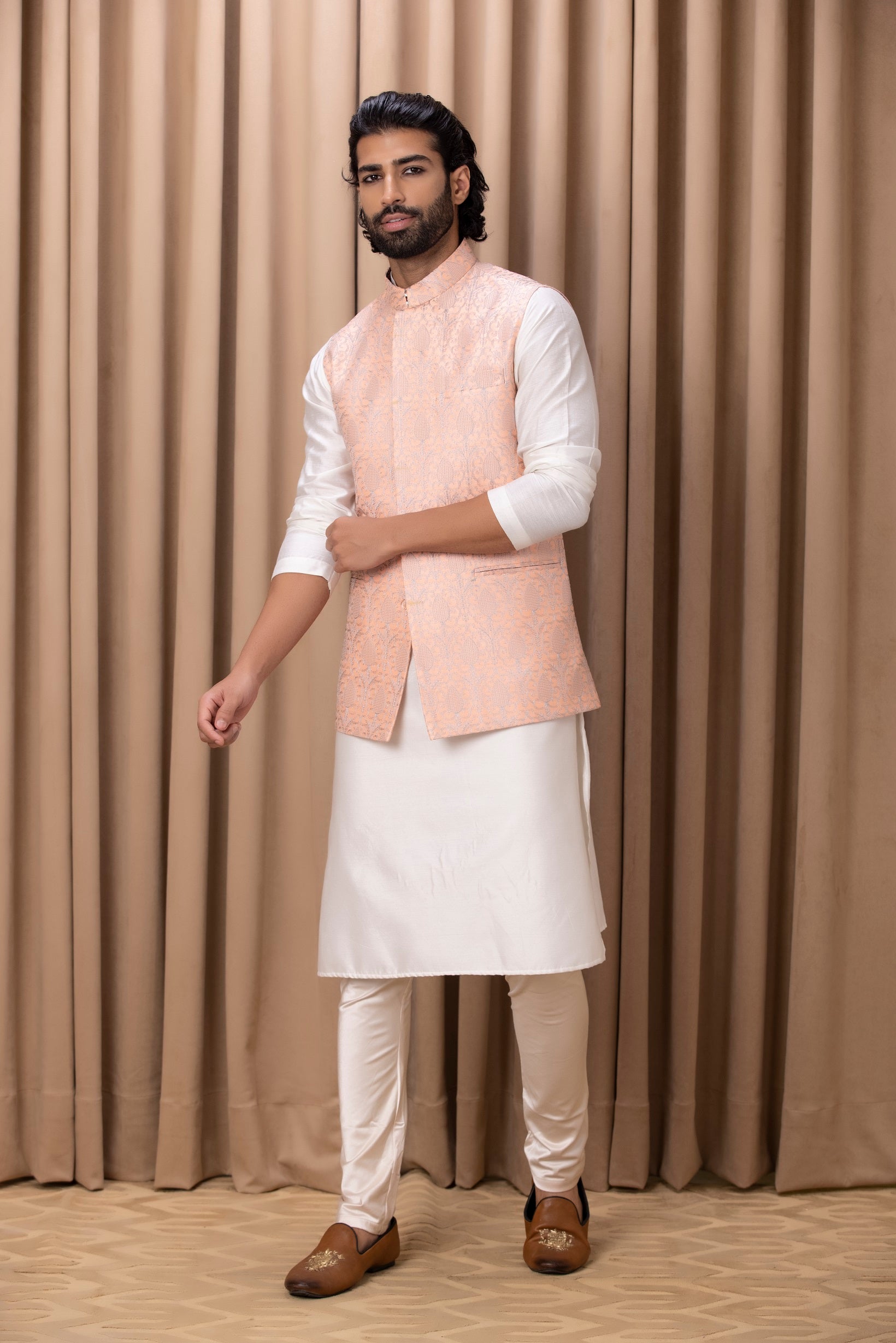| Featuring a bespoke nehru jacket set in peach color with intricate machine embroidery. Perfect for an outdoor occasion for the modern groom or groomsmen. This comes with an ivory classic kurta churidaar |