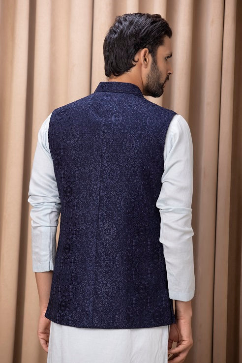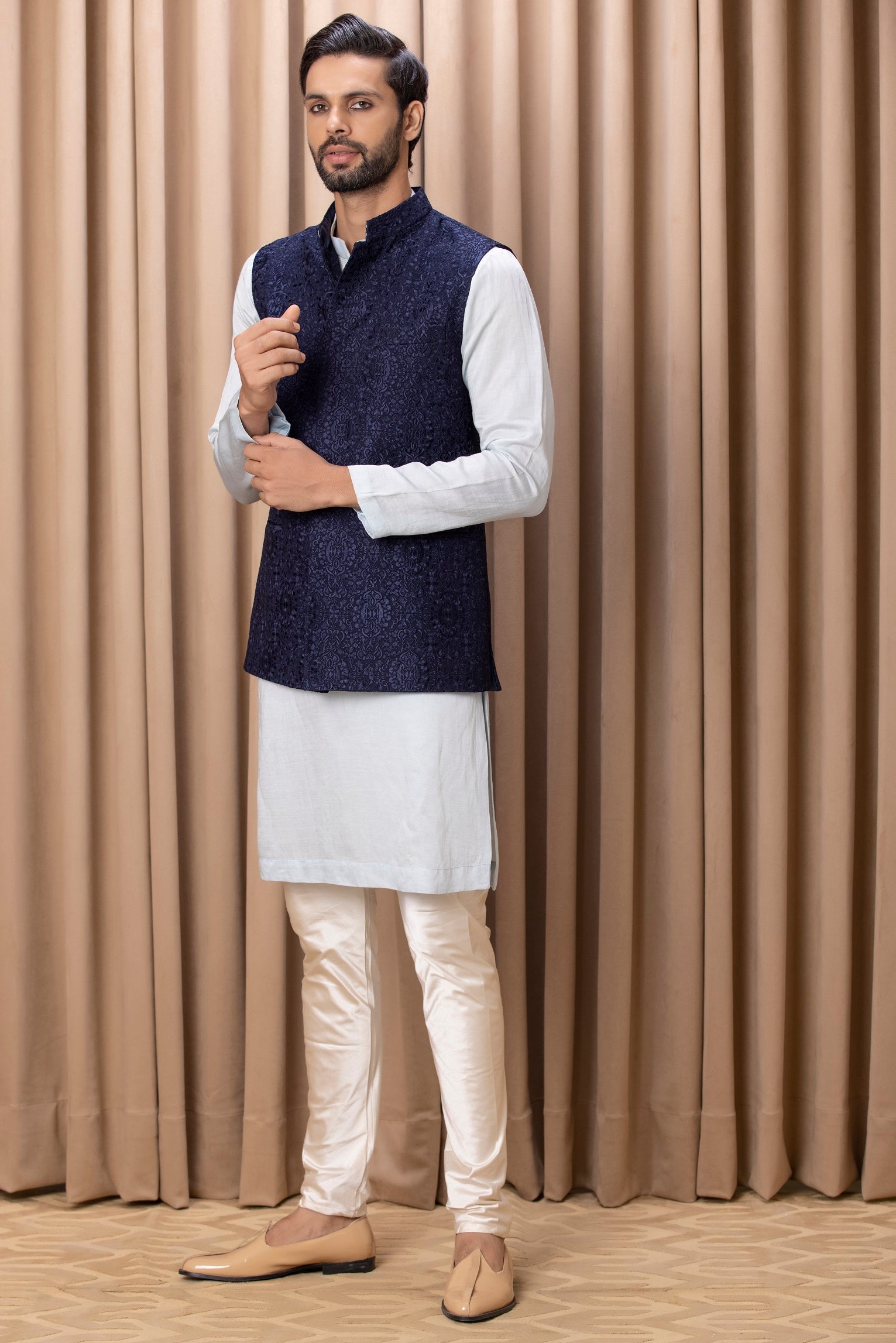 | Featuring a bespoke thread work navy blue nehru jacket with delicate thread embroidery and minimal details. Perfect for an outdoor occcasion. This not include with a plain powder blue cotton silk kurta and ivory churidaar. |