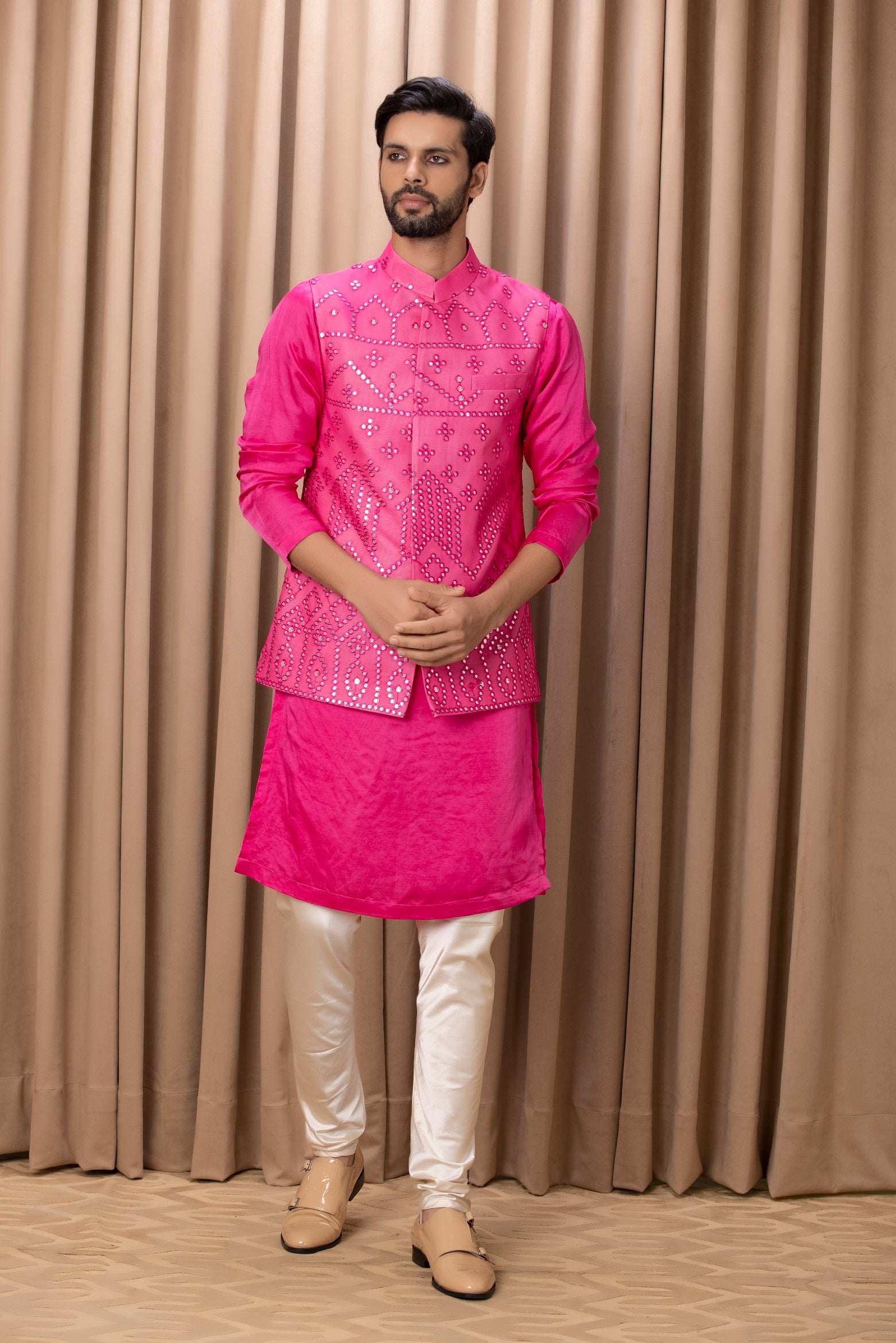 | Featuring a traditional mirror work hot pink nehru jacket with delicate thread and mirror embroidery and minimal details. Perfect for an outdoor occcasion. This comes with a tonal hot pink cotton silk kurta and churidaar. |