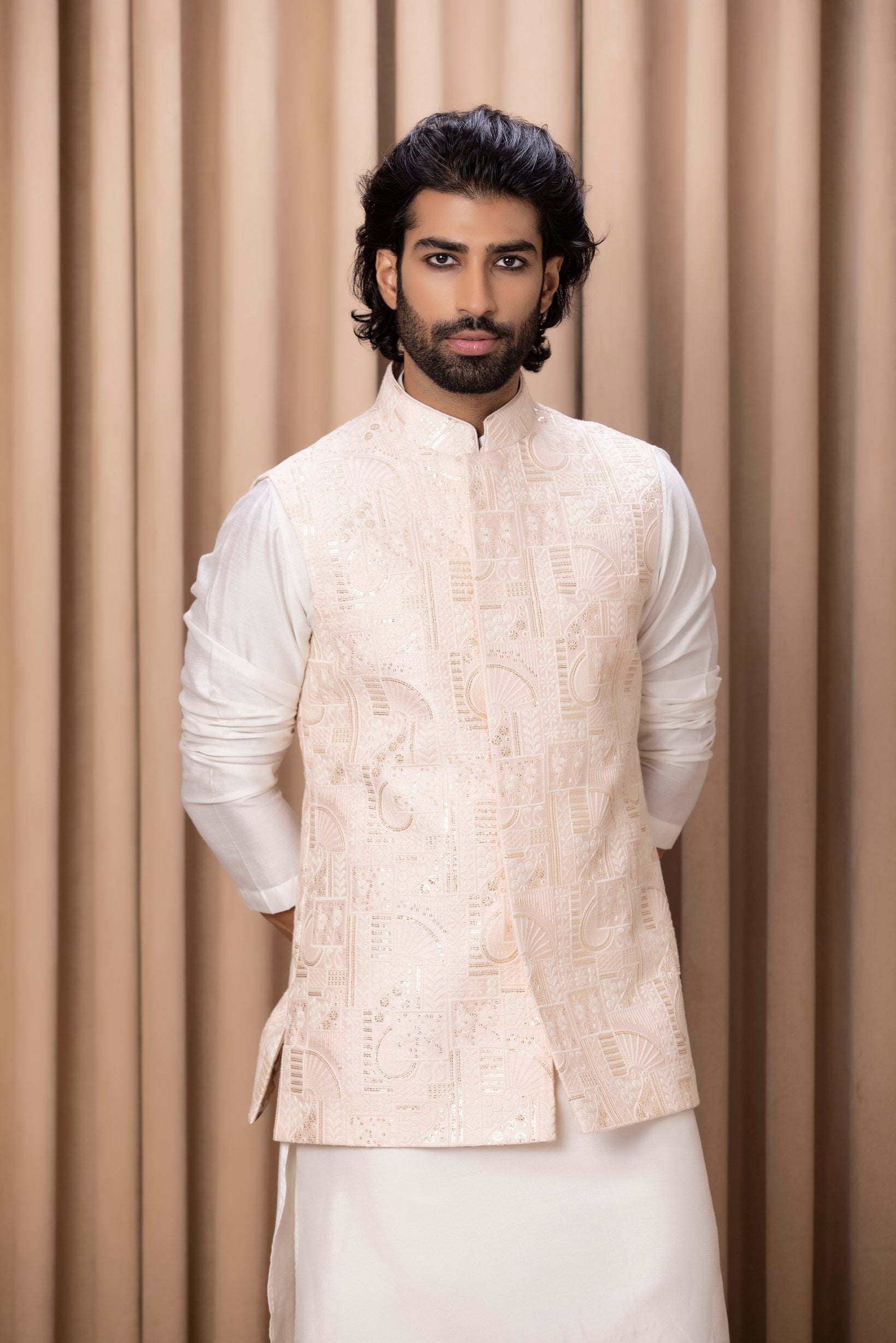 | Featuring a bespoke powder pink nehru jacket with elegant thread and sequence embroidery with minimal details. Perfect for any indoor or outdoor occasion.This comes with Ankit V Kapoor's ivory Kurta Set |
