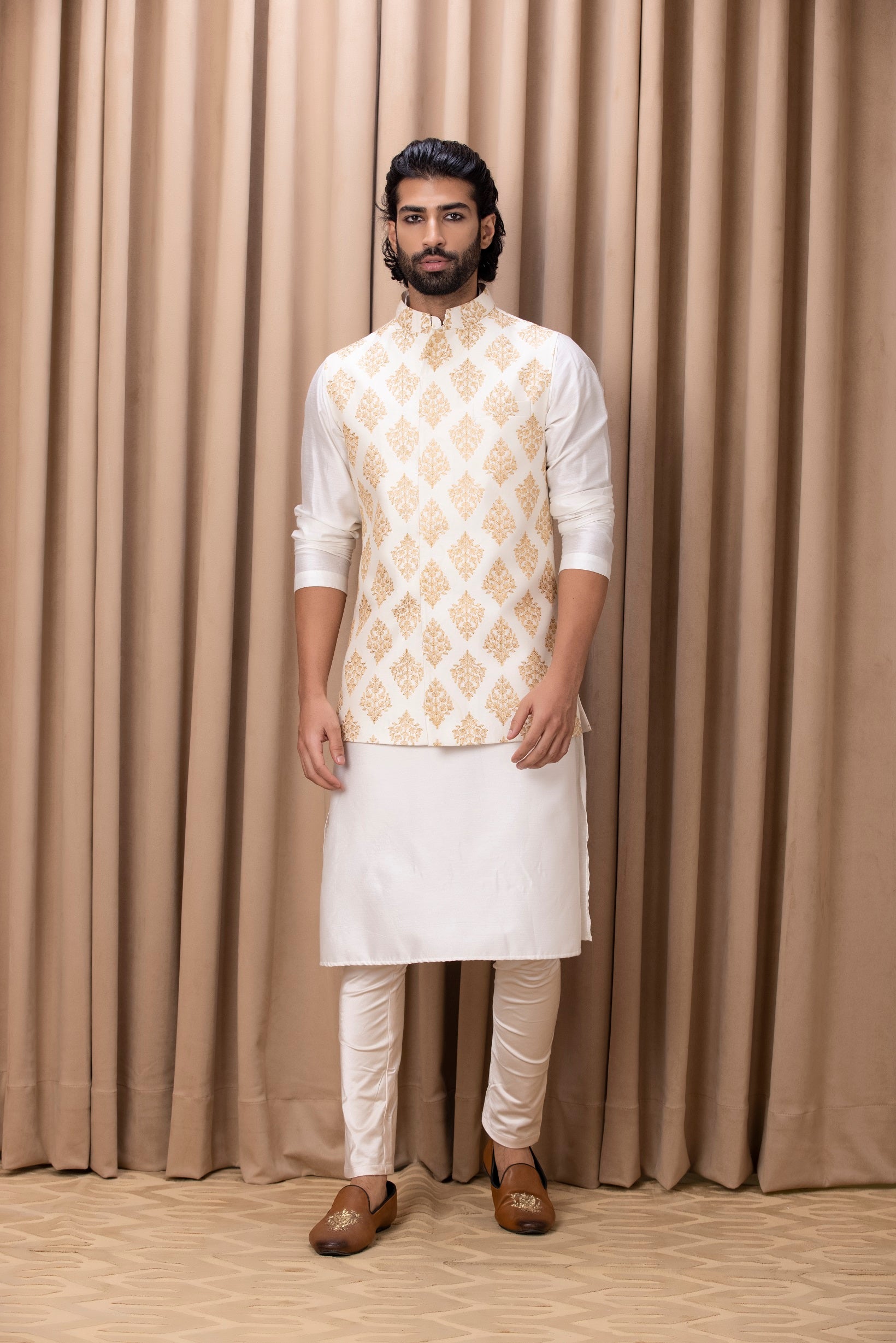 | Featuring a bespoke cotton silk ivory nehru jacket with intricate machine embroidery and minimal detalis. Perfect for any indoor or outdoor occasion. This comes with Ankit V Kapoor's ivory Kurta Set |