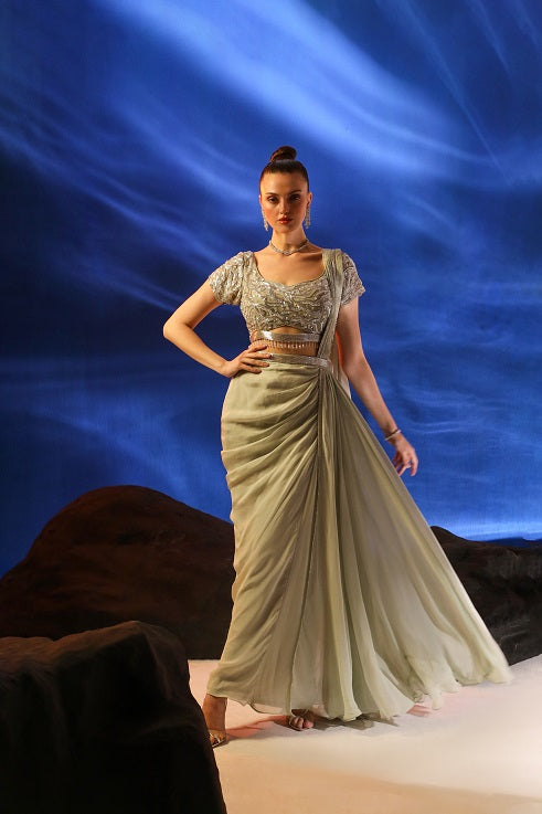 | A light sage-green hued ensmble that reflects beauty in all its glory, the Nerisaa Saree. A harmonious pair of classic short sleeved blouse and smartly side pleated drape saree, it is an understated ensemble that makes a subtle statement. |