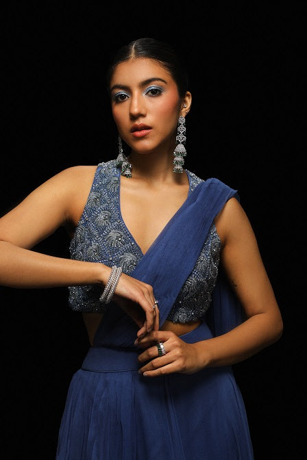 | Nocturne is a drape saree with two layers of drape falling from the sides. Blouse is highlighted with hand embroidered with celestial motifs and has soft 'V' neckline. |