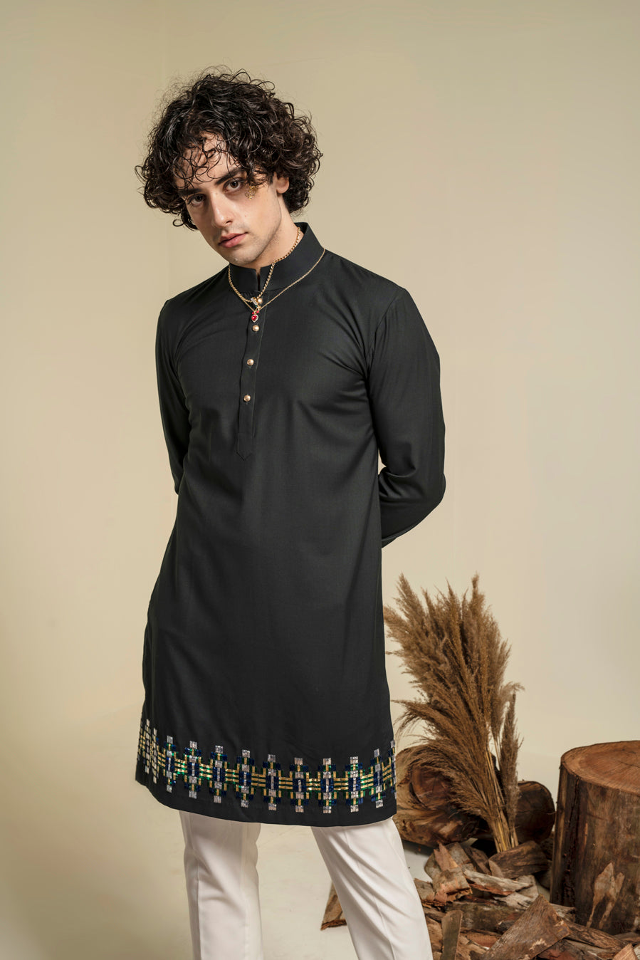 Featuring an olive green kurta in terry rayon base with hand embroidery. It is paired with contrasting cotton modal satin pants.