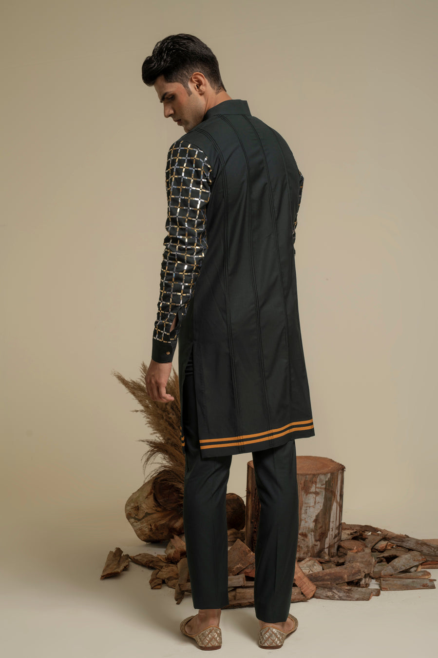 Featuring an olive green kurta in terry rayon base with sequins hand embroidery, pintucks detailing, and geometric grid patterned sleeves. It is paired with matching pants.