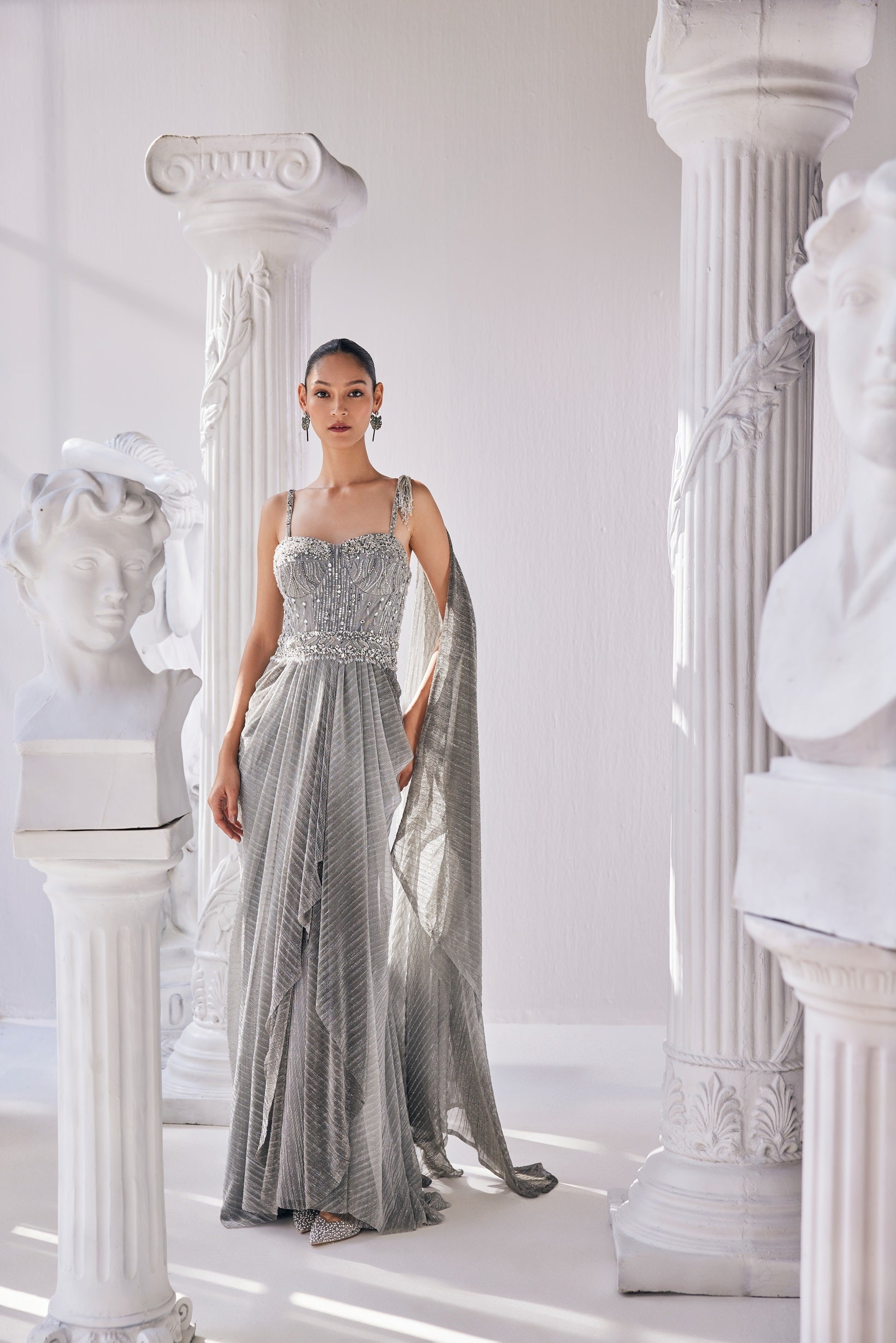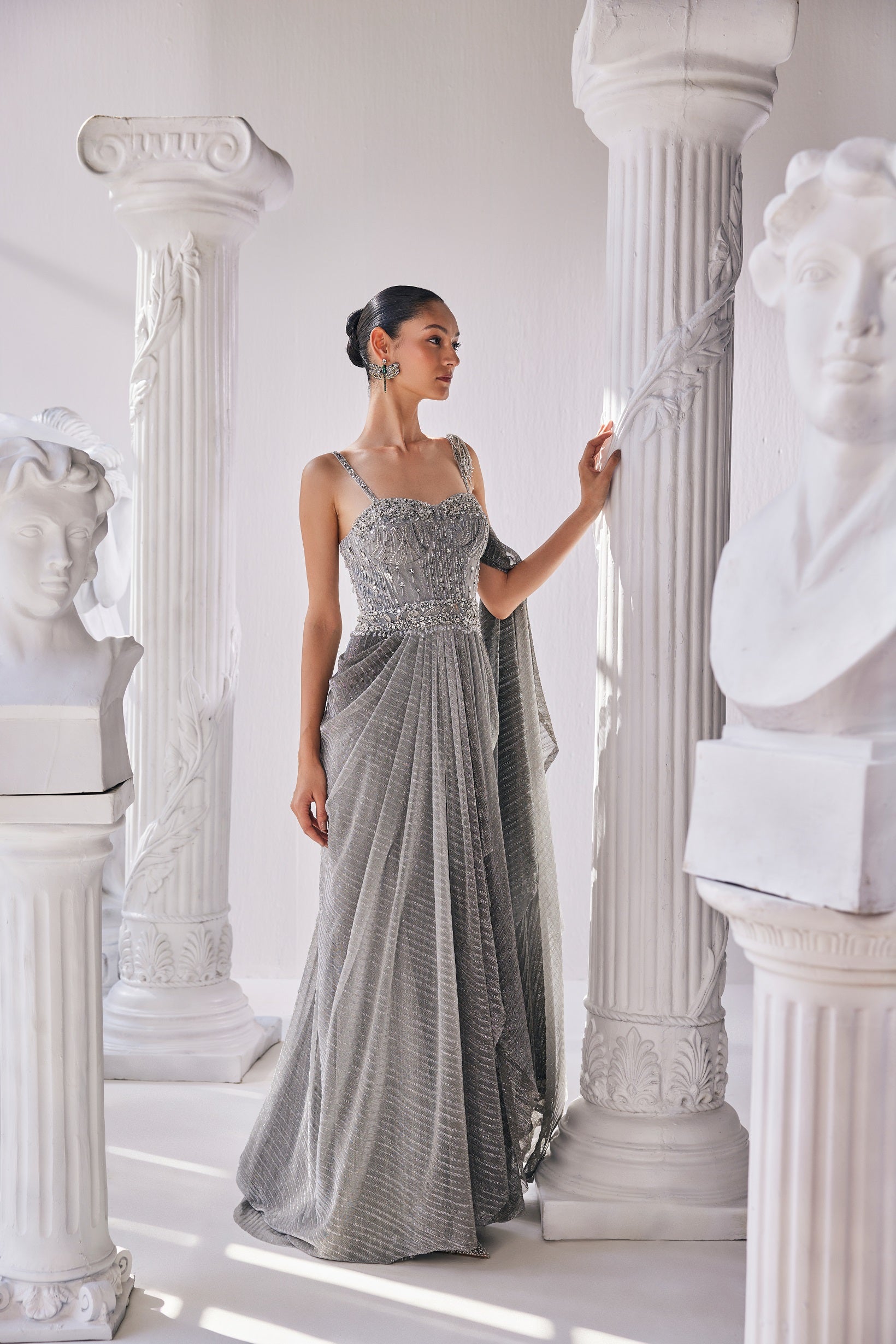 | Our mesmerizing ombre draped saree gown, crafted from luxurious metallic crinkle fabric. This exquisite ensemble features a fitted corset bodice adorned with intricate sequin and beadwork, adding a touch of glamour and sophistication. Embrace the fusion of traditional saree draping and modern gown. |