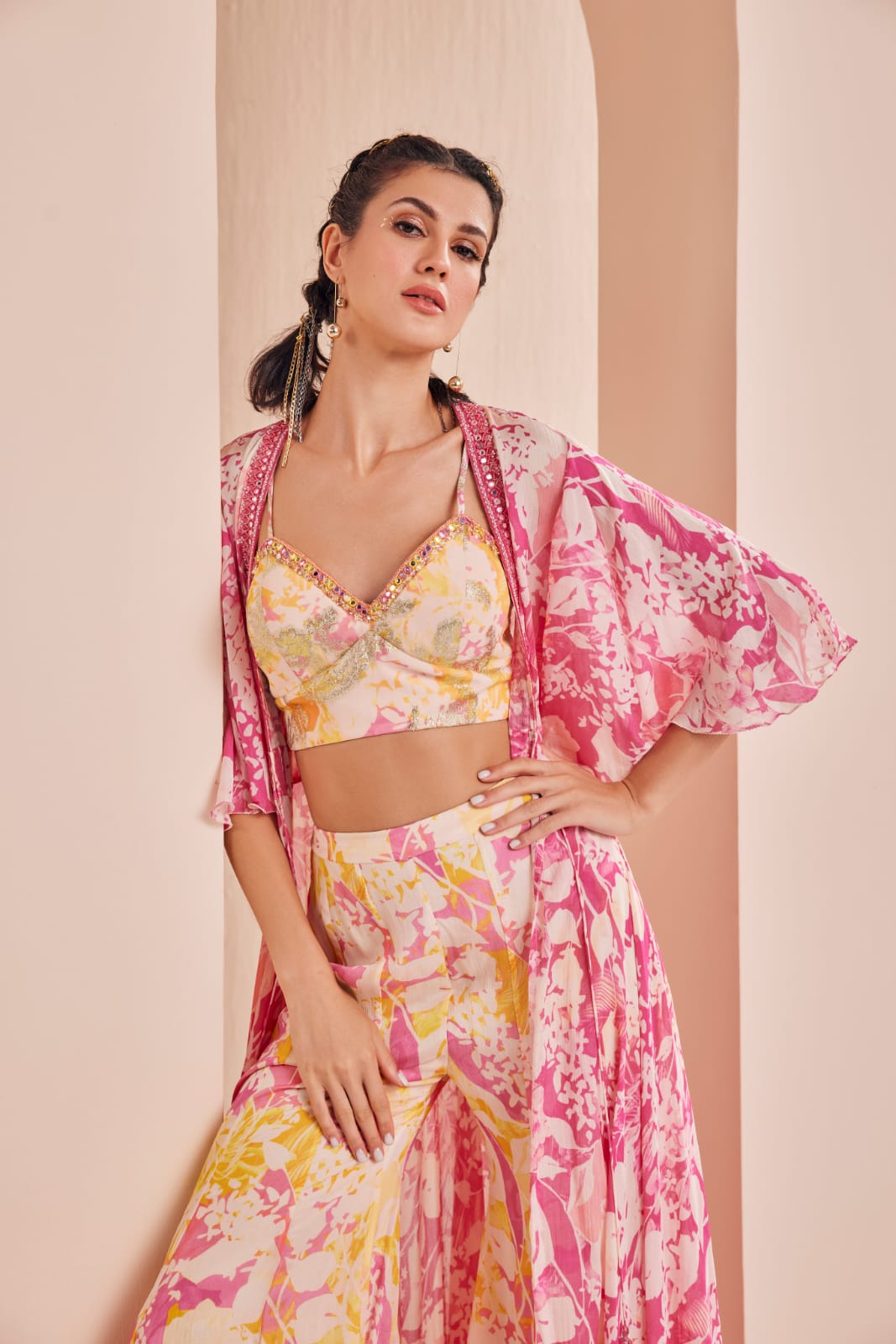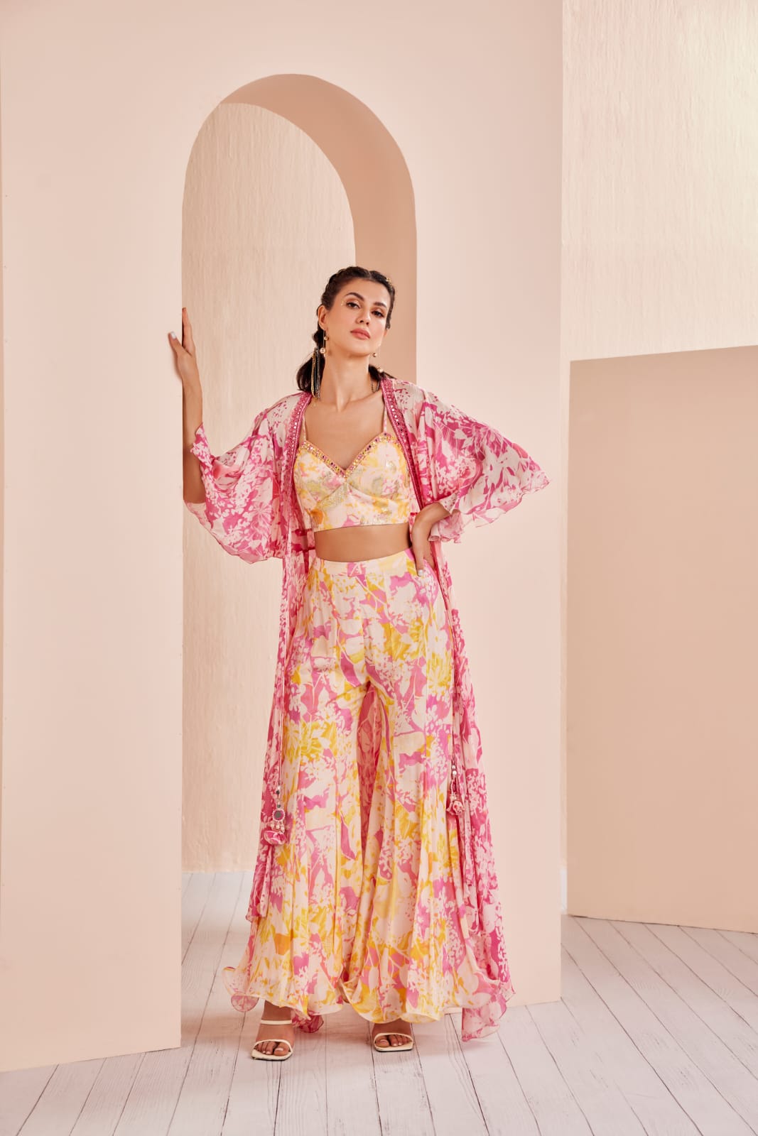 Printed blouse, sharara, cape set