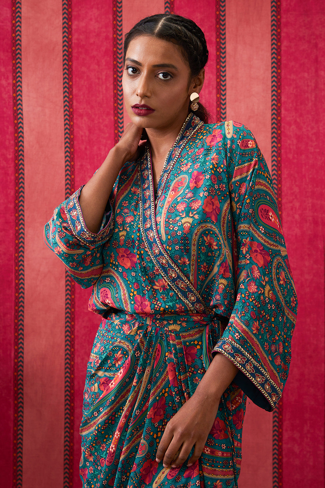 Featuring a teal green hand embroidered drape dress in crepe fabric.