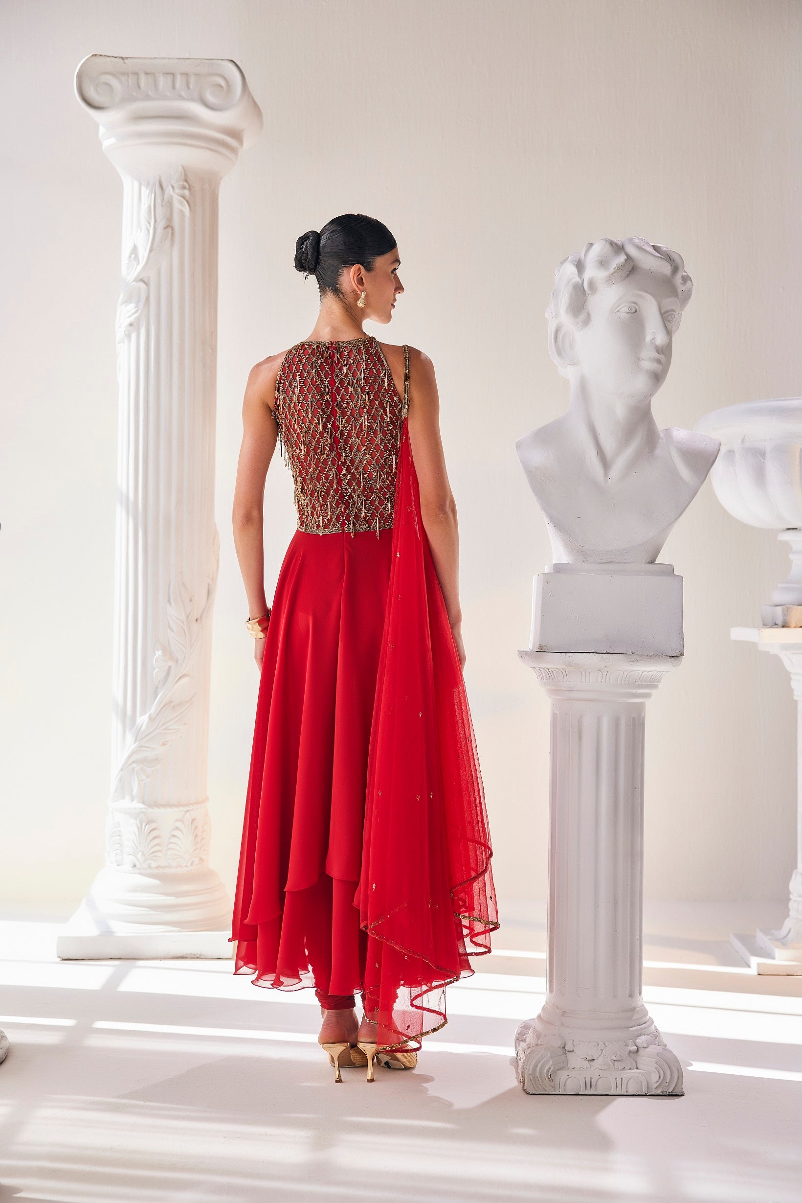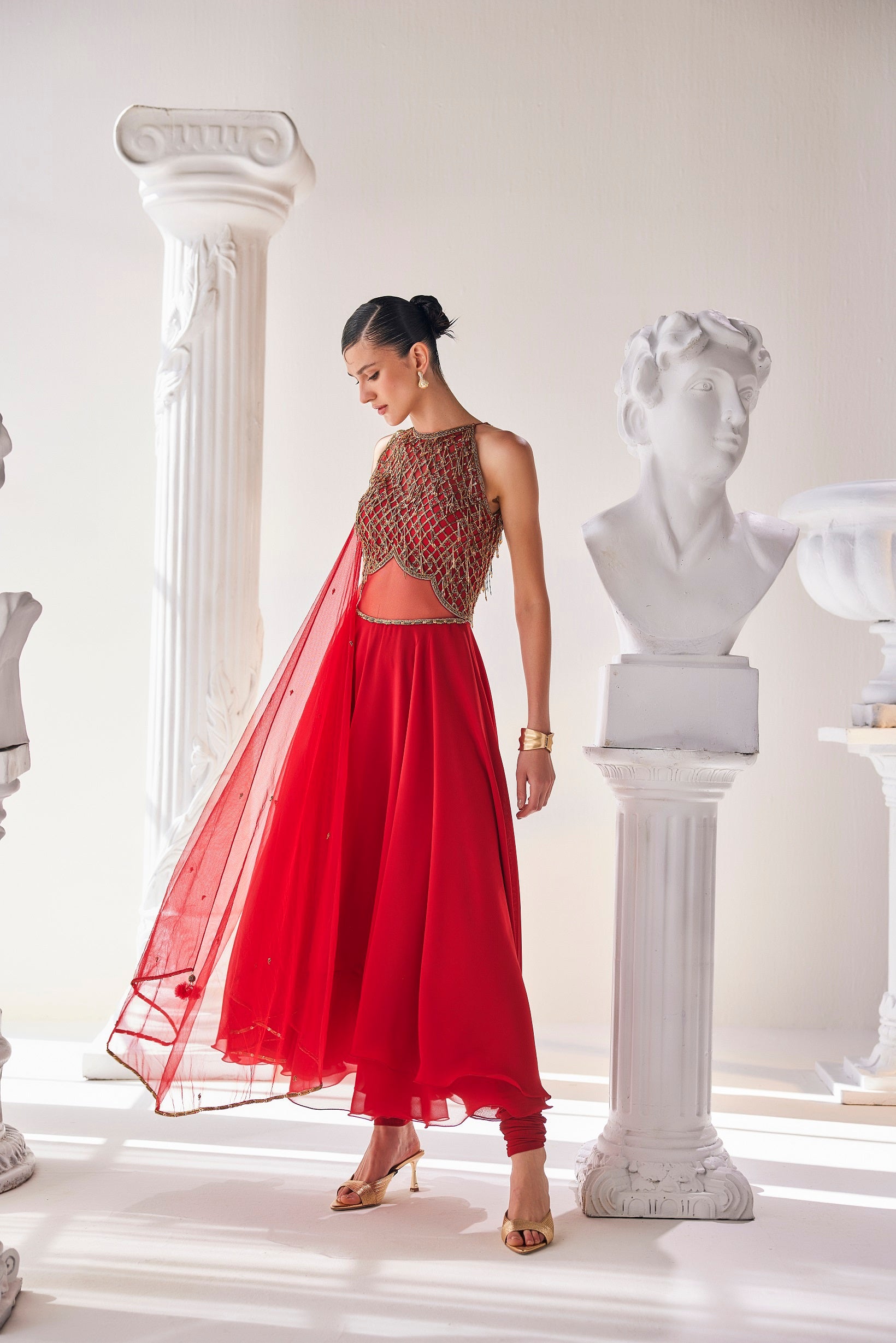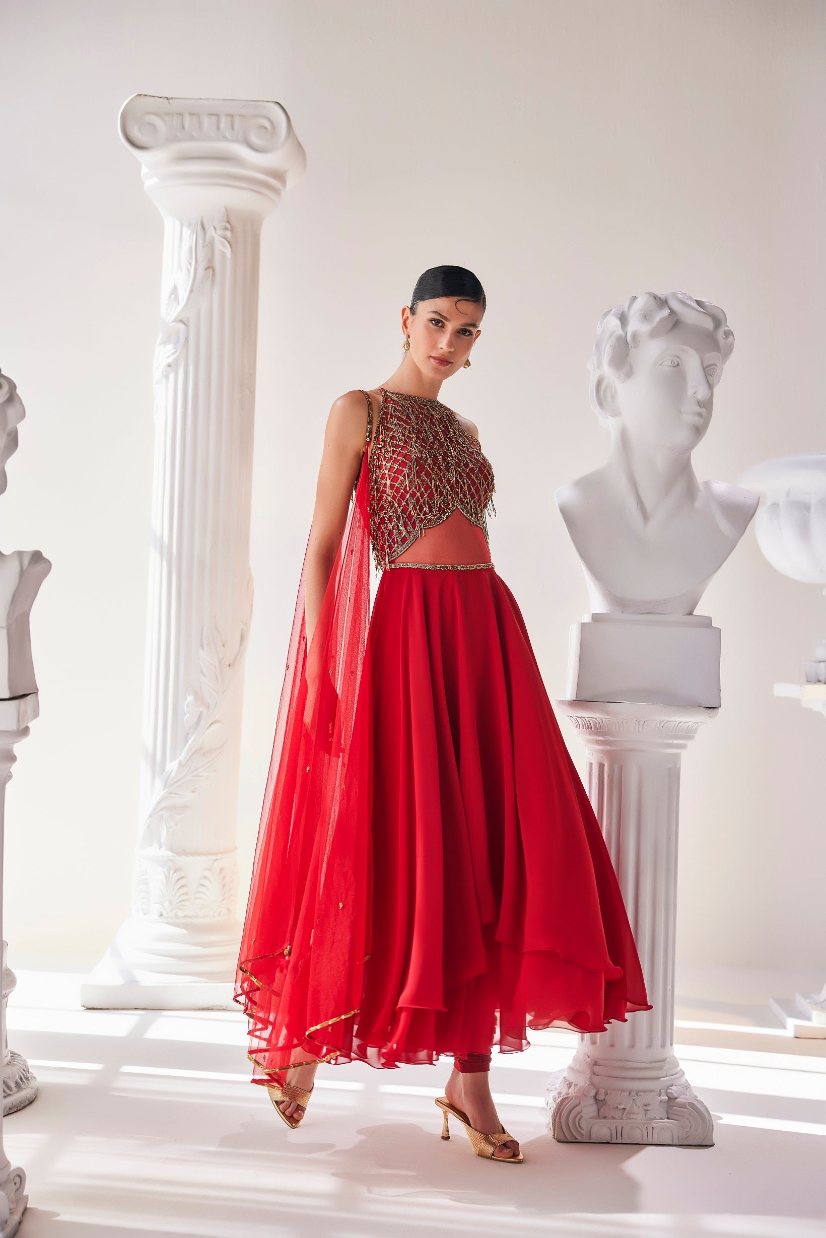 | Our captivating red georgette high-low anarkali set. It's intricately embroidered bodice exudes elegance, while the flowing silhouette adds grace. Accompanied by a matching churidar and a delicate net dupatta, this ensemble is perfect for any special occasion. |