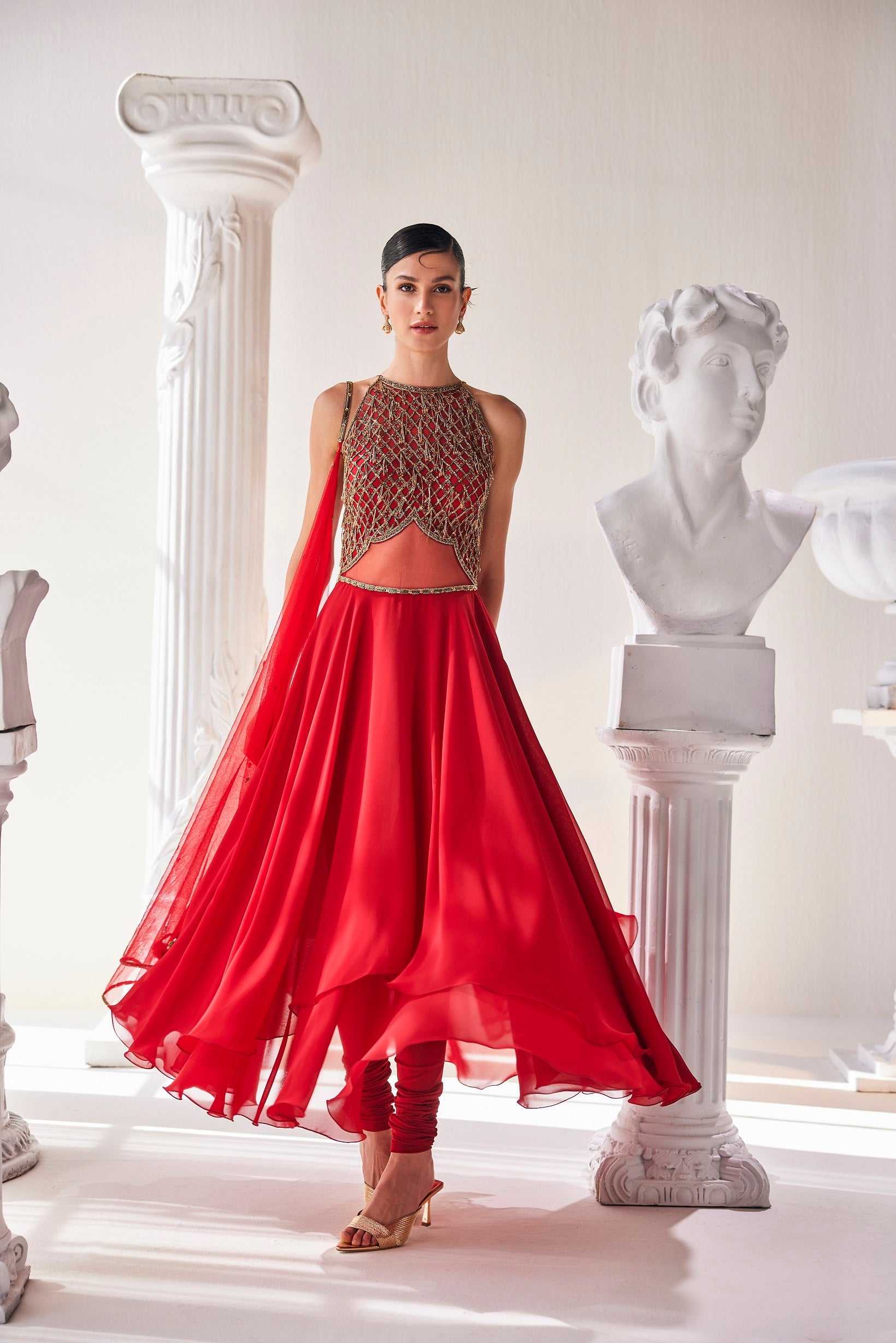 "red georgette high low anarkali designed with an emroidered bodice paired with a churidar and a net dupatta."