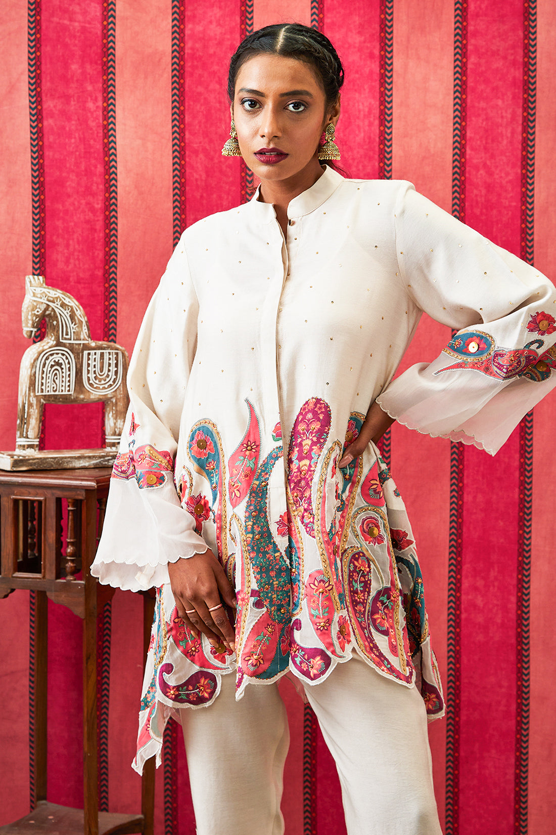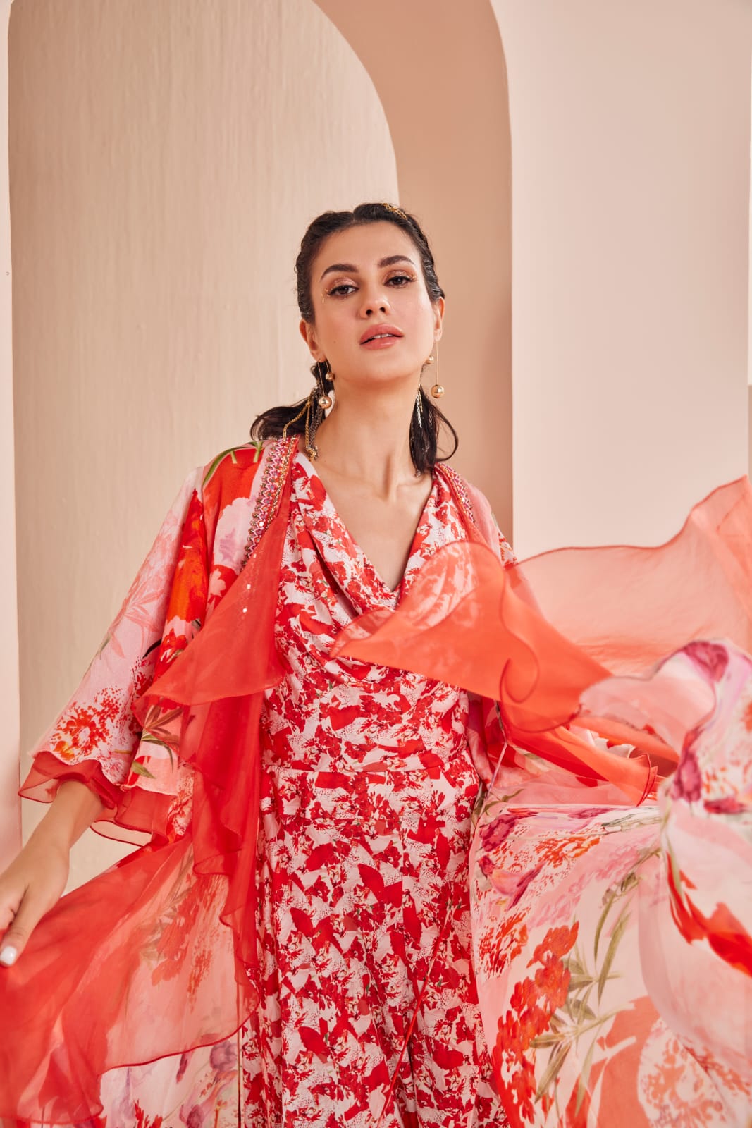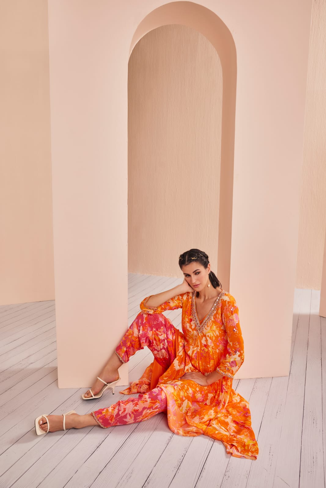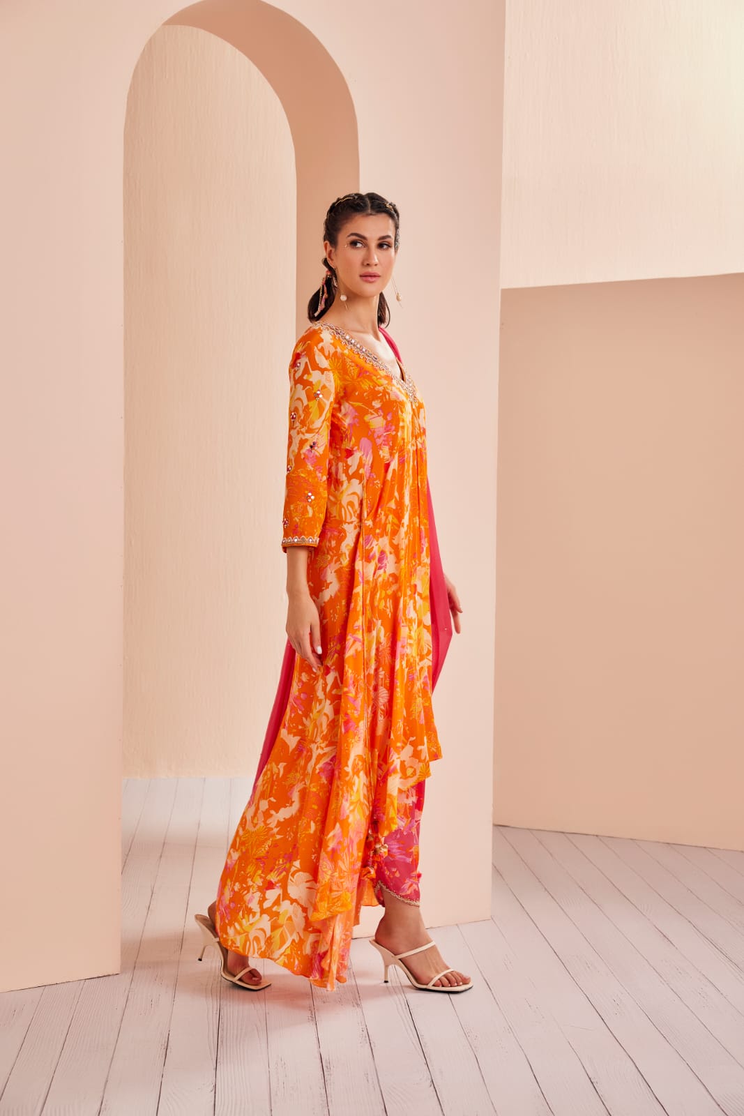 Printed crepe asymmetric embroidered tunic complimenting with dhoti and dupatta