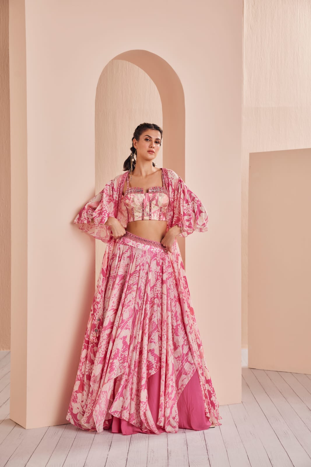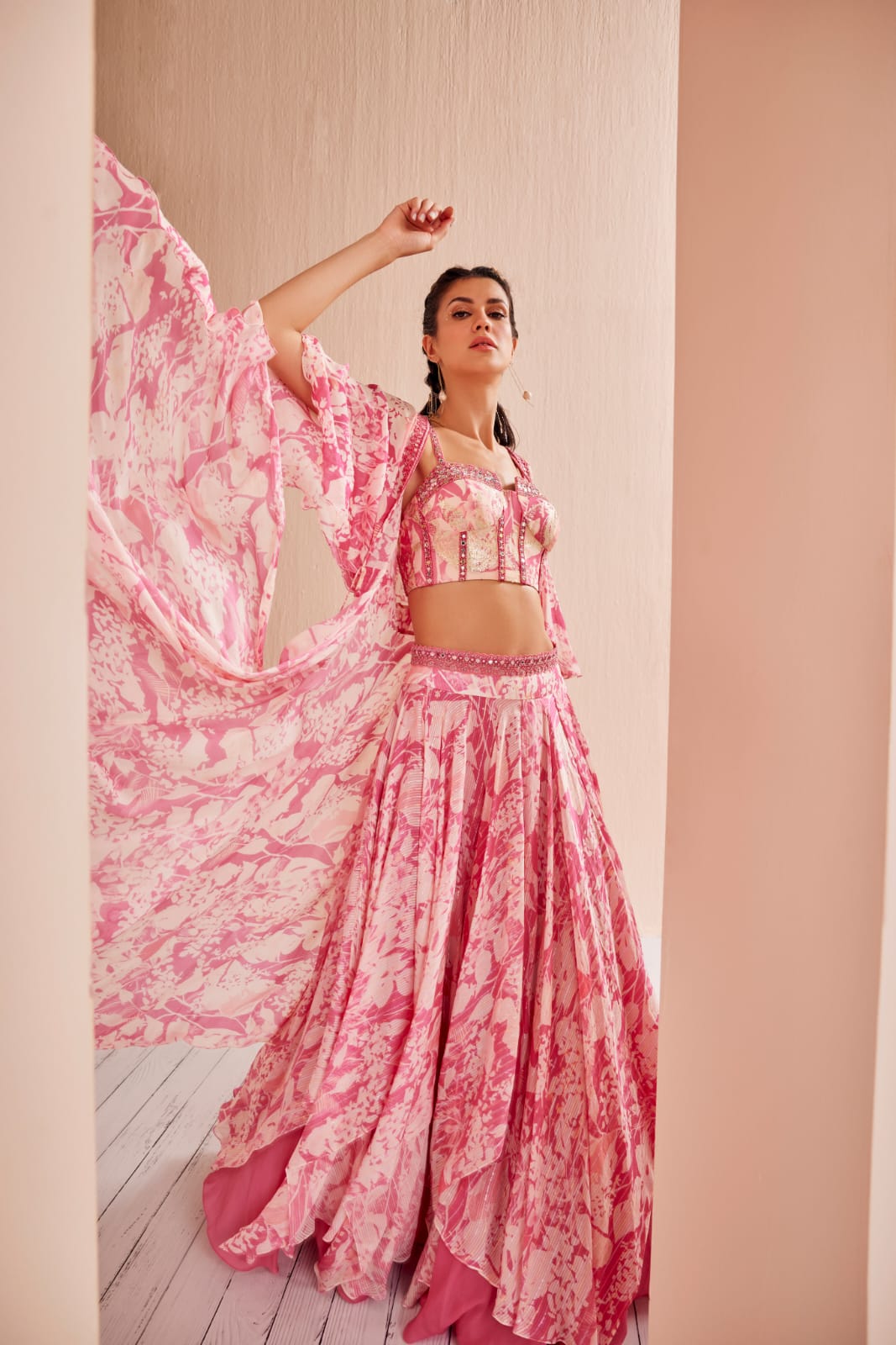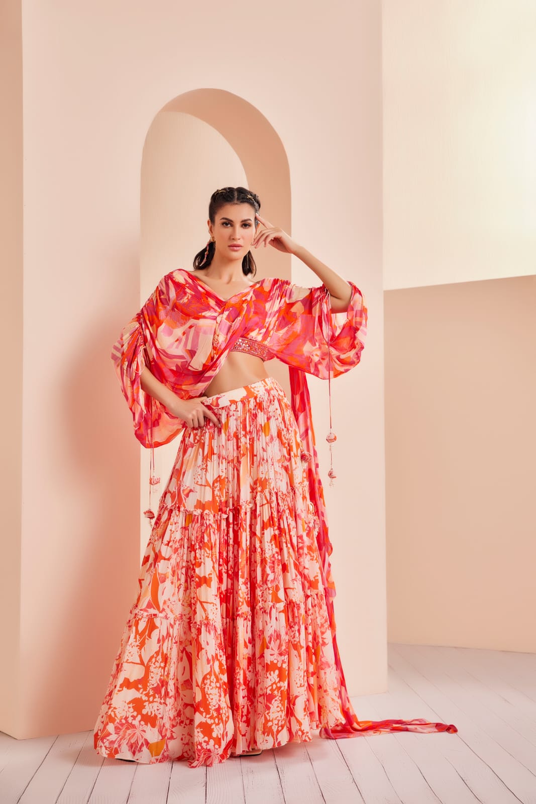 Printed chiffon lehenga with stylized draped blouse detailed rushed sleeve