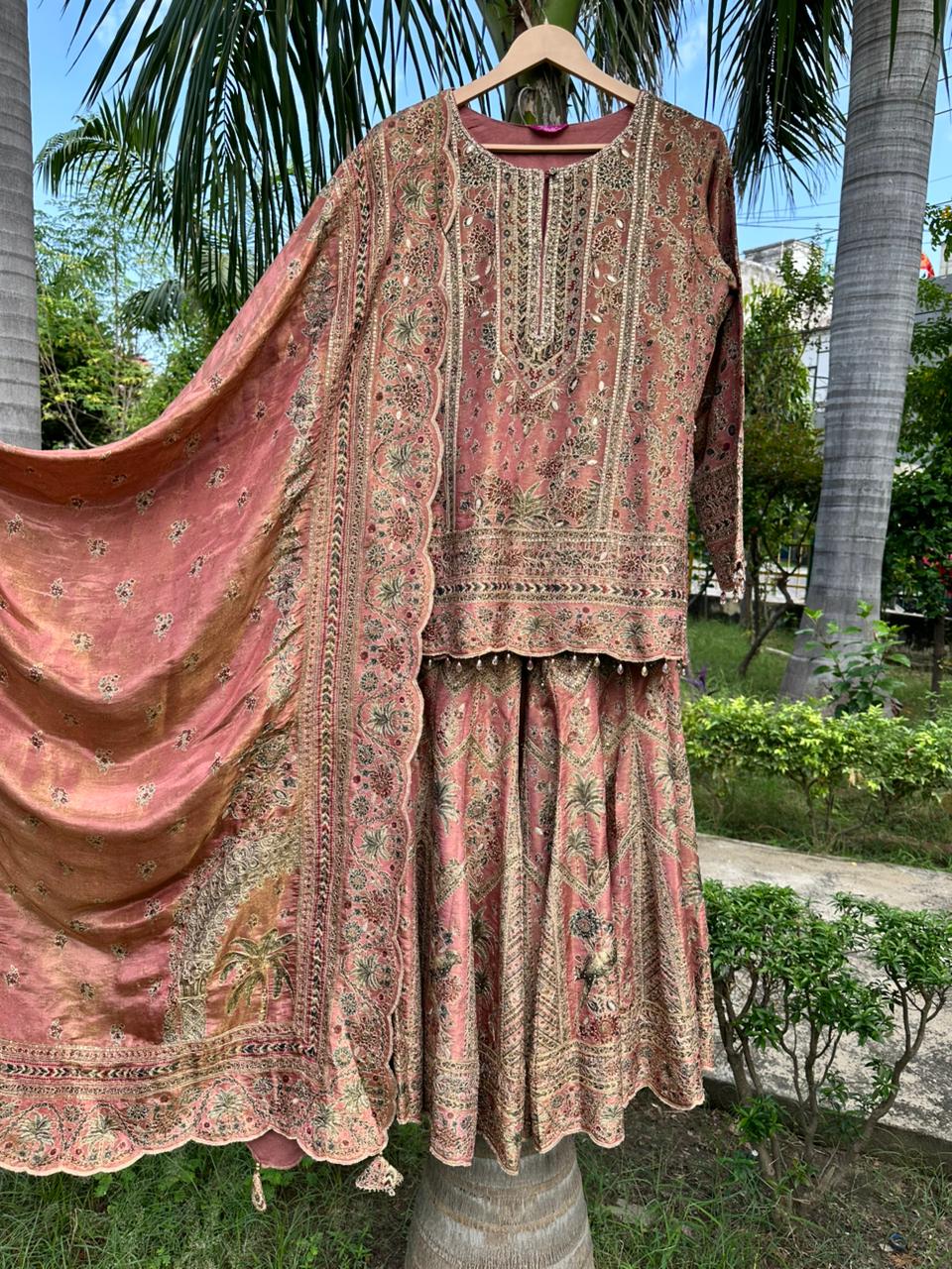 Burnt orange shimmer silk long suit with lehenga skirt