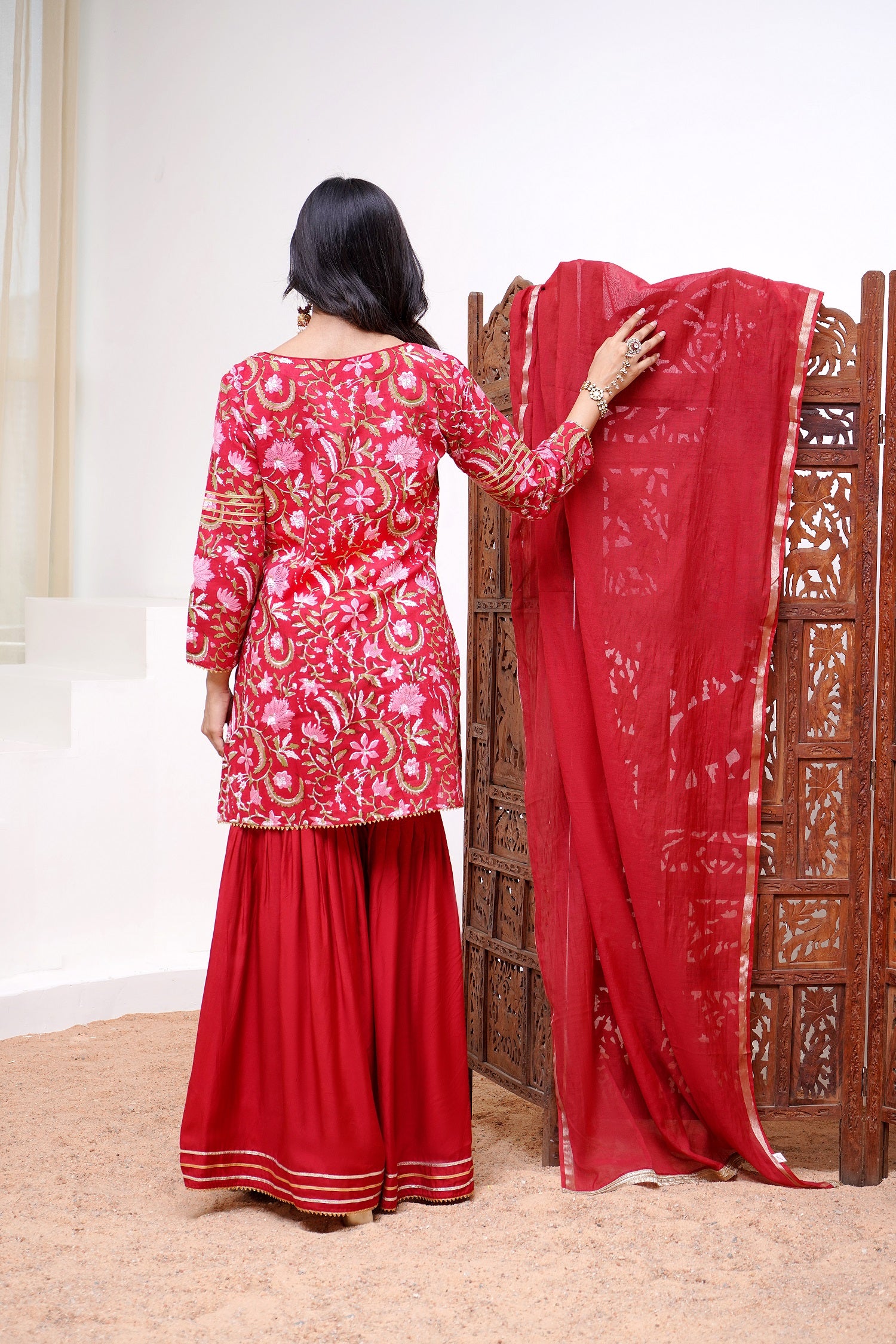 Chinon saree in blue-green tones with zari and mirror work, paired with embroidered blouse.