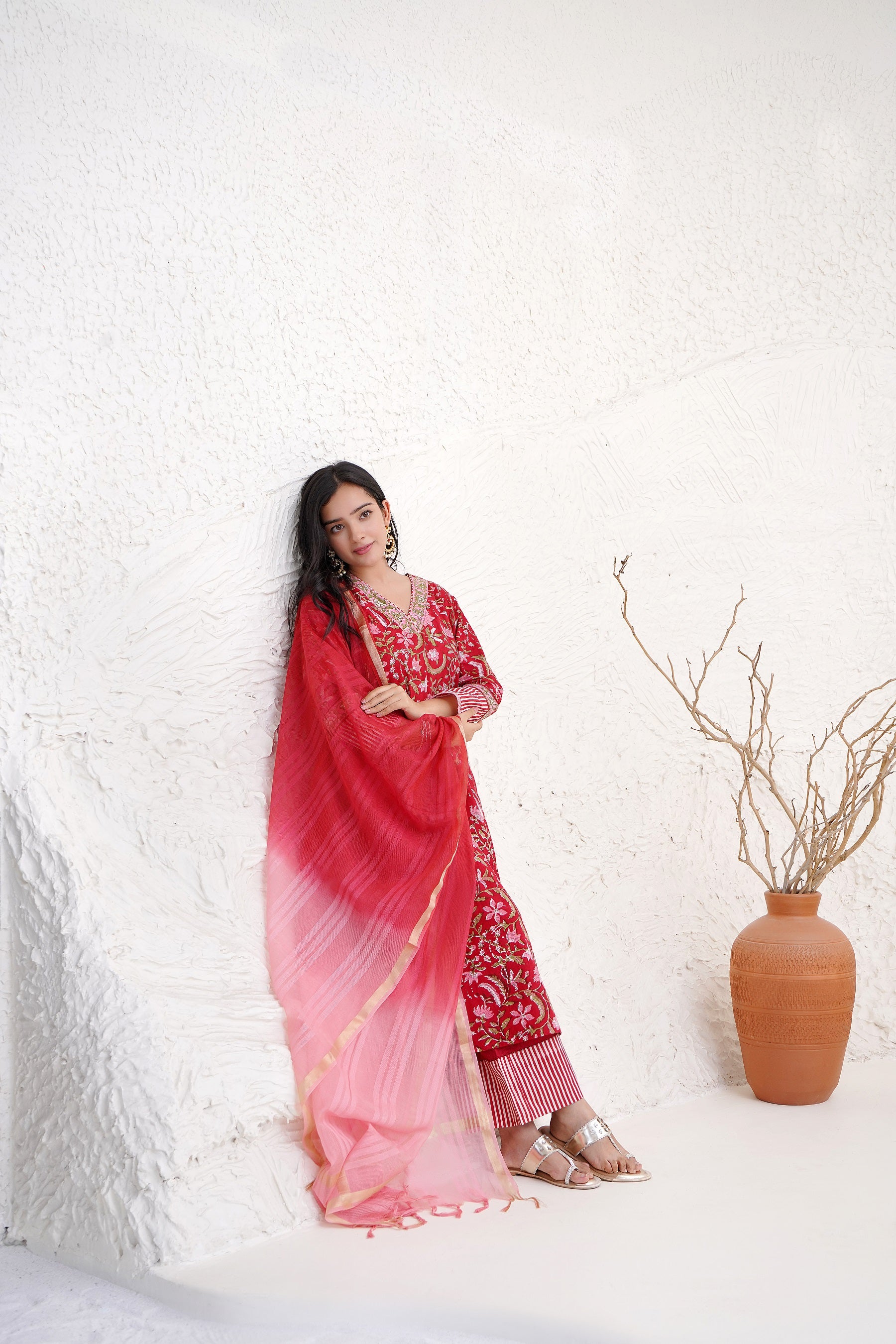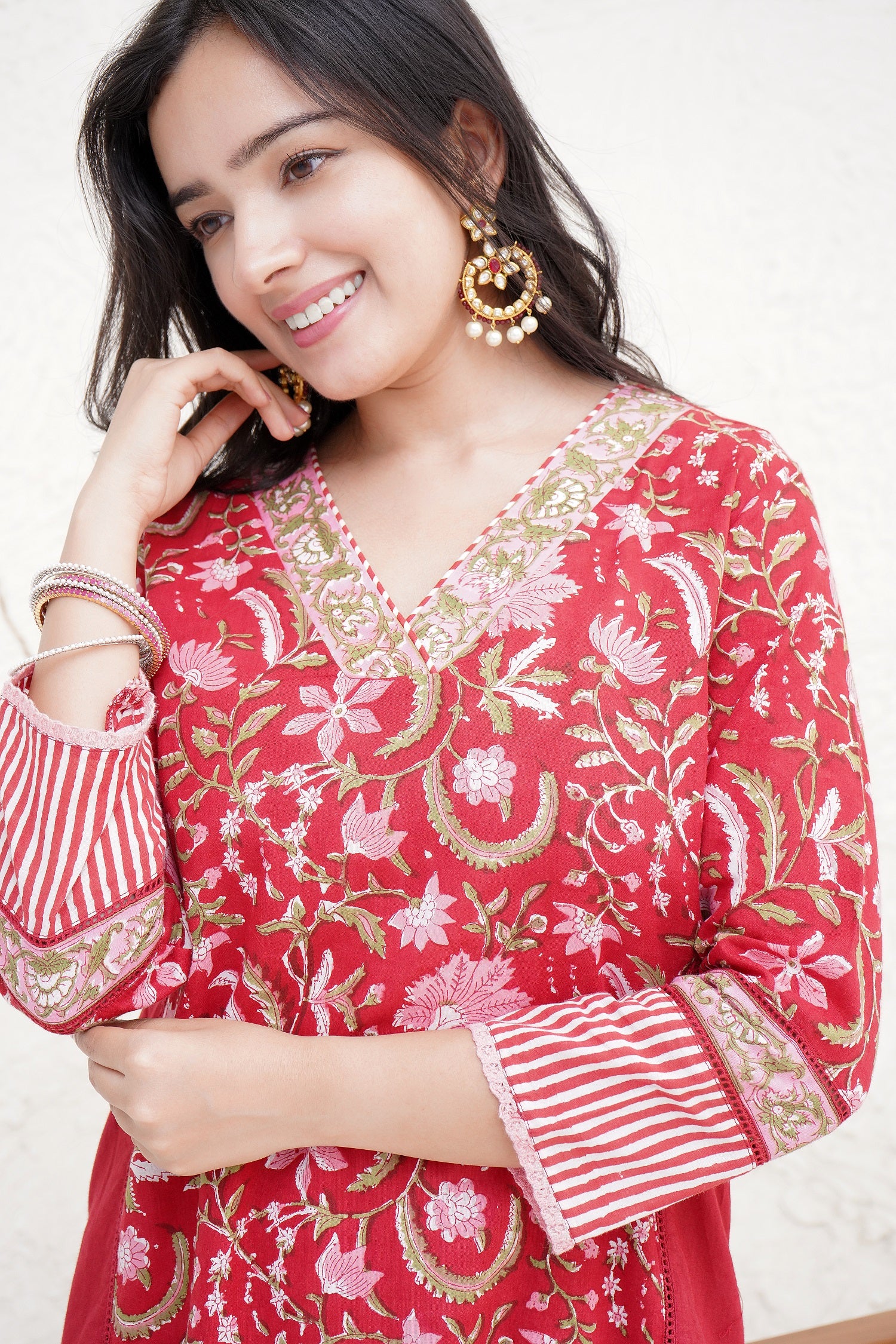 -Kurta in Crimson Red and Carnation Pink Hand Block Printed Cotton Fabric with side panels and slits adding movement.