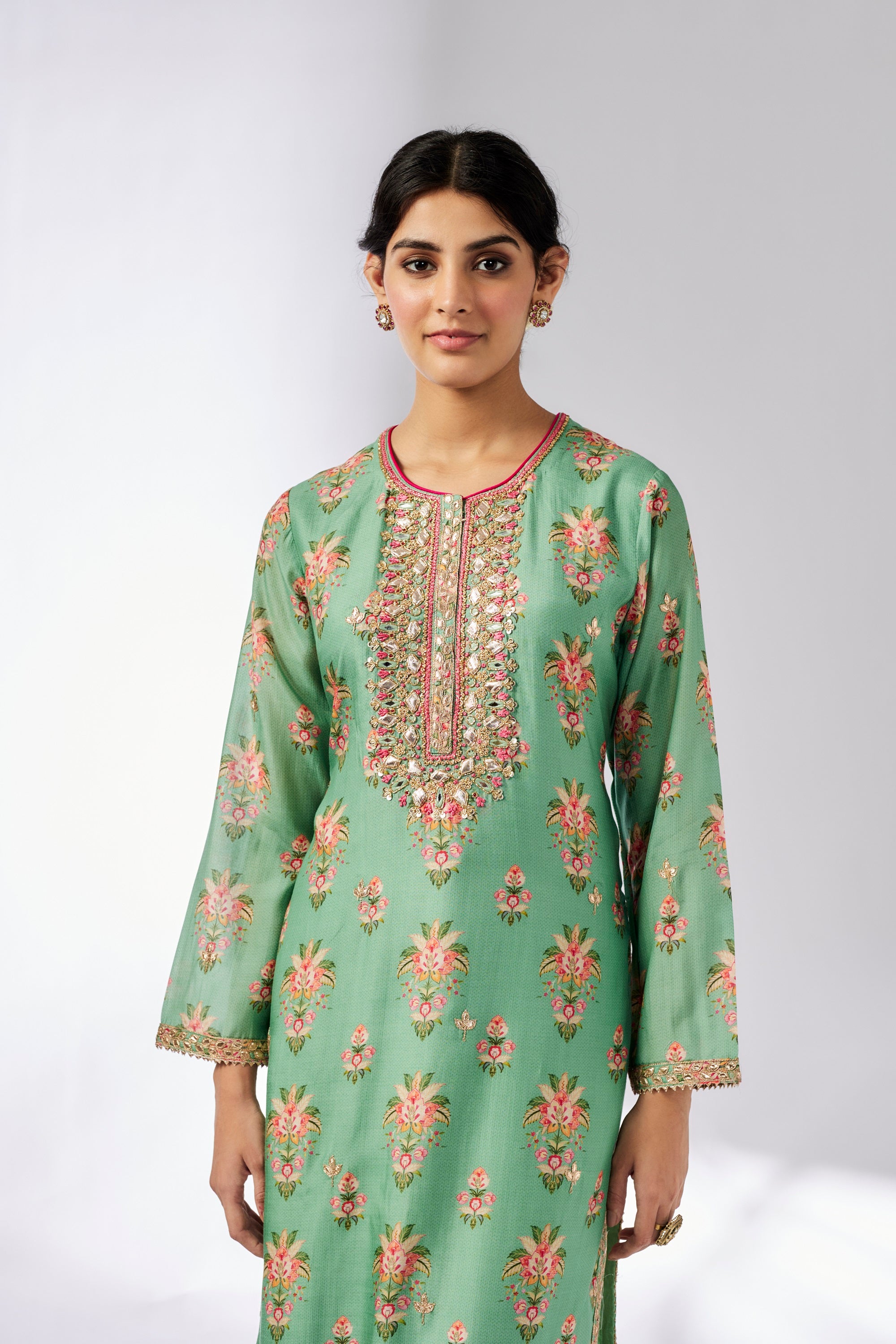 This Smart, Contemporary Collection Mixes A Strong Floral Print, All Delicately Enhanced Embroidery around the Neck . Add Shimmer And A Richness To This Pretty Ensemble. Long Sleeved Tunic Is Easy To Carry And Can Be Worn On Any Occasion.