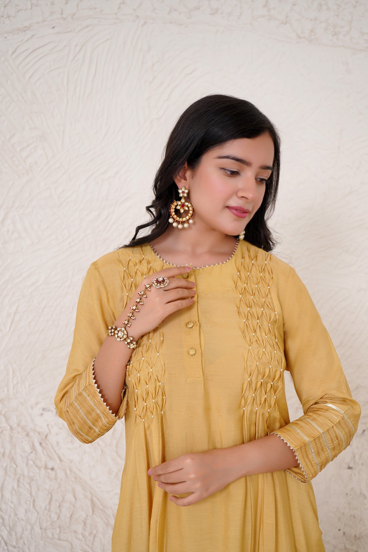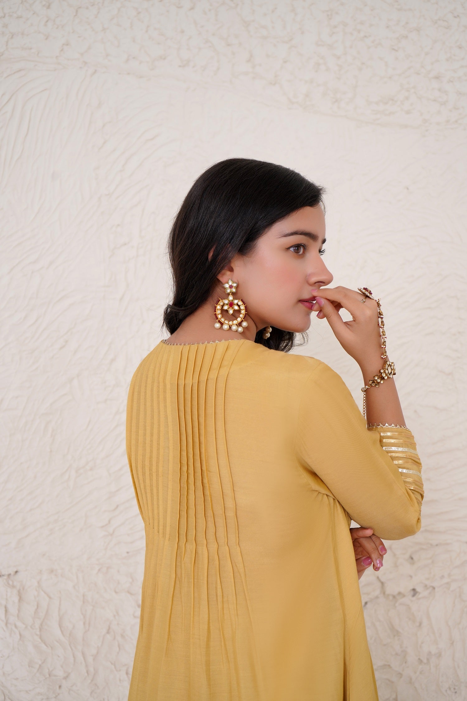 -Kurta in Gold Silky Modal Fabric with pleats and fabric manipulation adding flare to the silhouette.